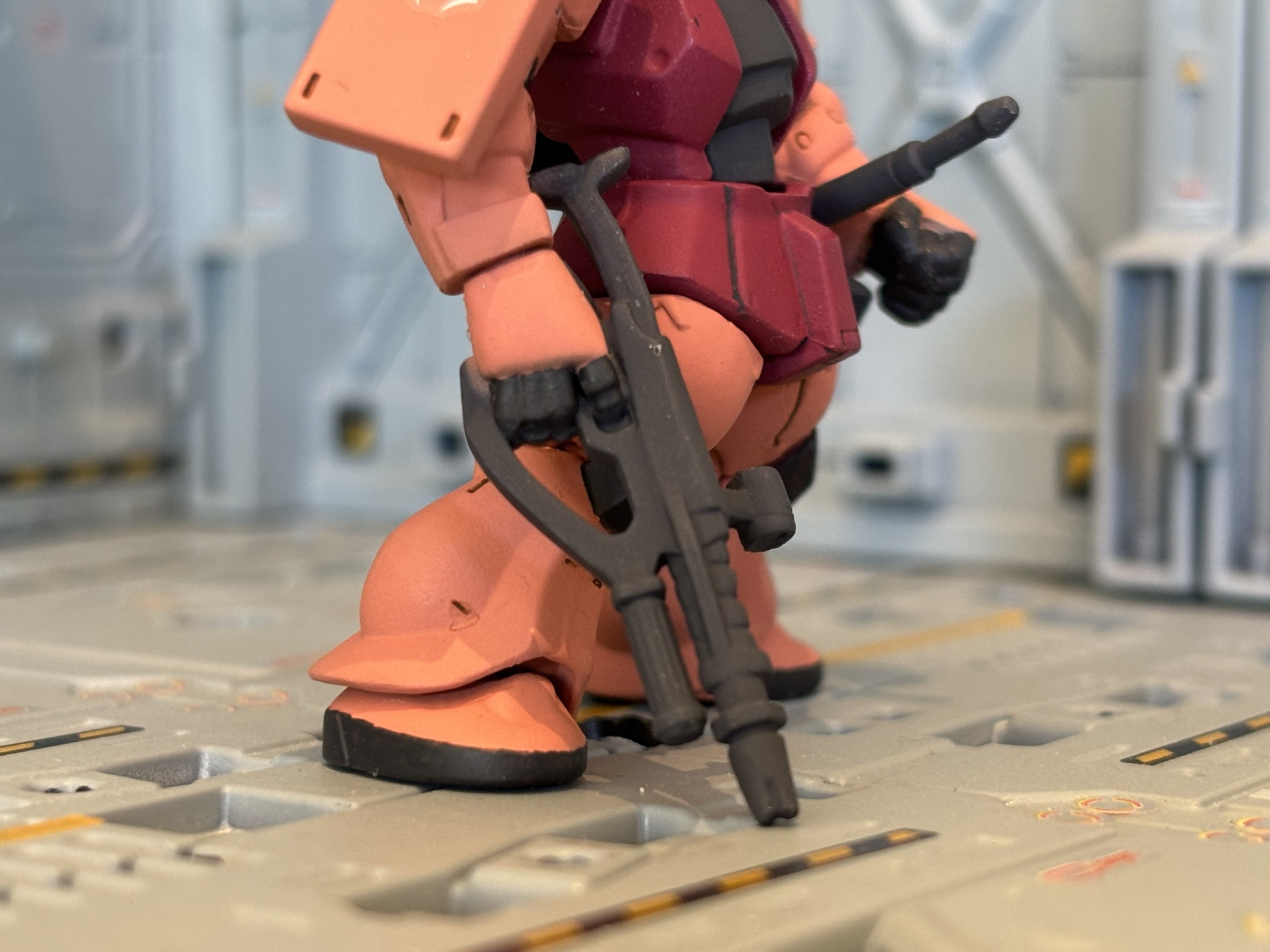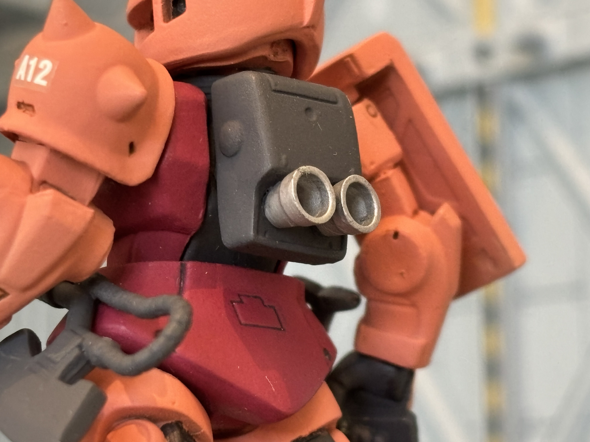 この頃のザクマシンガンは、マガジン給弾ではなく、給弾ベルト方式だったみたいで、マガジンは切除。給弾ベルトまではさすがに再現できませんでした…