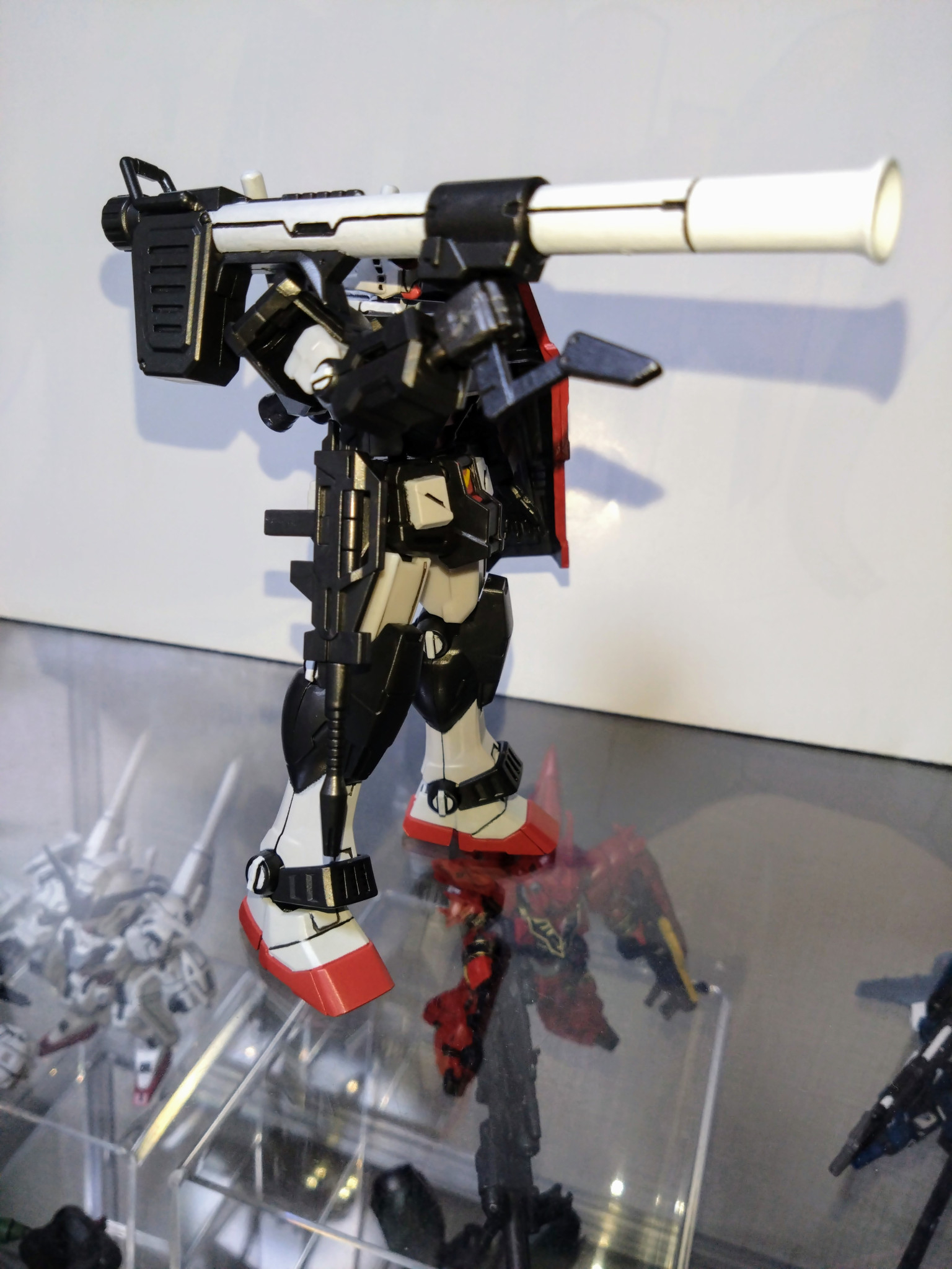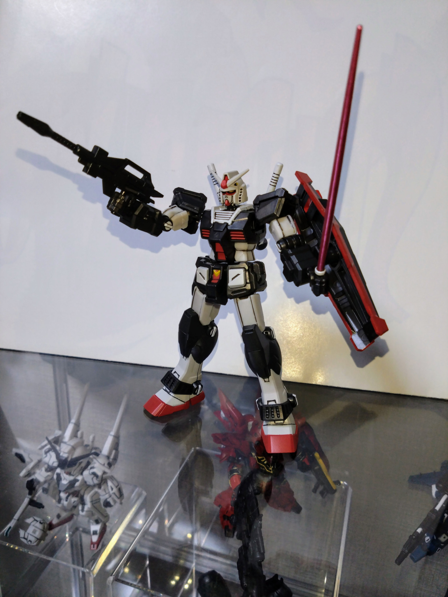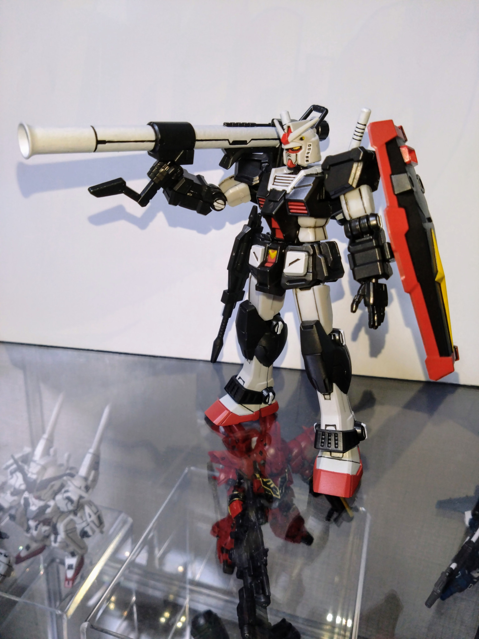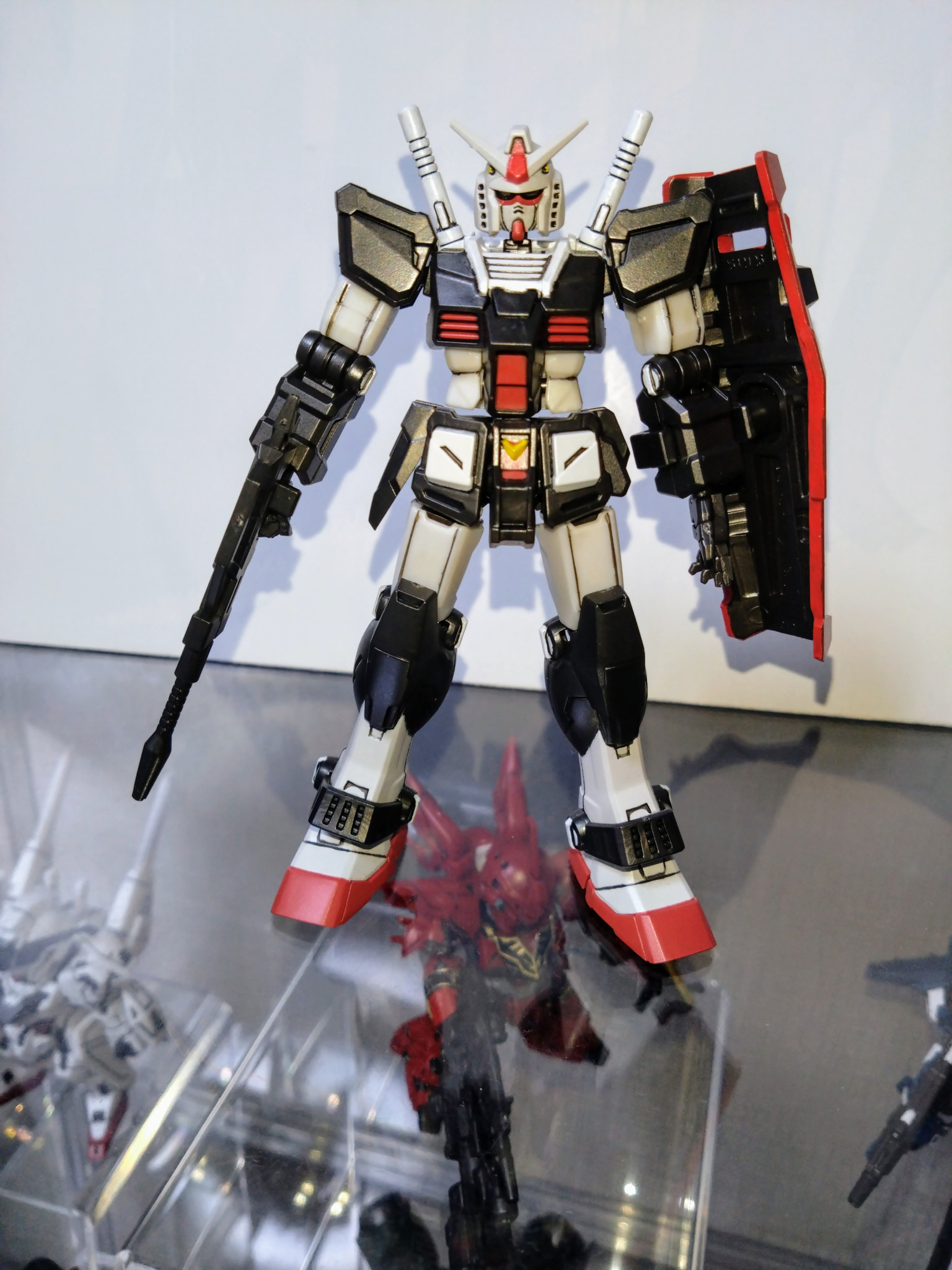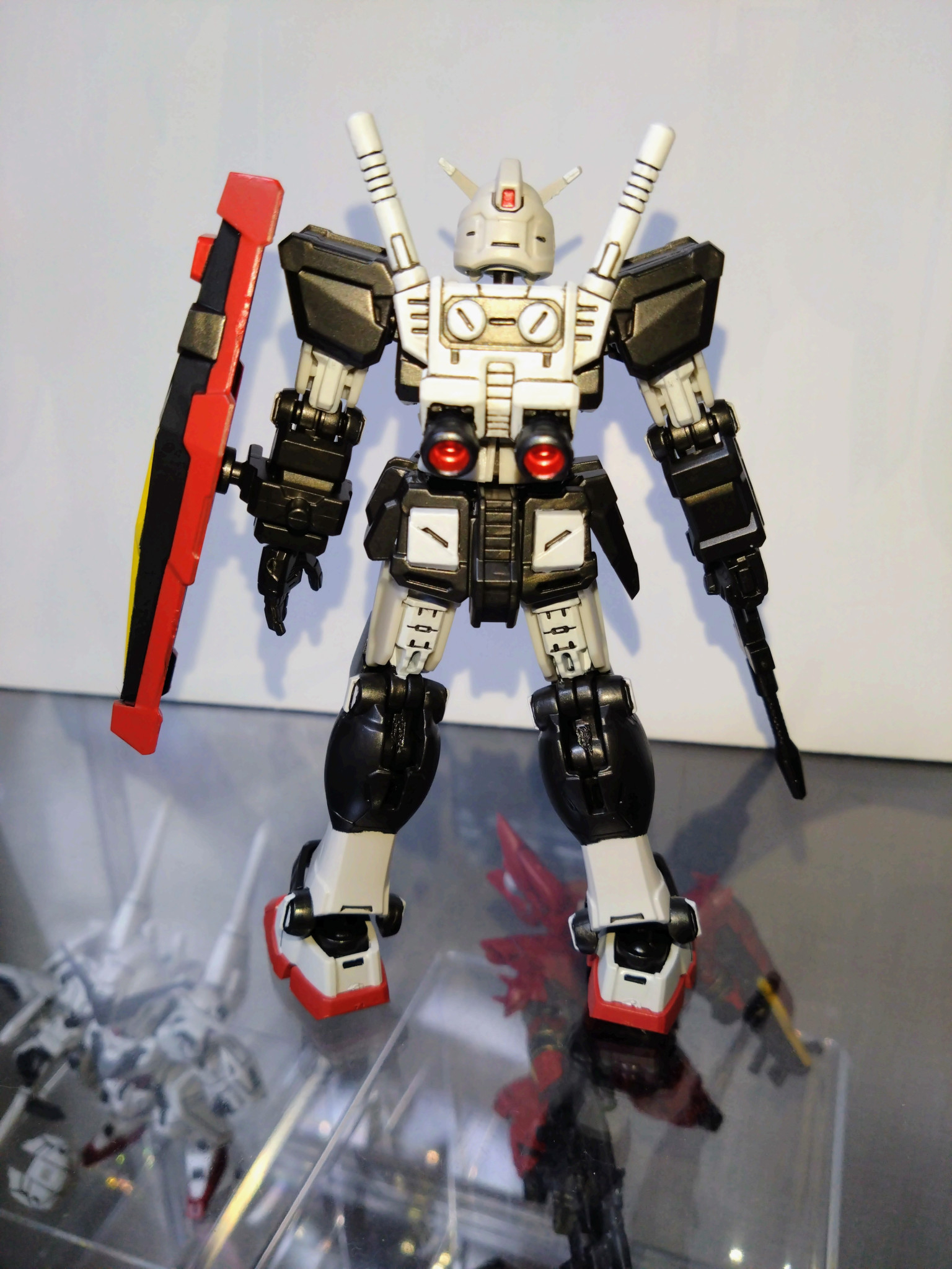 水性ホビーカラーはガンダムホワイト、ガンダムイエロー、ガンダムレッド、メタリックブラック等を使用し、Mr.カラーはGXメタルブラックを使用しました。