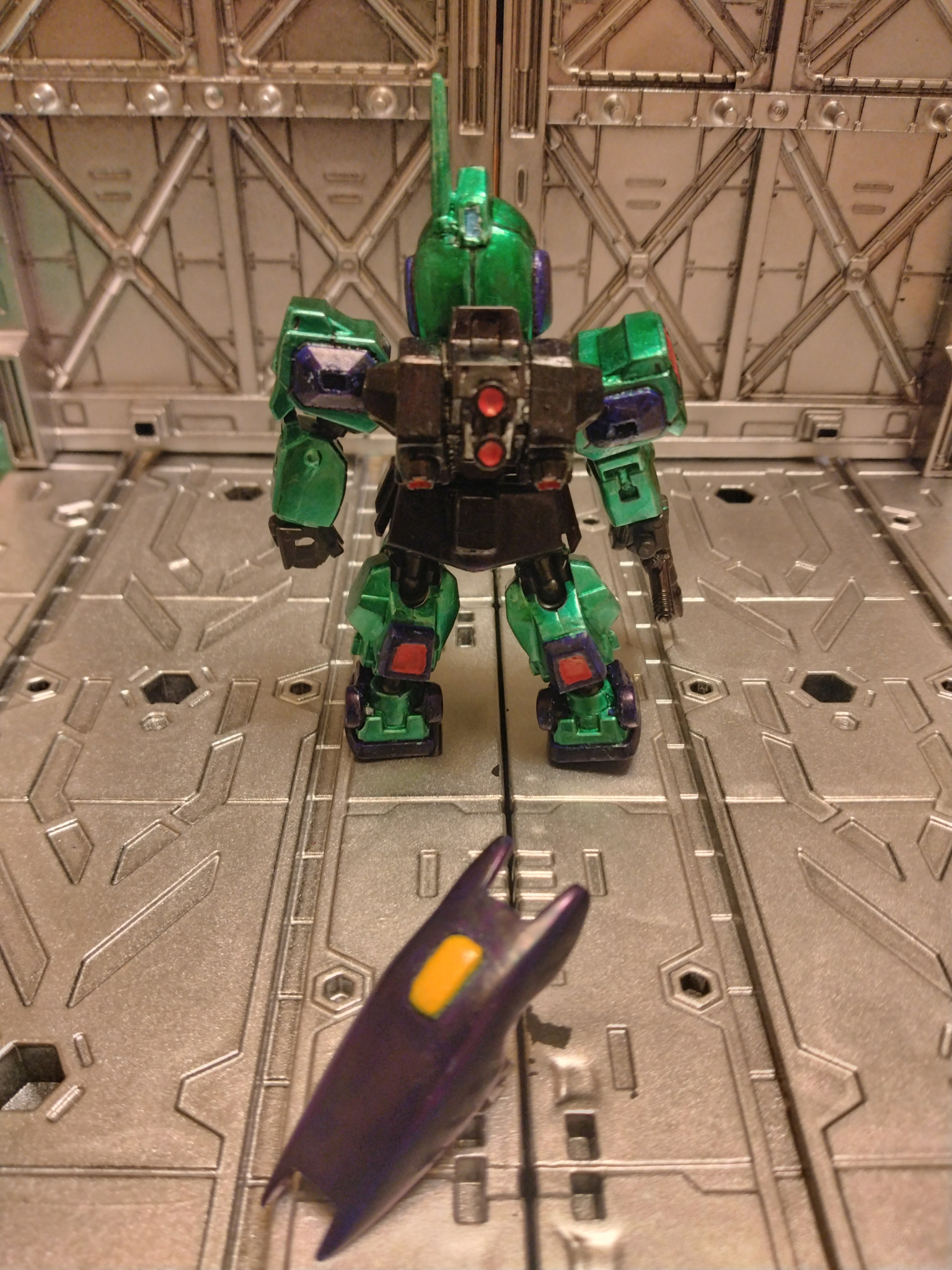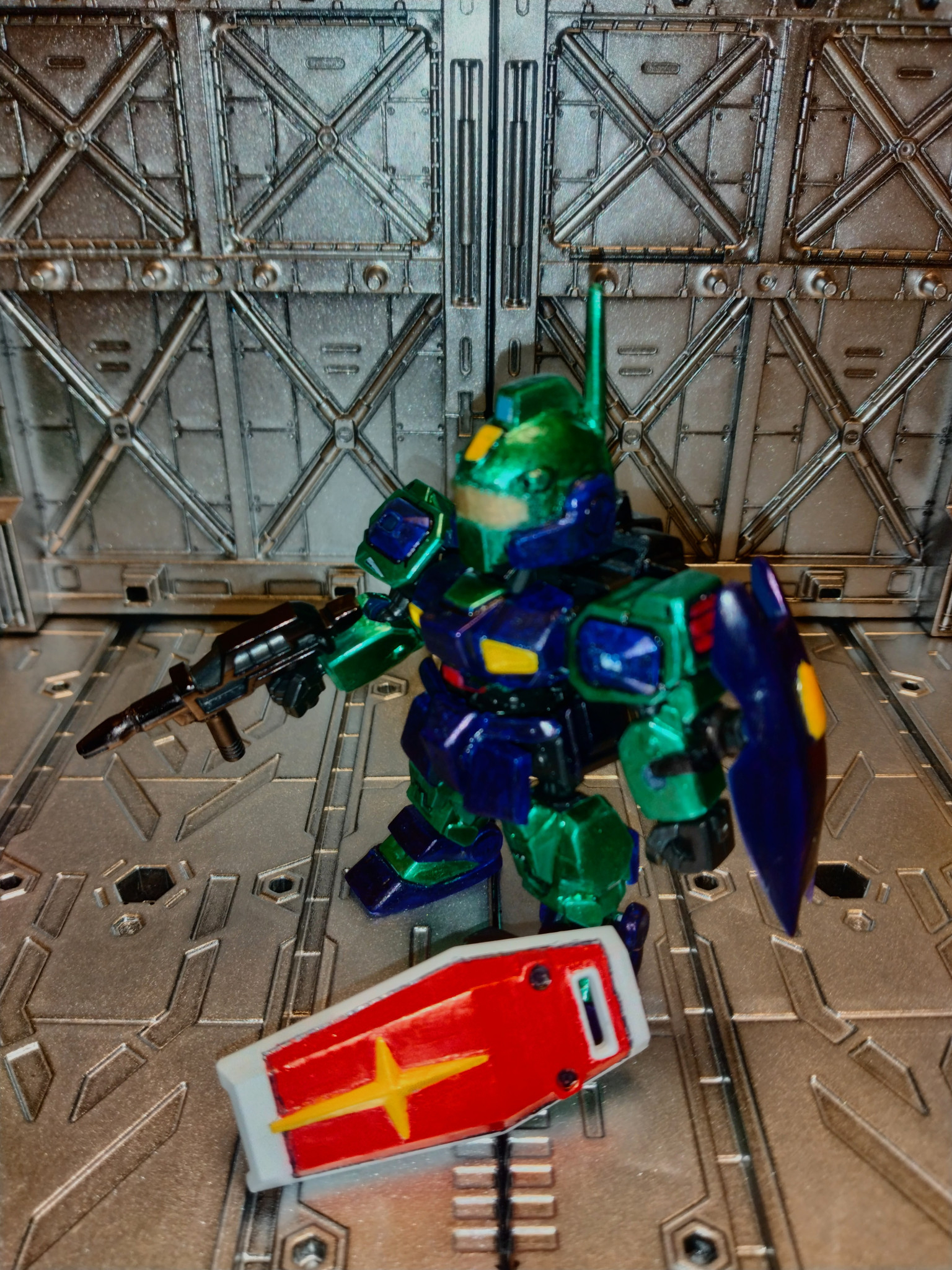 本体のグリーンはガンダムマーカーのルミナスメタグリーンを使用。ブルーは自宅にあった水性マーカーを重ね塗りした後、ガンダムマーカークリアー光沢を重ね塗りしました。