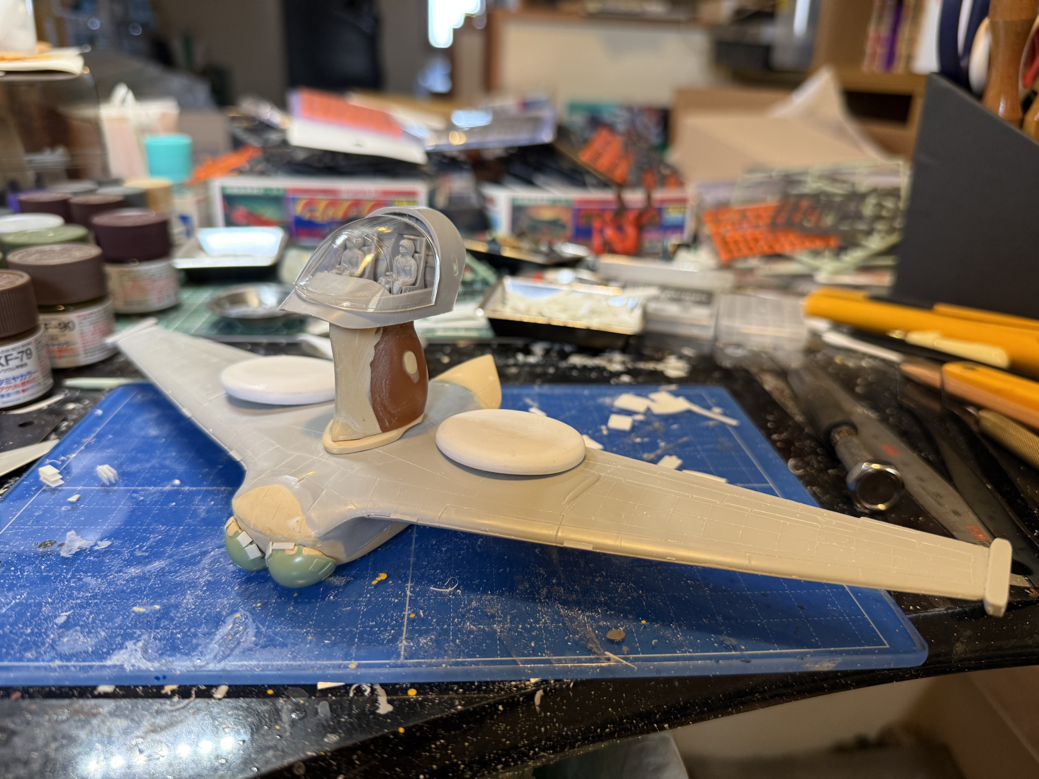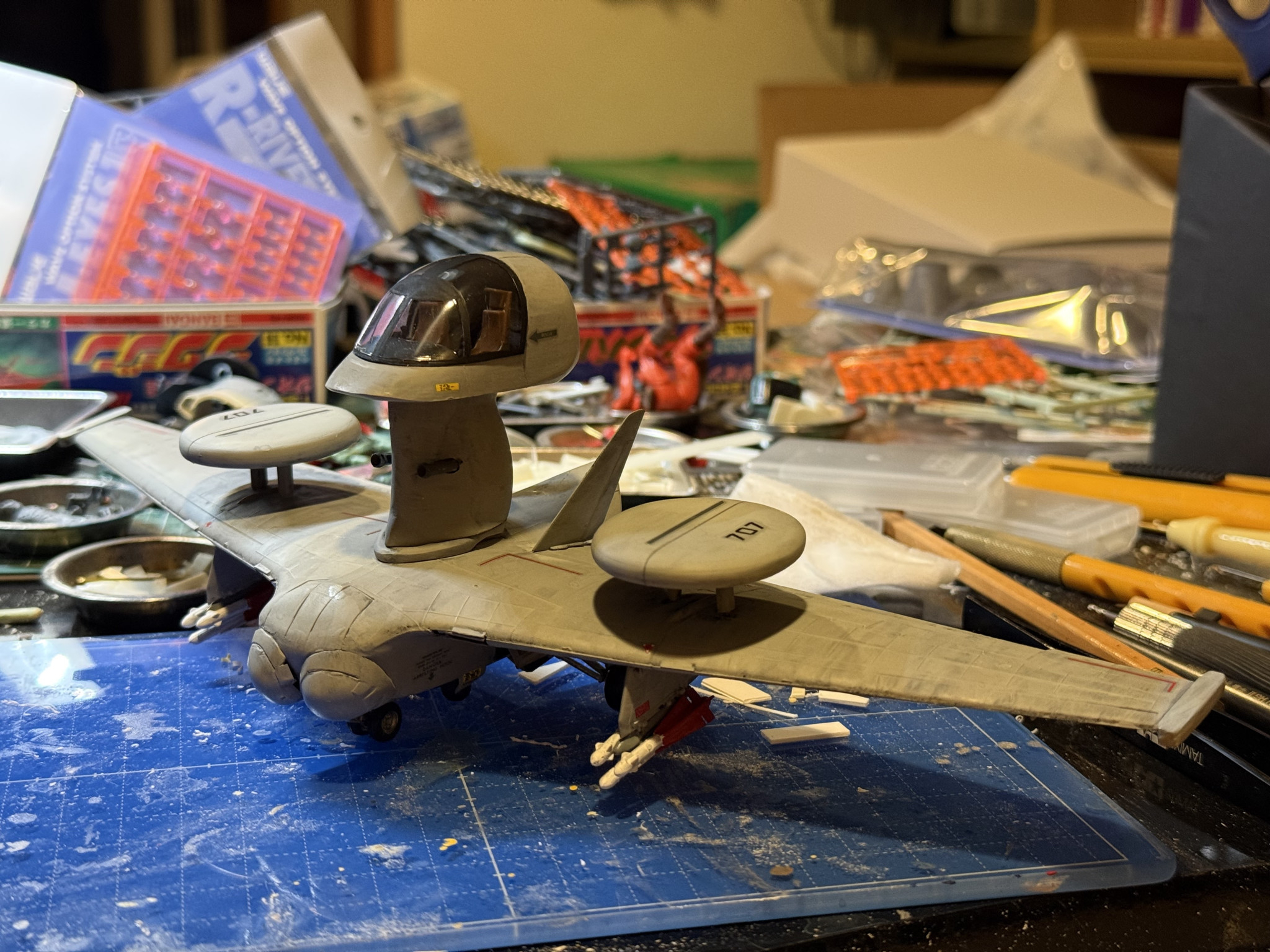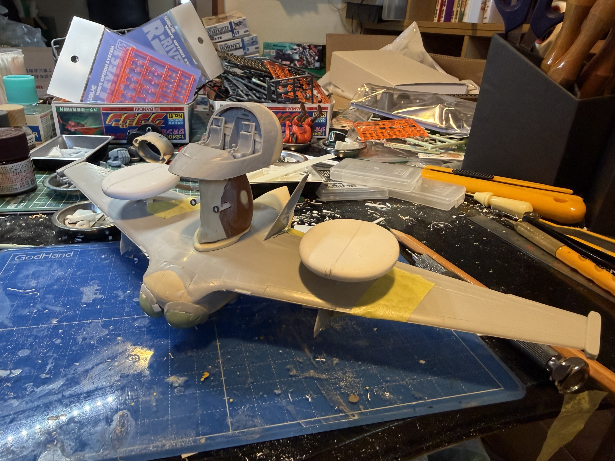 削り出してこんな感じに.コクピットはバイキングの機首部分を切断して持ってきました.翼の上の白いのはプラバン積層によるレーダードームの作りかけ.