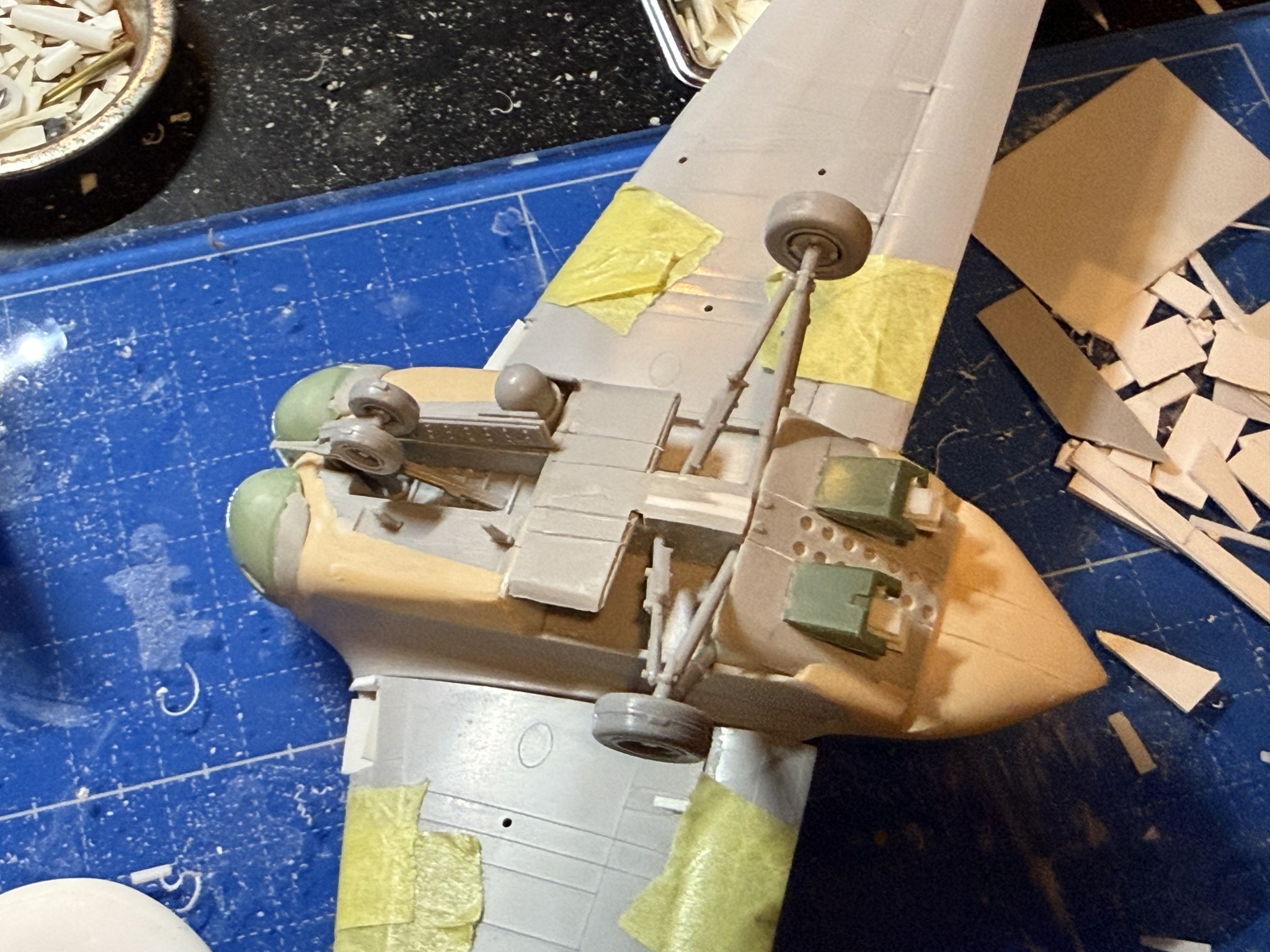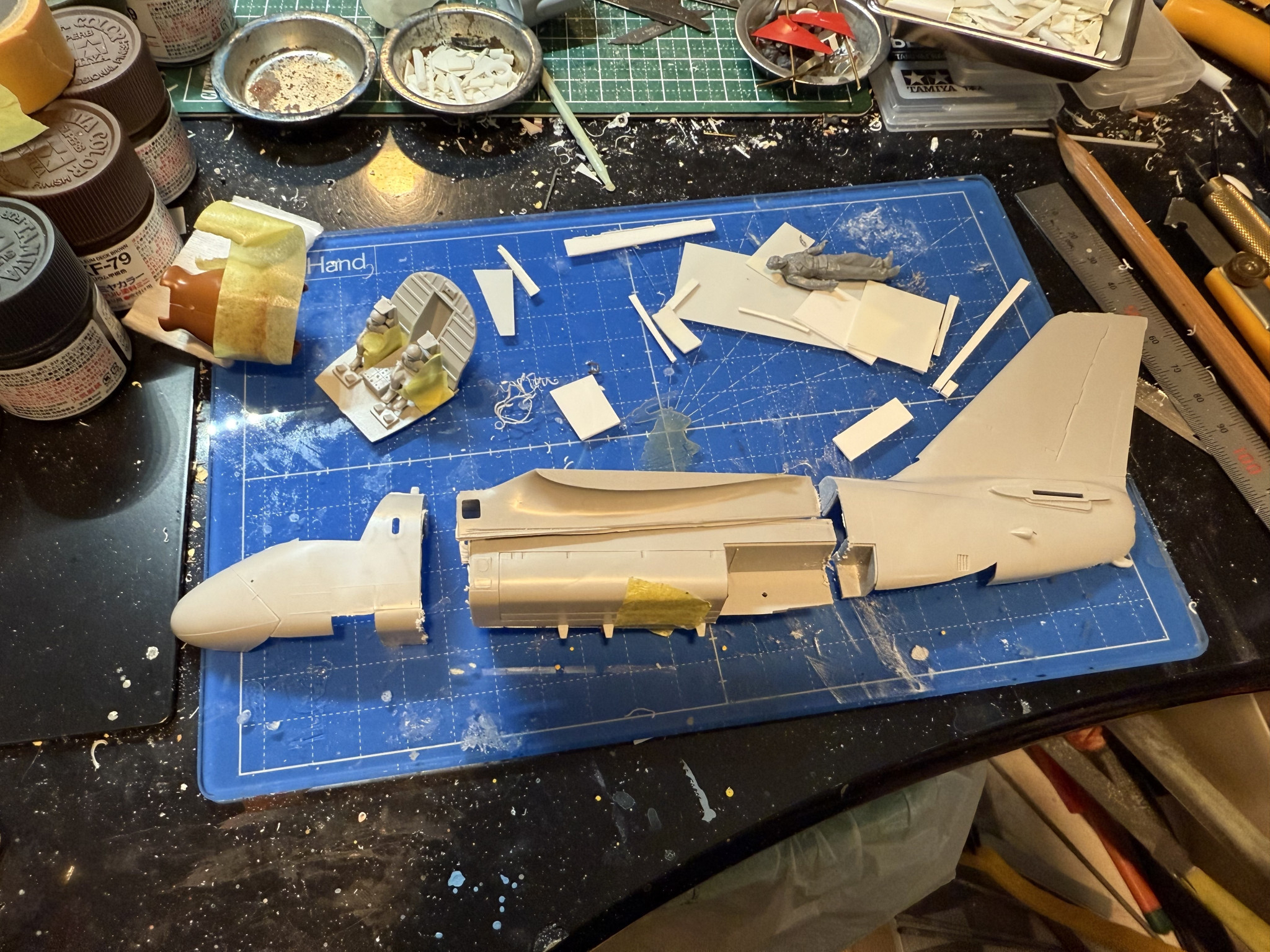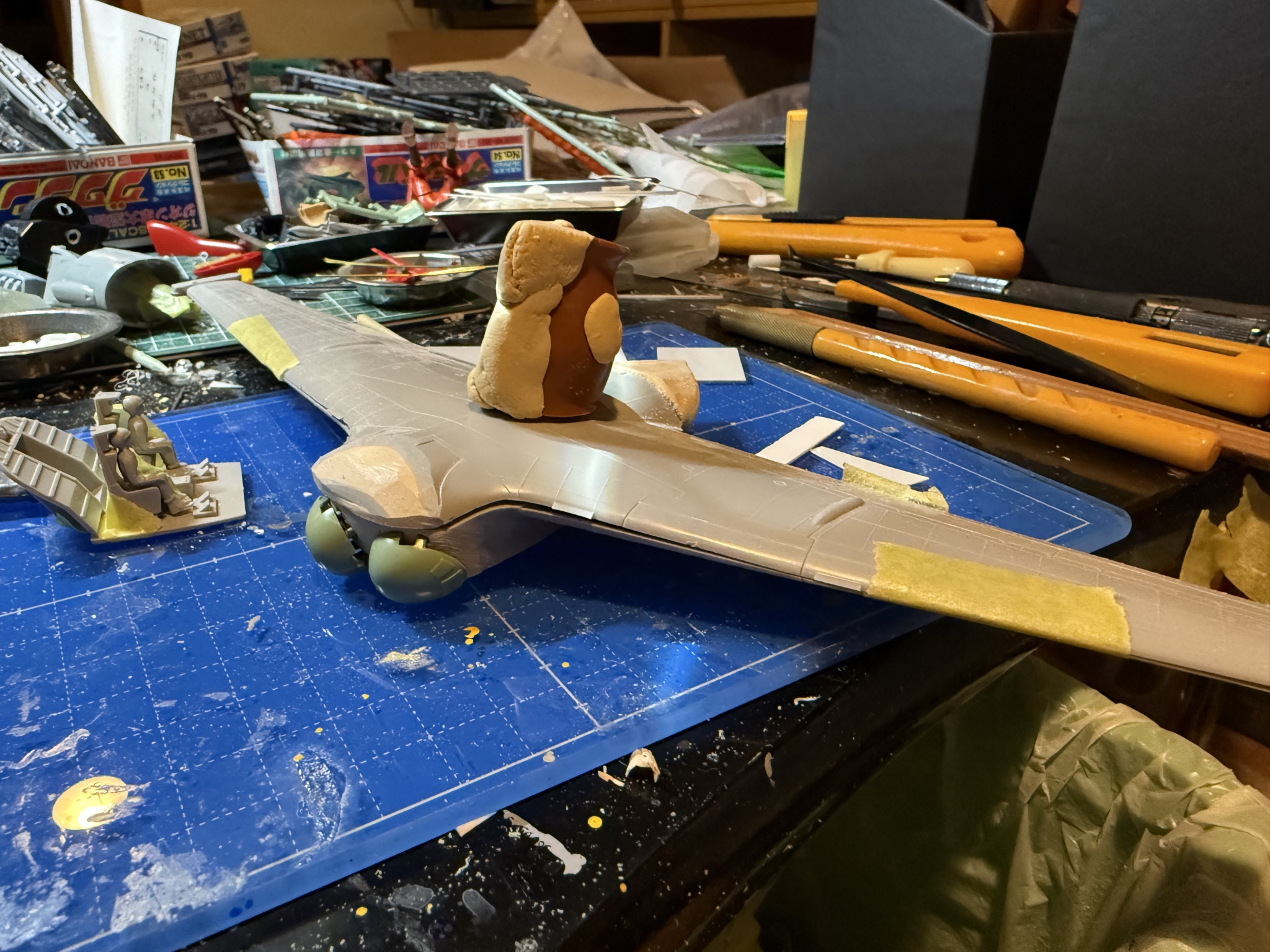 削り出してこんな感じに.コクピットはバイキングの機首部分を切断して持ってきました.翼の上の白いのはプラバン積層によるレーダードームの作りかけ.