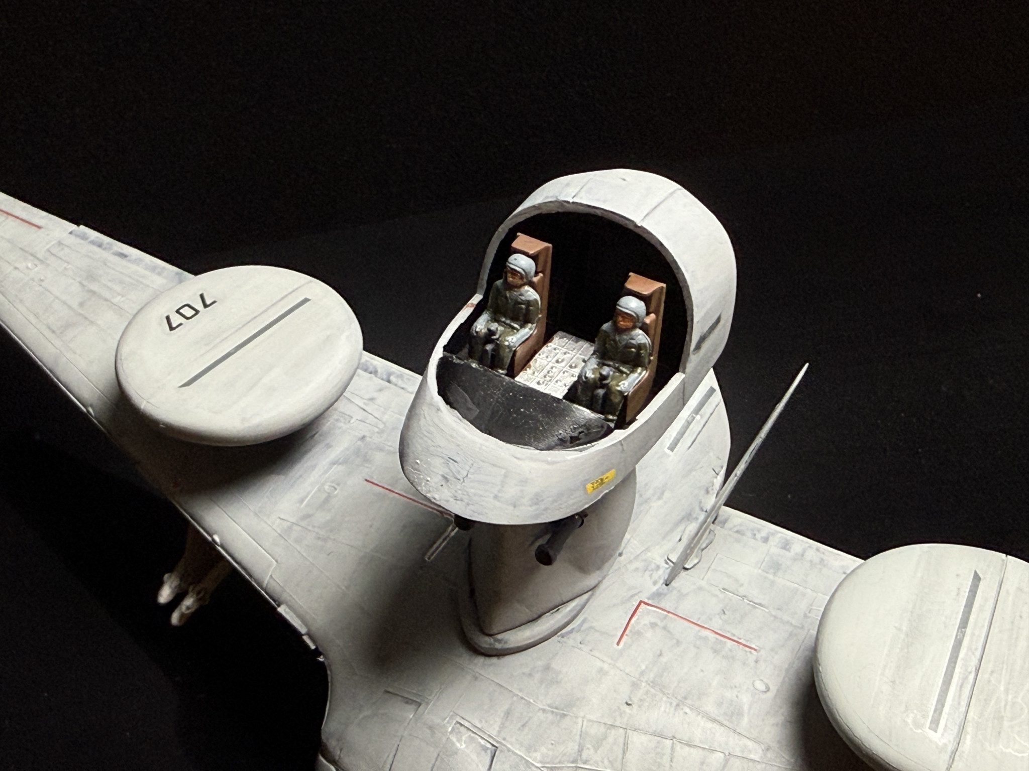 ルッグンは翼の上にコクピットがあるという変態構造.アメリカ軍のパイロットを座席毎上に乗って貰いました.途中の茶色の支柱は1/144ガルマザクの脛です.