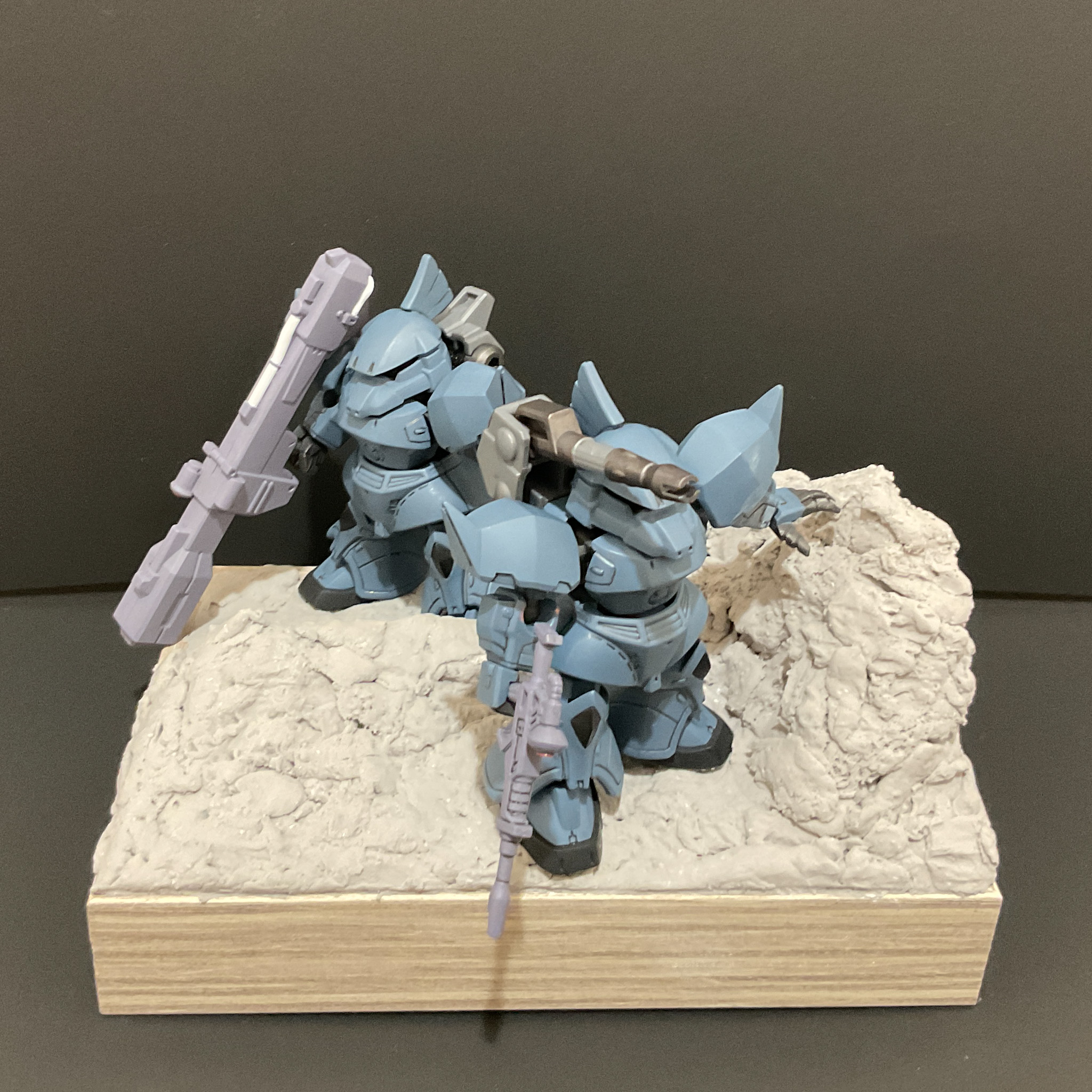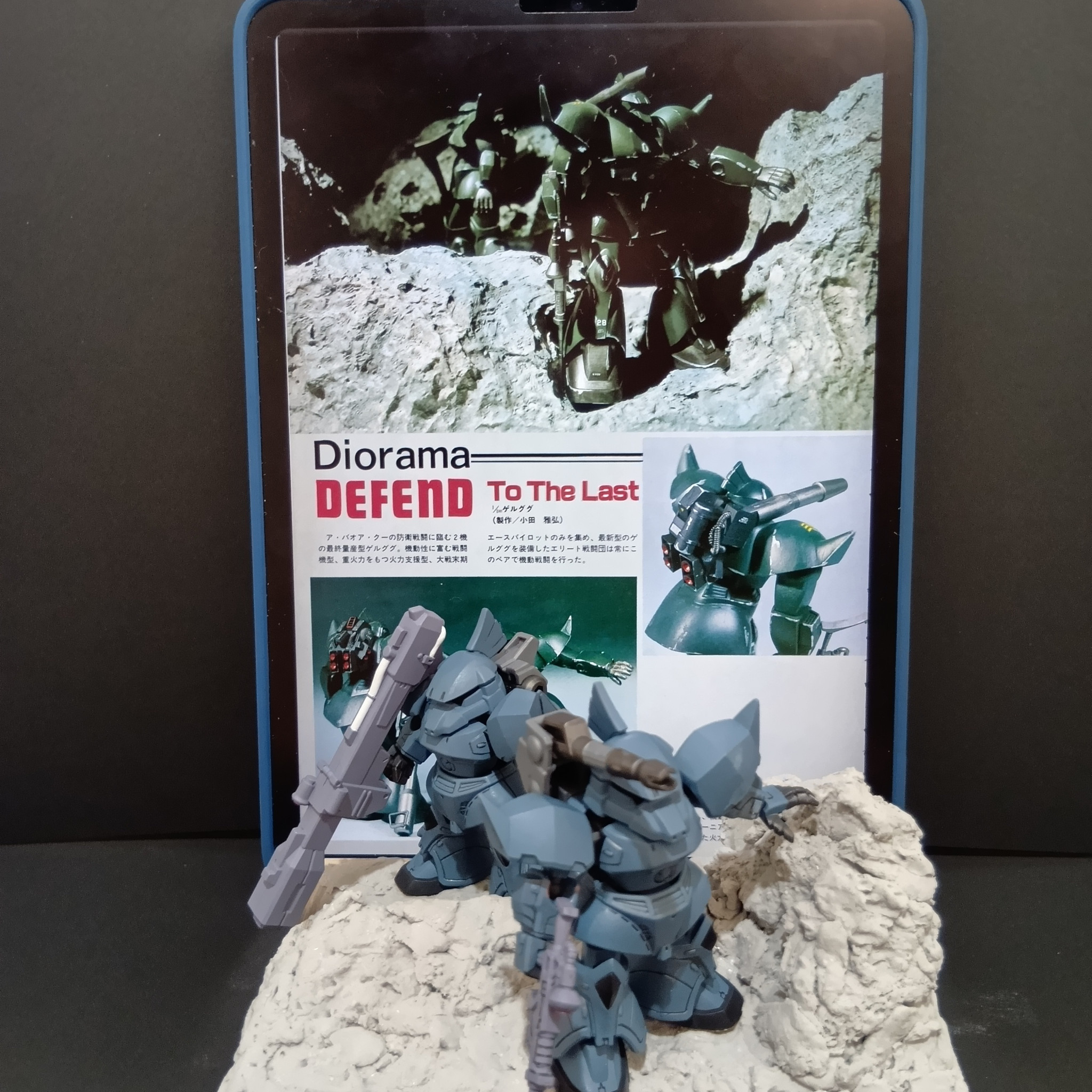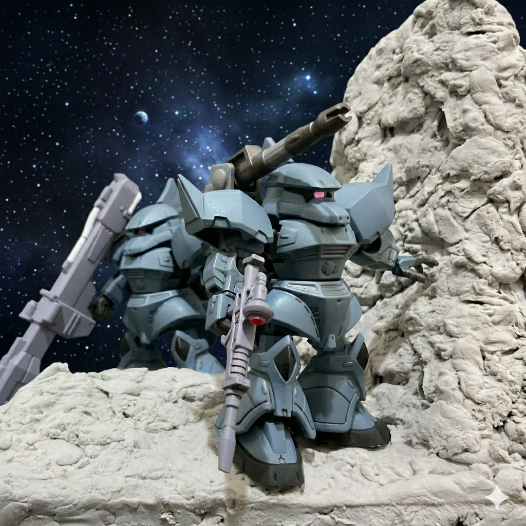 Gemini に同じような情景を作ってもらいました(ゲルググは加工しないよう指示しています)。AI作のほうが見栄えがいいのですが手作りのジオラマもいいですよね。