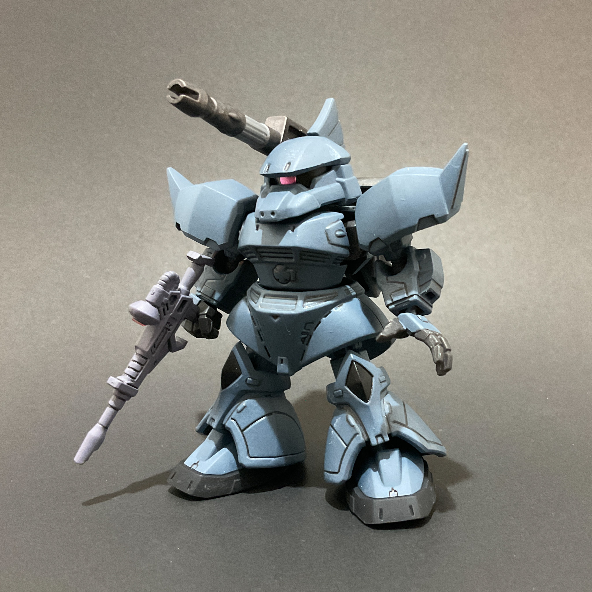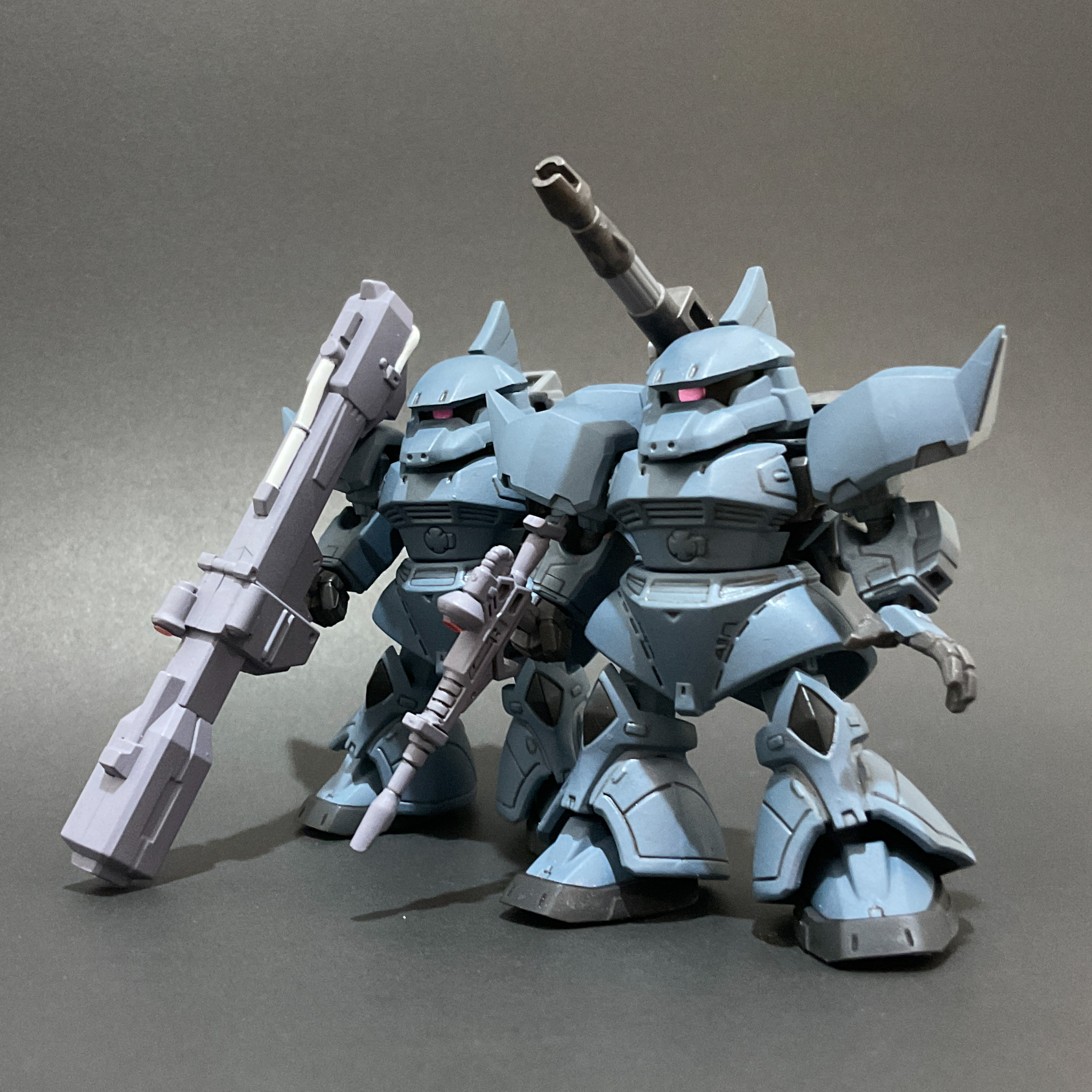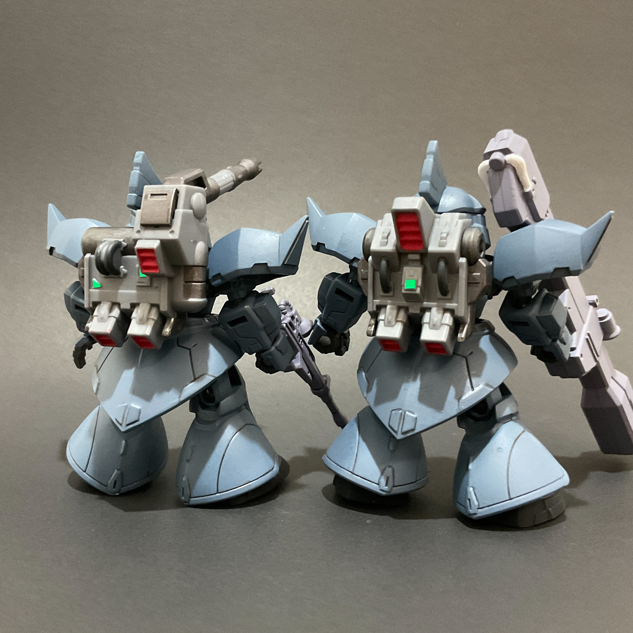 目指したのはこれです。ア・バオア・クーに配備された高機動型バックパックとキャノンパックを備えた2機のゲルググ、という設定だそうです。作例では本体はダークグリーン1色で塗装されていますが、以前作ったガンダムがグリーン系であり同系色で塗るのは面白くなかったので個人的に好きな色のブルーグレーで塗りました。