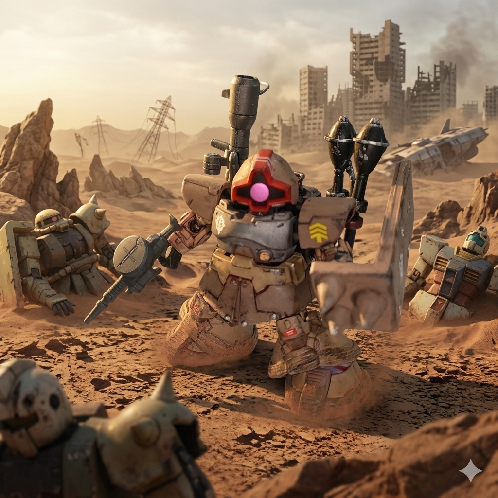 これでもかってくらいに盛られた武器がカッコいいですね。後半のデジラマは戦争根絶のために設立された謎の武装組織に所属するドムが連邦ジオンを問わず無双状態で沈黙させた図、って感じですね!
