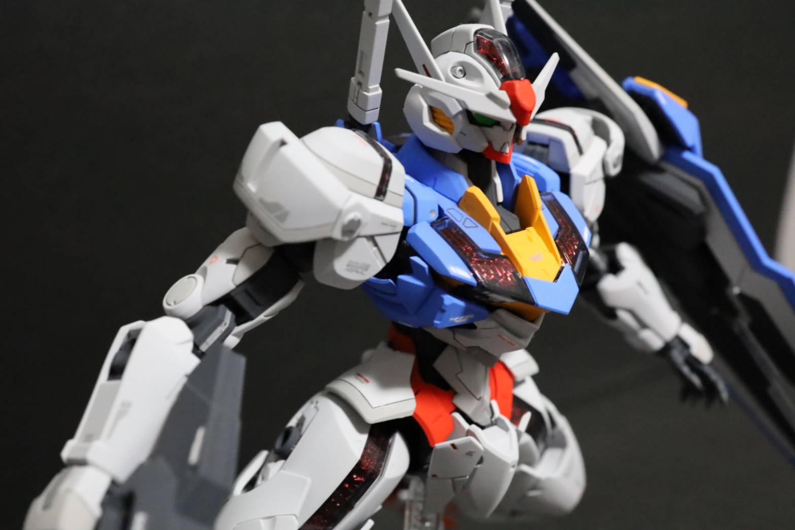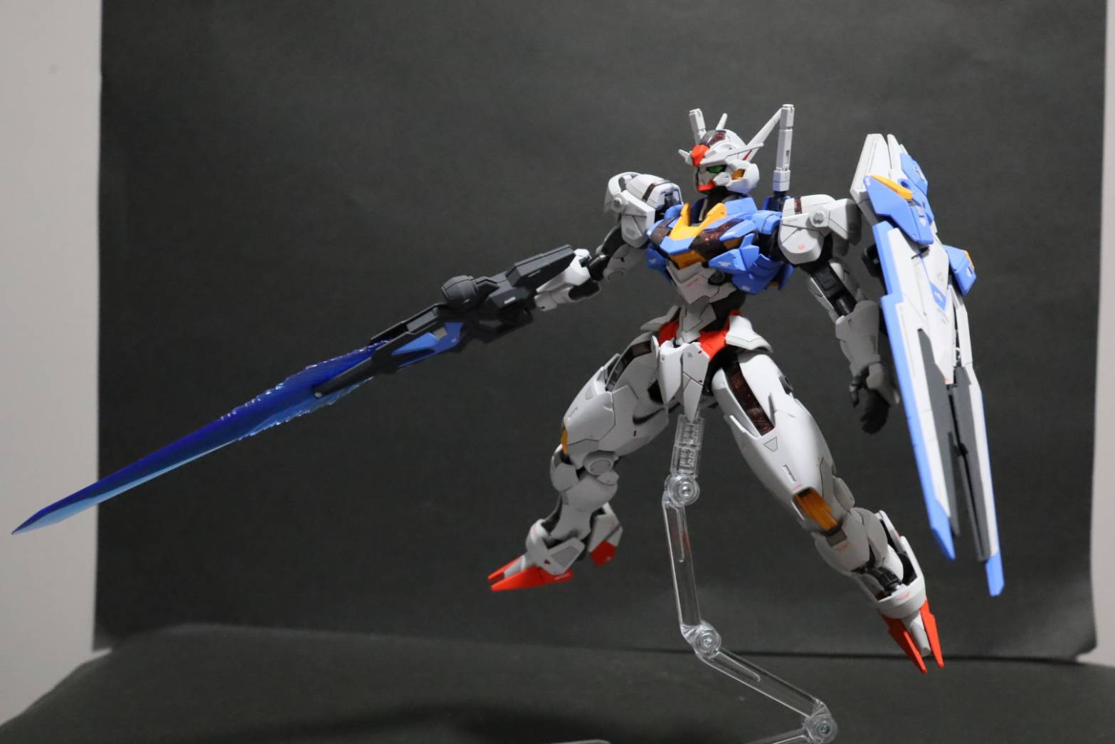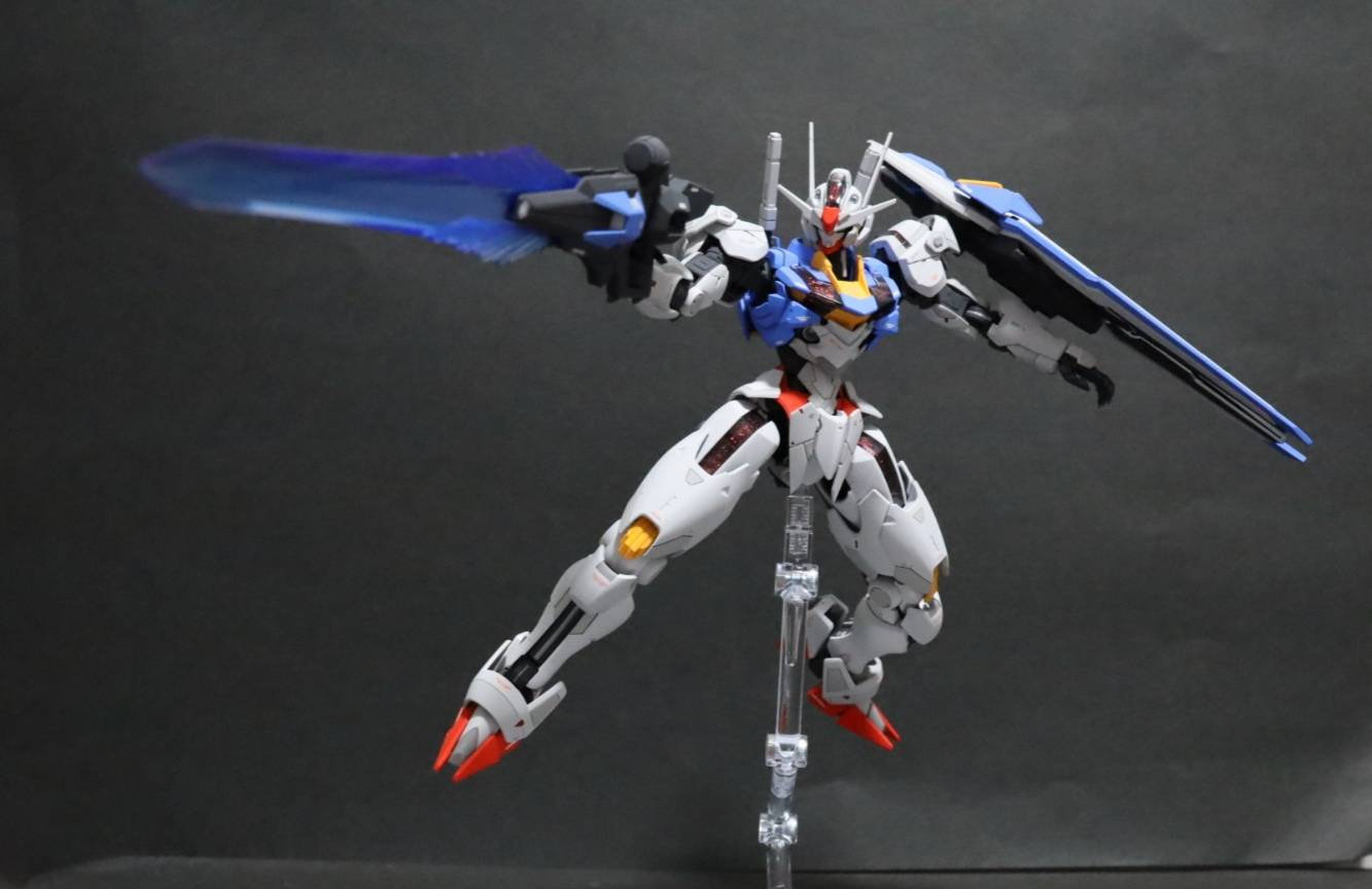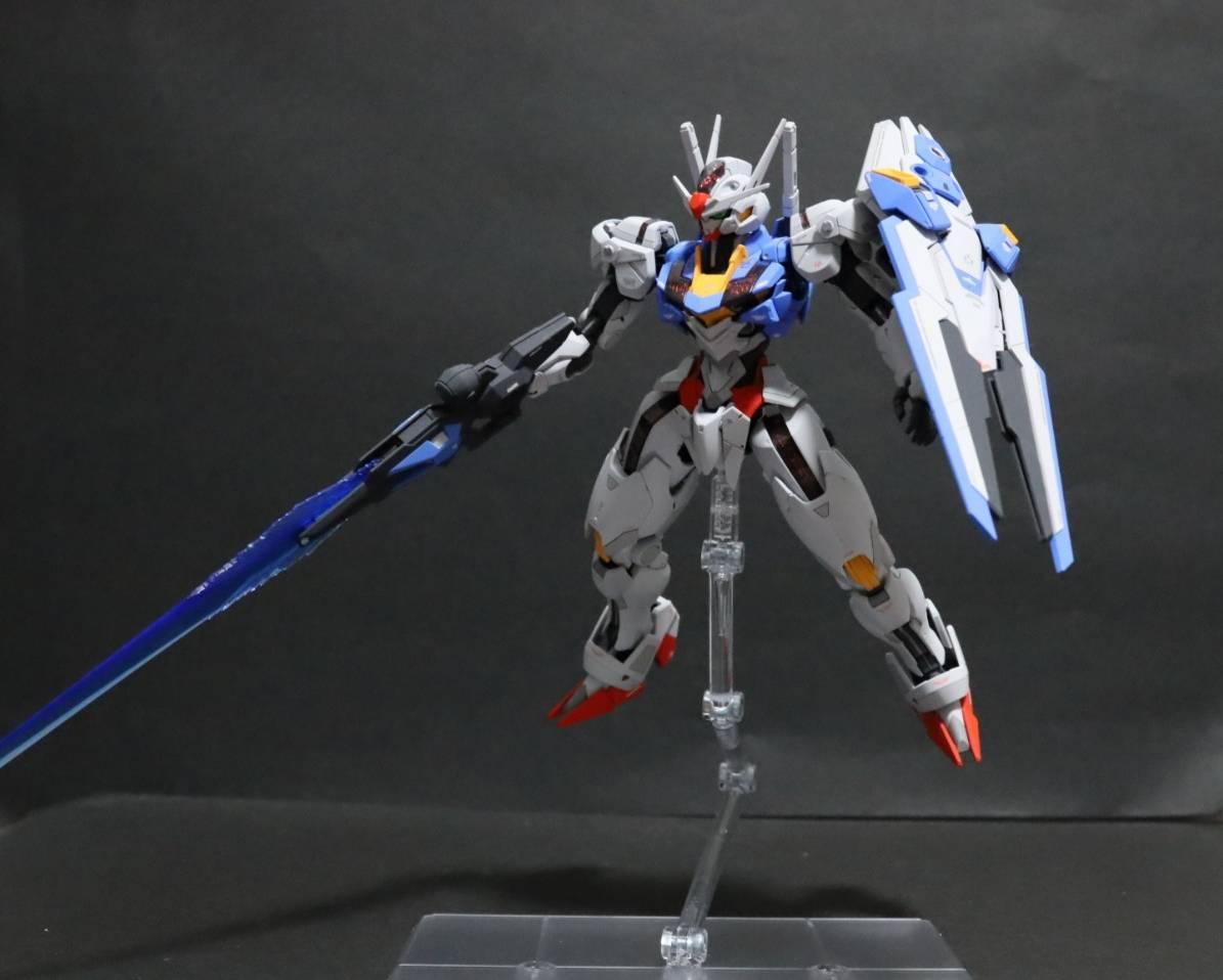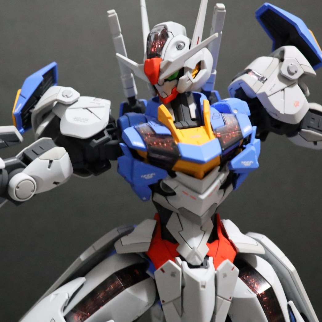 水転写デカールは1/144水星の魔女シリーズ用のを使いました。サイズ差があるのでどうかなと思いましたが、案外違和感なく仕上がりました😊