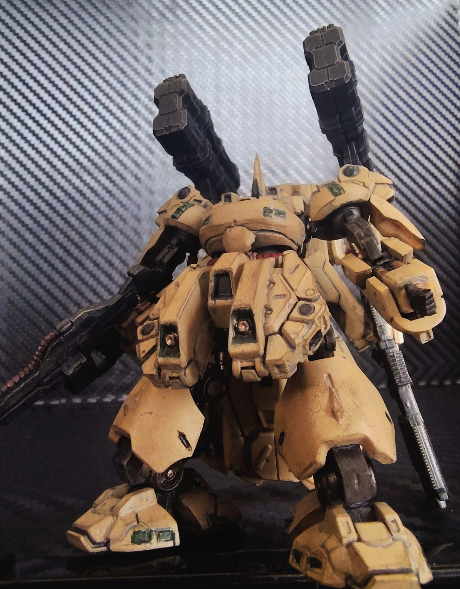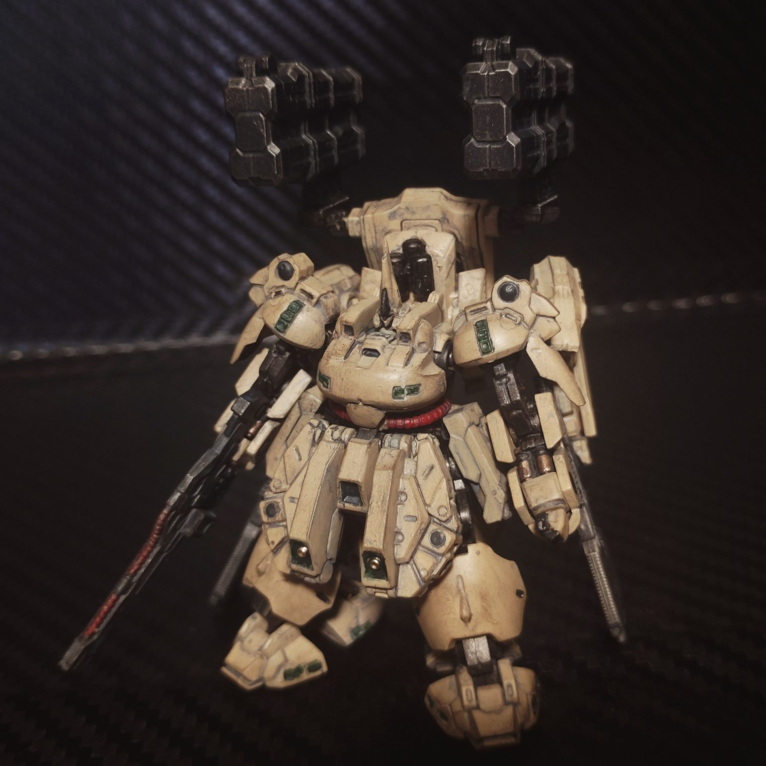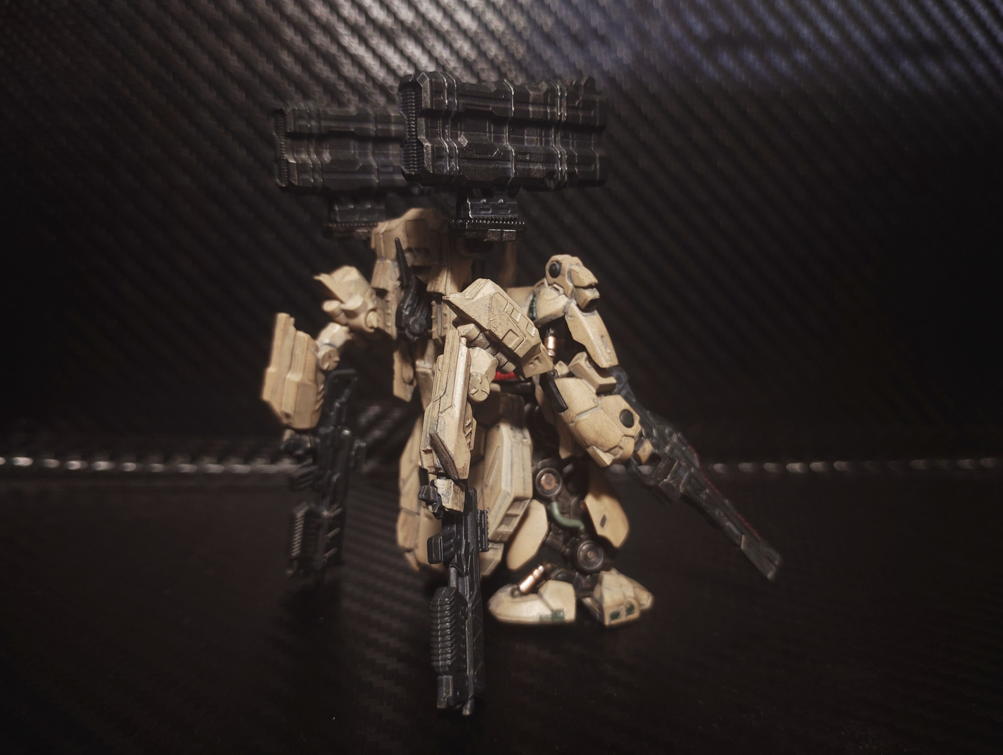 デフォルトに寄せつつ少し落ち着いたタンカラーで塗装。粗をごまかすために汚しを少し入れています。いつかはキッチリ塗り分けた綺麗な作品も製作してみたい…!