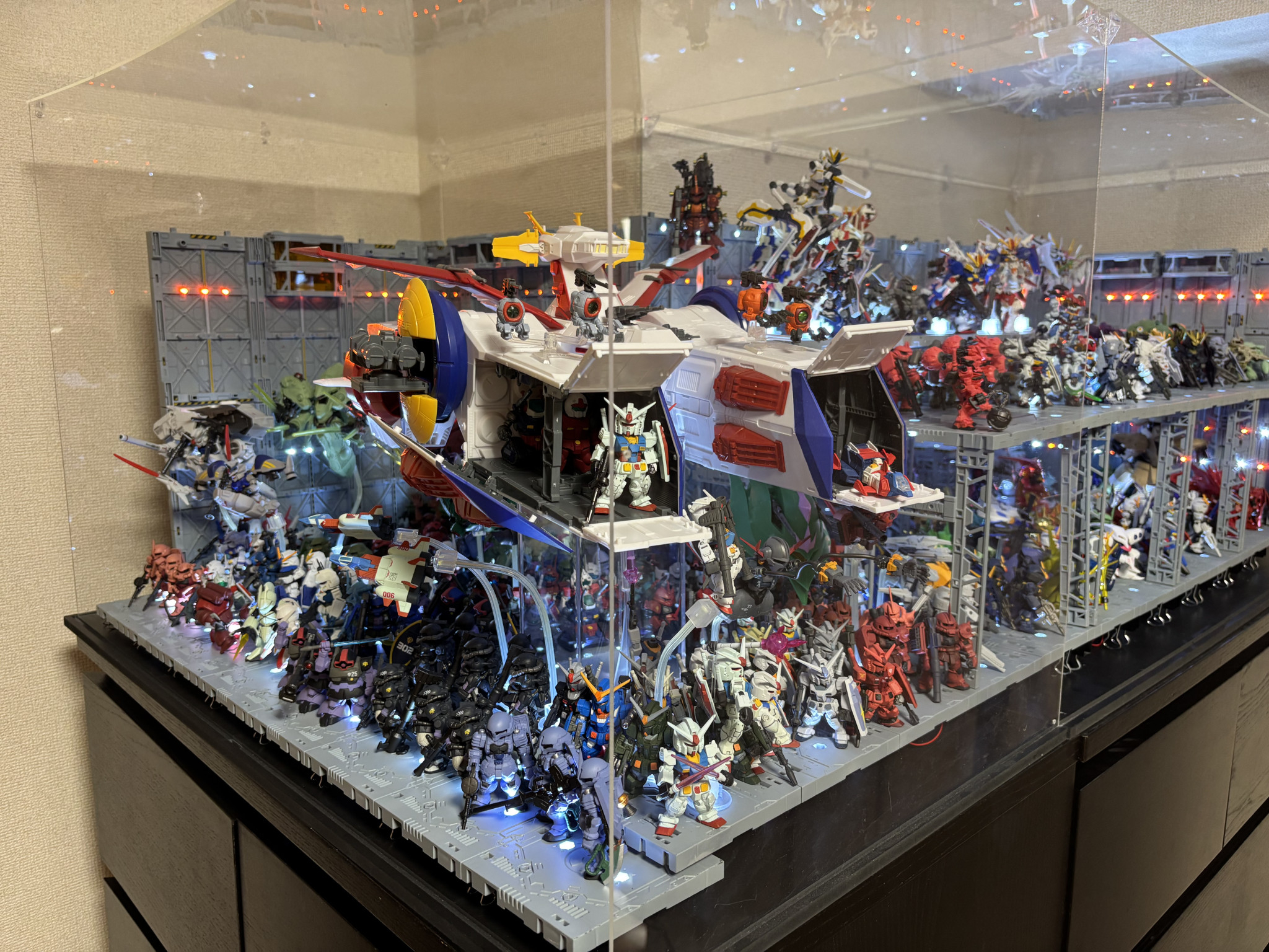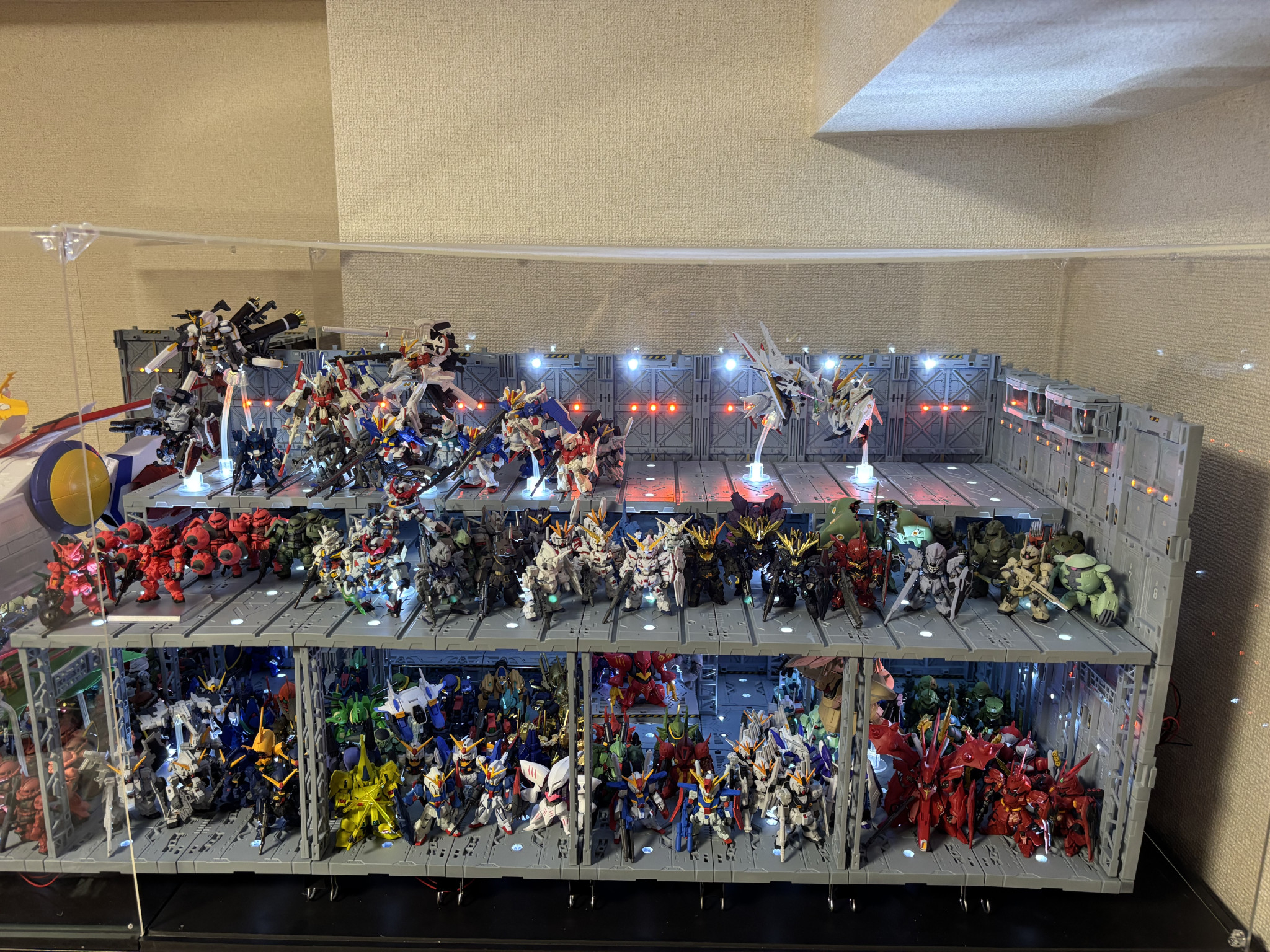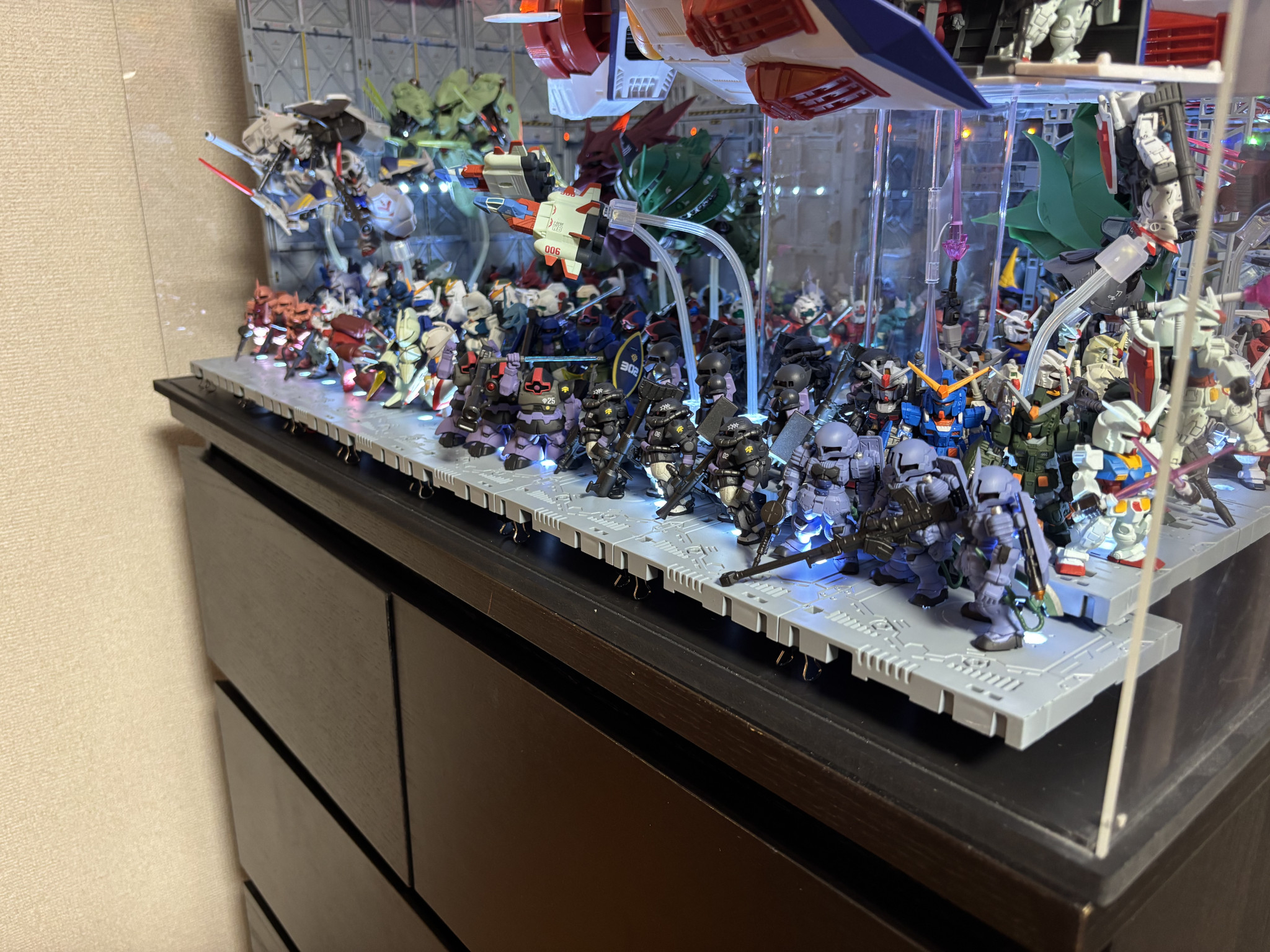 今回の電飾化のついでに、既存のジオラマの一段下に、お気に入りを並べるお立ち台を用意。ここに「特に酒飲みながら眺めたいシリーズ」を並べる事にしました!なかなかええでしょ、コレ。