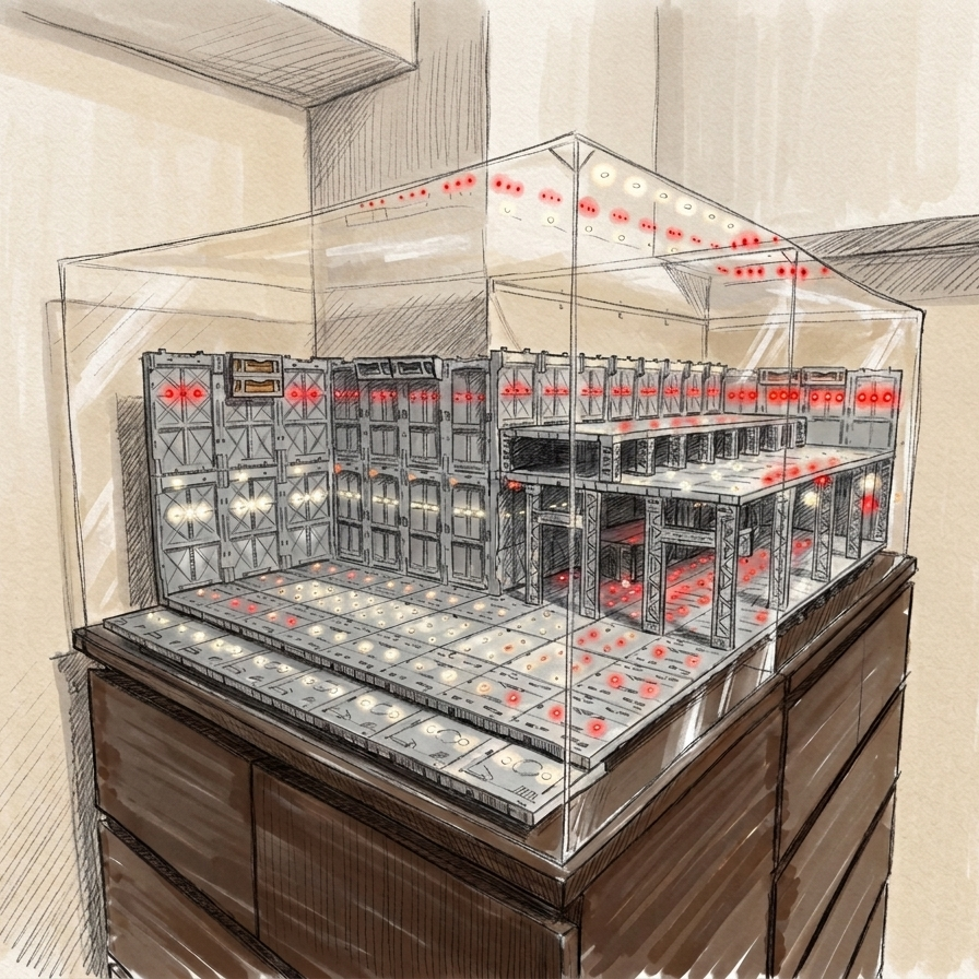 ほんで、2階とか2.5階でこれと同じ作業したら、まあ、当然ながら配線かさばるから、コードとかコネクタがダレて…配線見えてまうから、ジオラマとしては0点なわけよ。