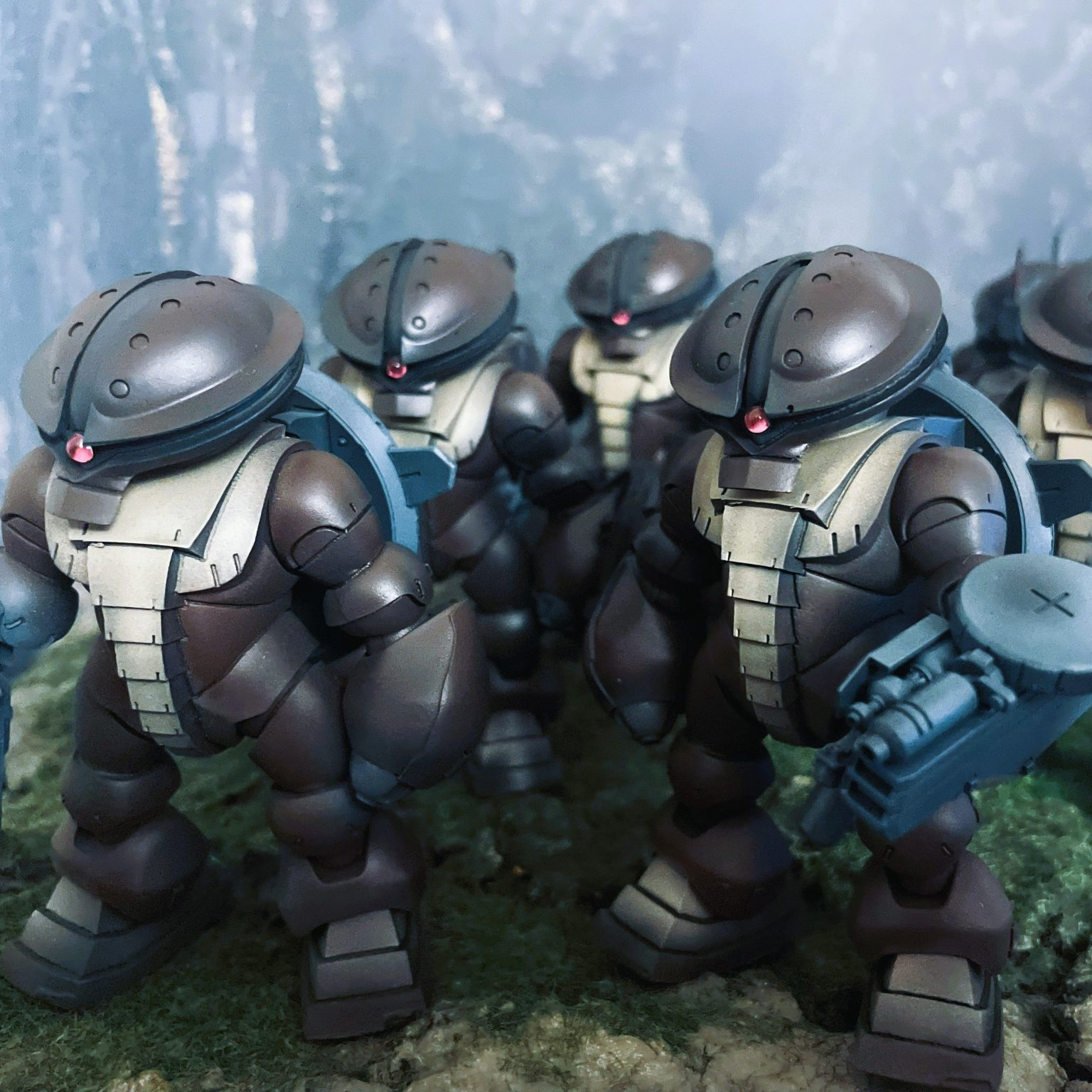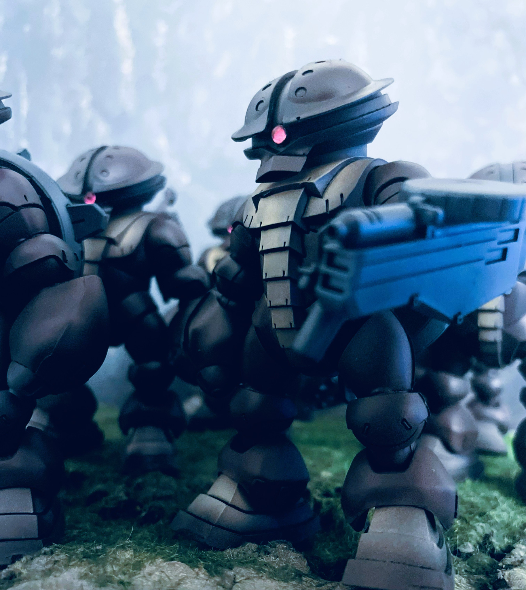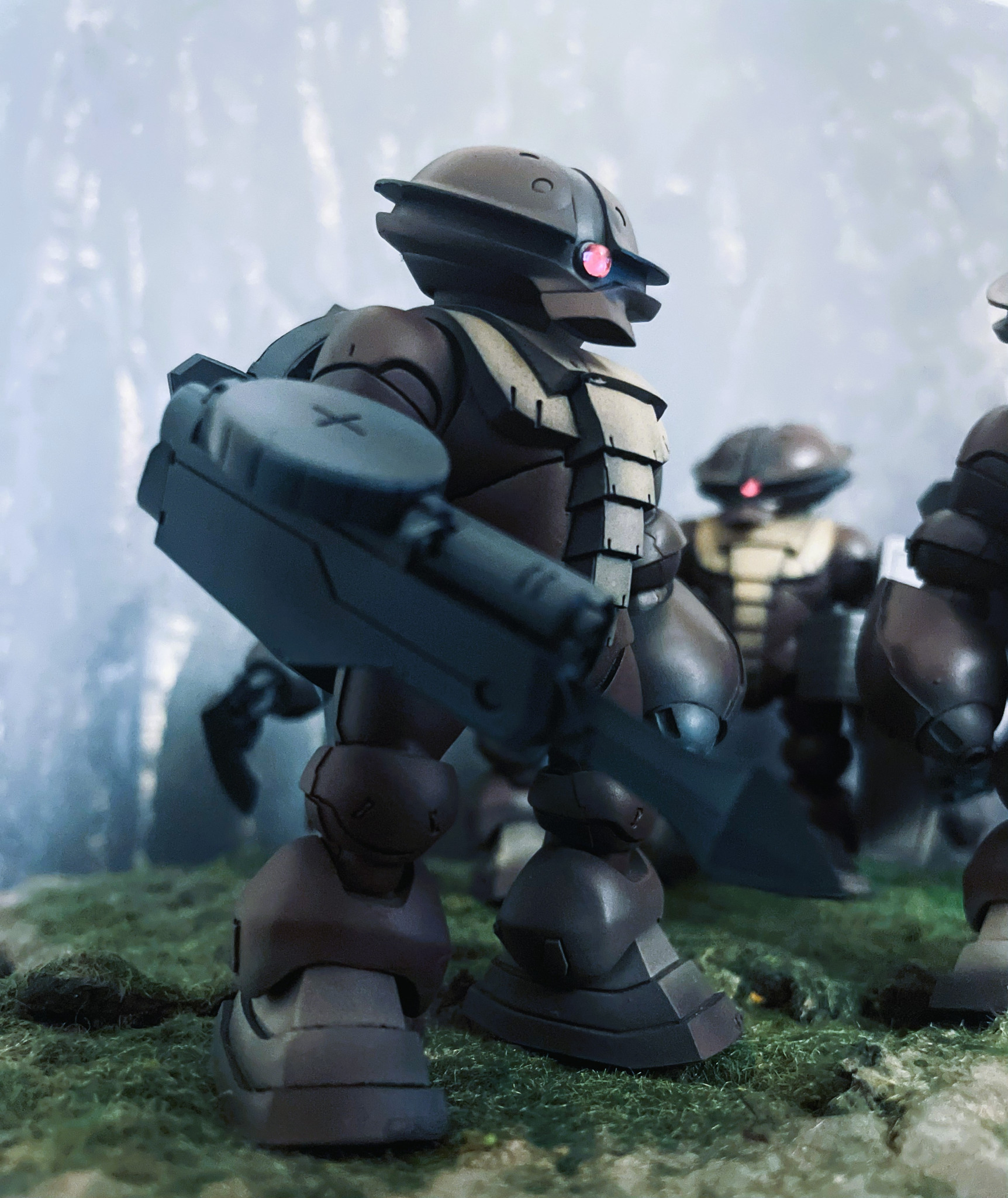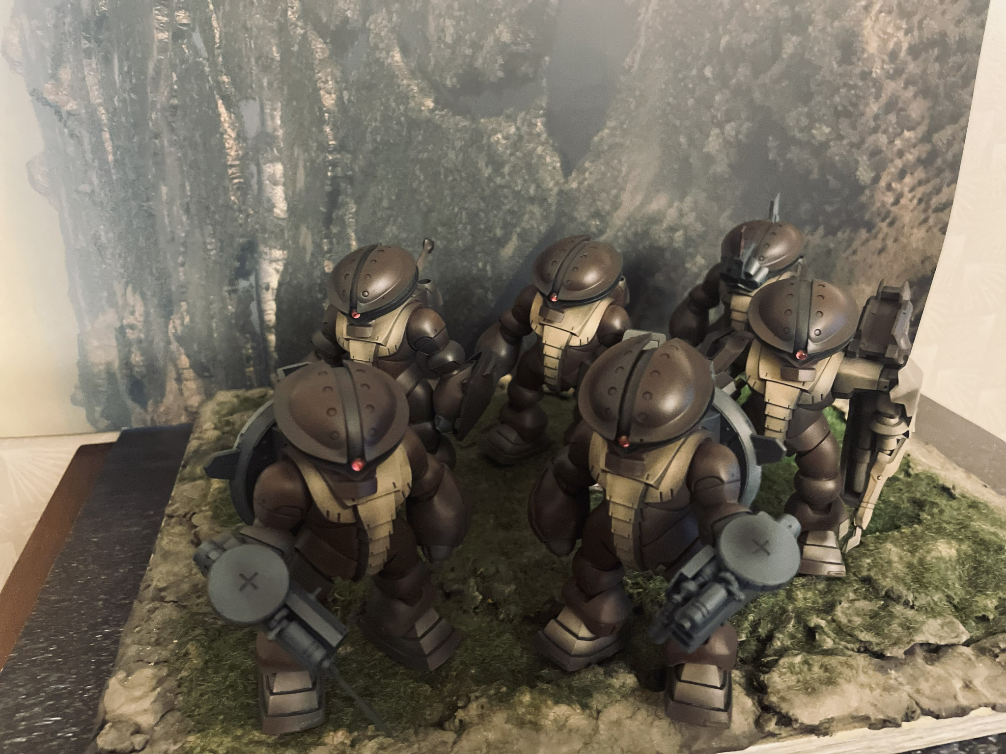 機動戦士ガンダム サンダーボルトよりアッガイ部隊を再現しました。BANDIT FLOWERでの一場面、南洋同盟の本拠地に乗り込むシーンをイメージしています。漫画で読んだ際「いいな」と思っていたところ、映画で実際に動くシーンを観るにつけ立体化への衝動を抑えることができませんでした。とにかく格好いいです。