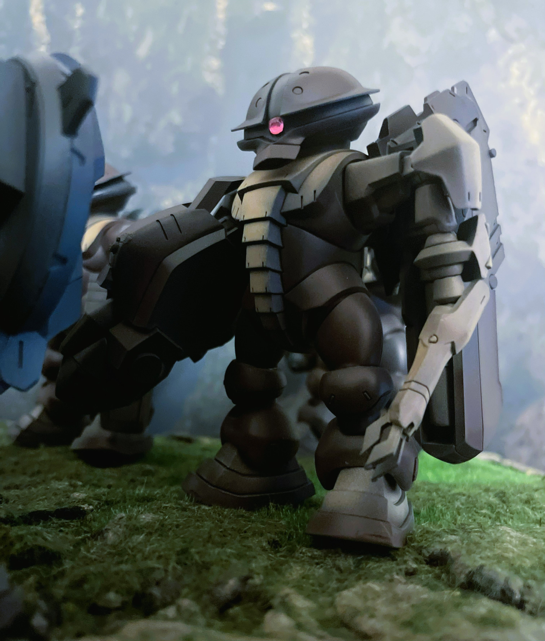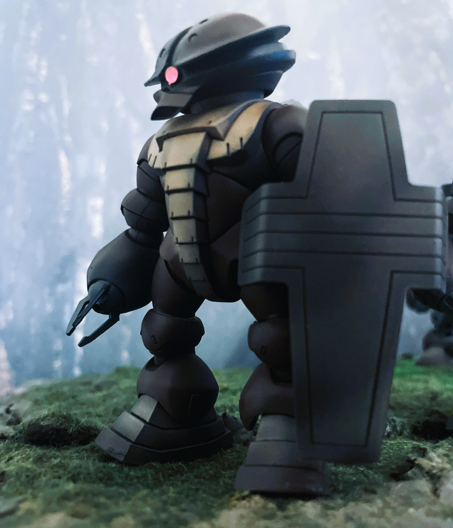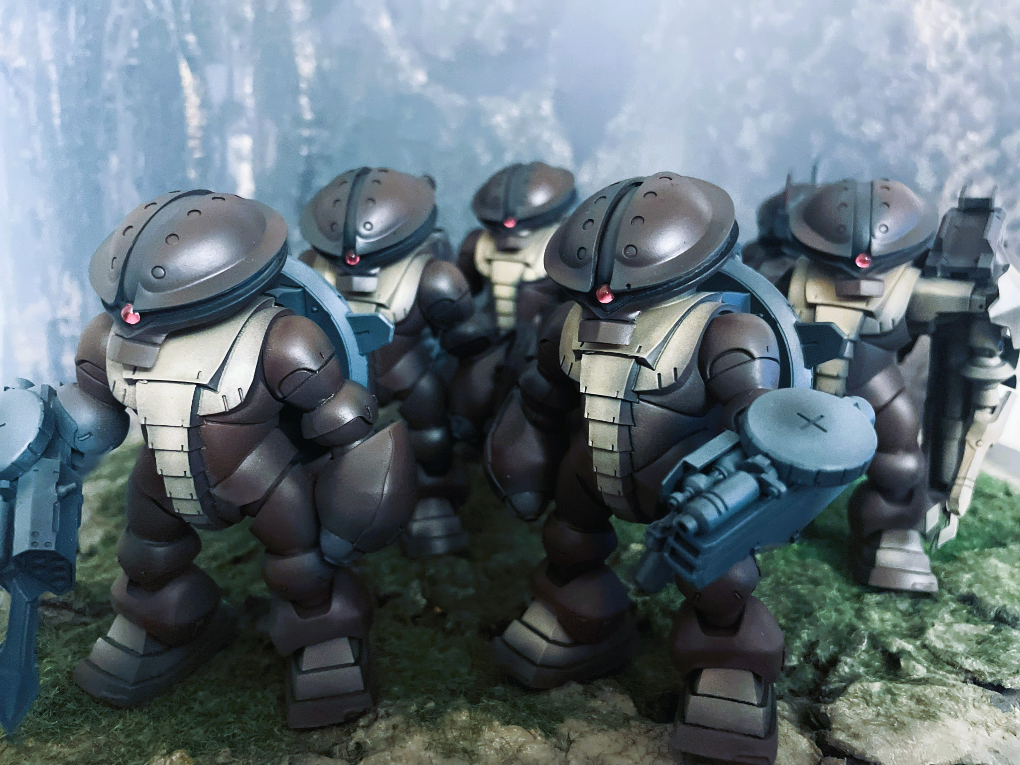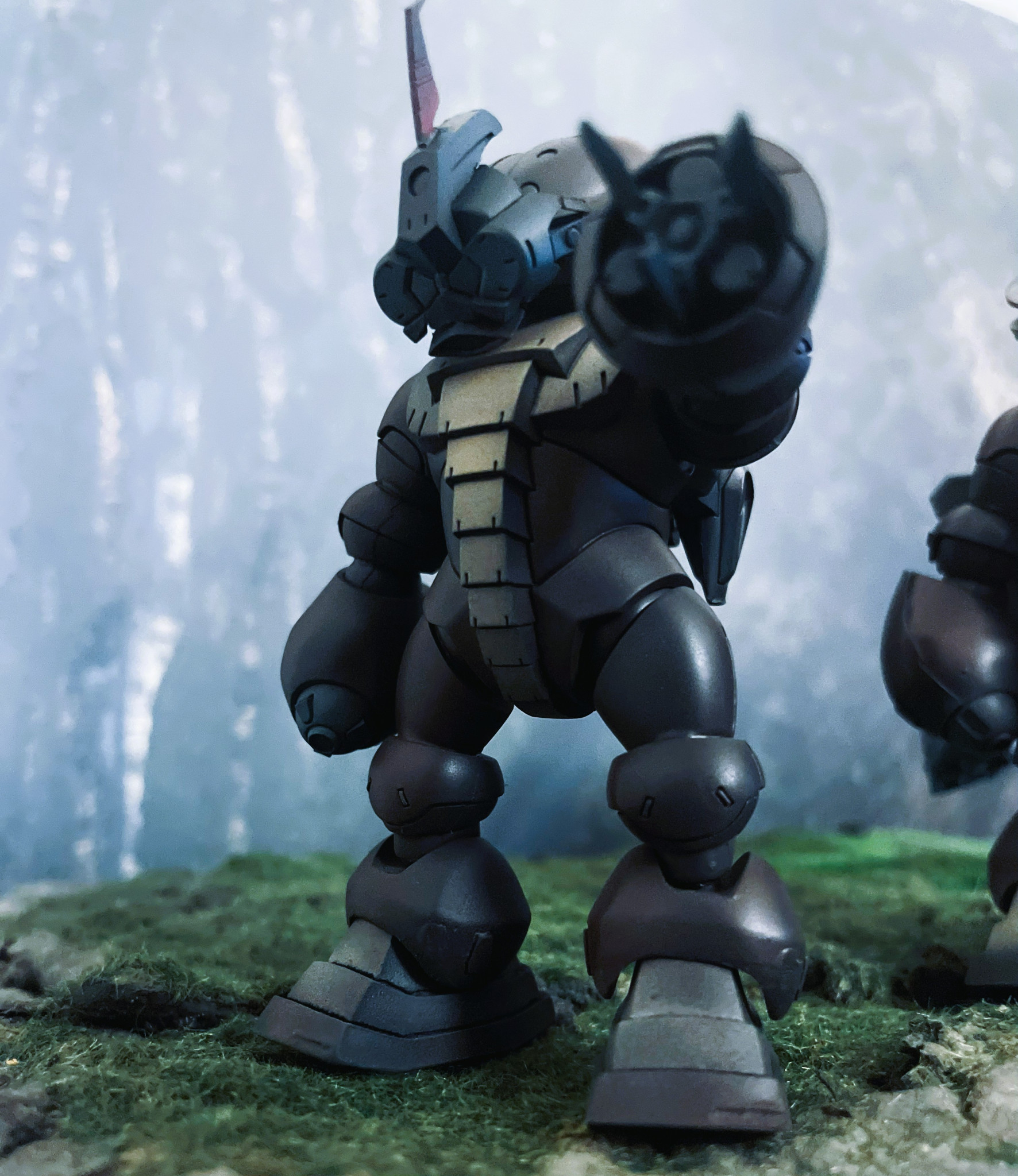 機動戦士ガンダム サンダーボルトよりアッガイ部隊を再現しました。BANDIT FLOWERでの一場面、南洋同盟の本拠地に乗り込むシーンをイメージしています。漫画で読んだ際「いいな」と思っていたところ、映画で実際に動くシーンを観るにつけ立体化への衝動を抑えることができませんでした。とにかく格好いいです。