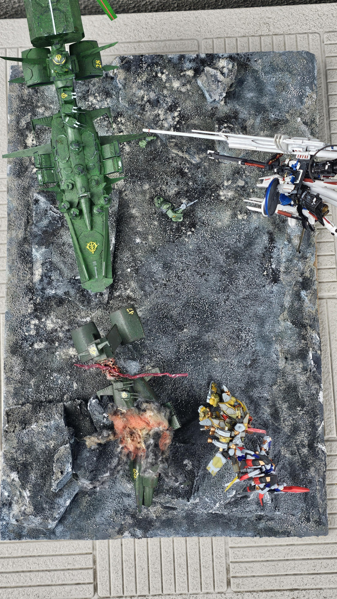 アーティファクトを改造したディープストライカー、Zガンダム、ザクlllと旧キットムサイ、ガンダムコレクションのザクを使って作ったジオラマです。初の宇宙ジオラマなんですが…遠近感を出すにはスケールを間違えた気がします(´・ω・`)