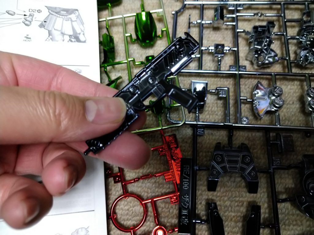 RE/100 ザクFZ型 フルメッキオーダー品に少し手を加えたものです。 樹脂パイプはブラウンで墨入れした後にゴールド塗布。 カメラアイはクリスタルピンク 各関節軸はサンディングして可動に支障がないようにしました。