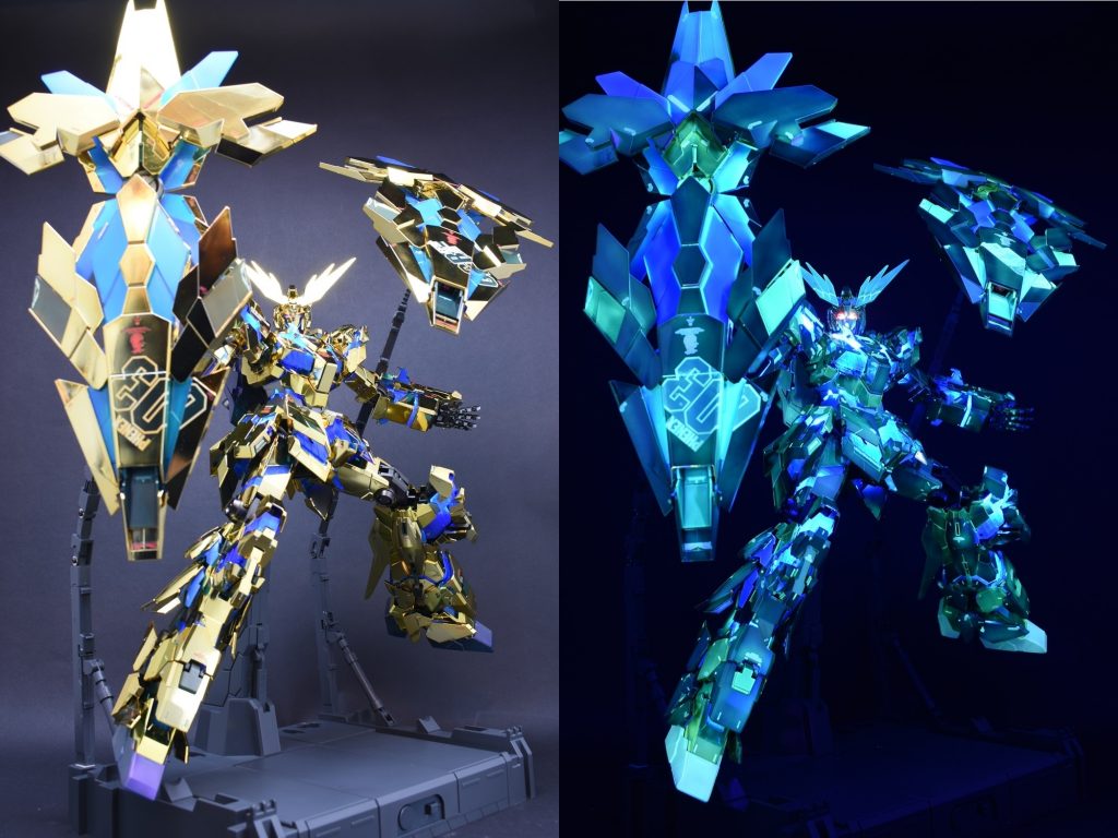 PGフェネクスにスタンドを追加し、蛍光カラーとブラックライトで浮かんでいるように演出してます。 このイメージから“虚空の不死鳥”というサブタイを付けました。