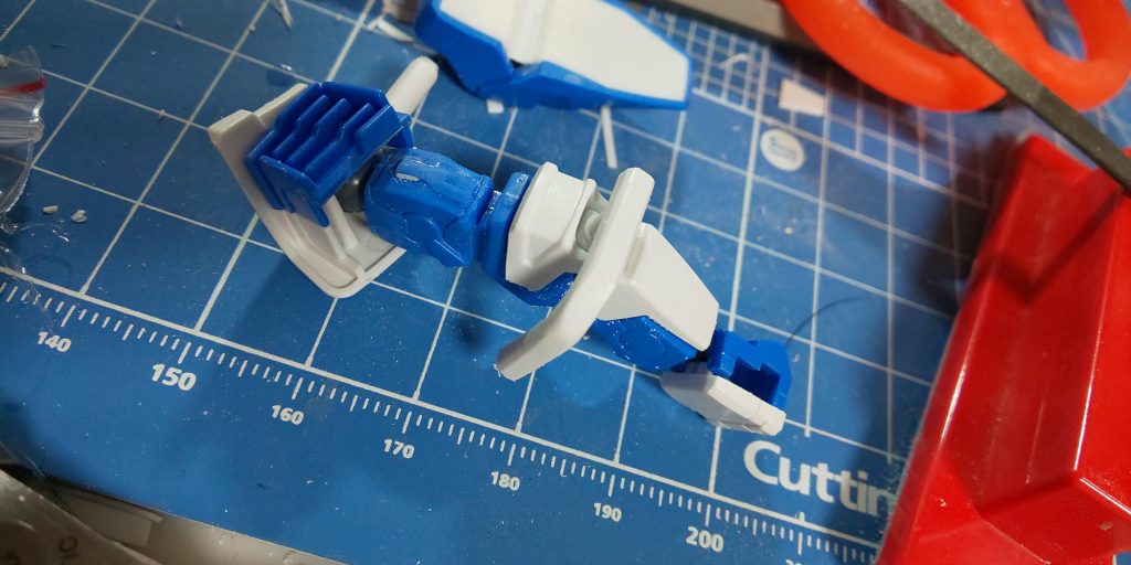 254円くらい(定価300円)のアストレイブルーフレームです。肘、膝稼働しません。立ちポーズが決まればよかったので、これでOK!ゼータプラスカラーで塗りました。グレーがグレーサフと全く同じ色になりました。。手首も固定だったので回転できるようにしてます。それだけで全然表情変わりますね。肩も挟みこみなので、差し込み式に変えてます。狭すぎてポリキャップ仕込めなかったので、肩側の軸を延長して先端にネオジム磁石。ボディ中央で磁石と接続してます。これでゆるゆるにならないし保持力もある!両方の軸盾の取り付け向きが肘側だったので側面に来るようアームを作ってます。