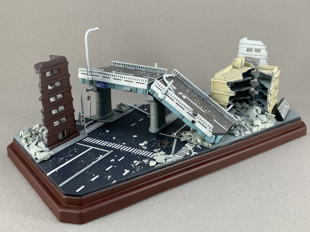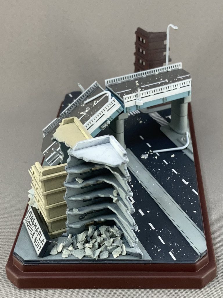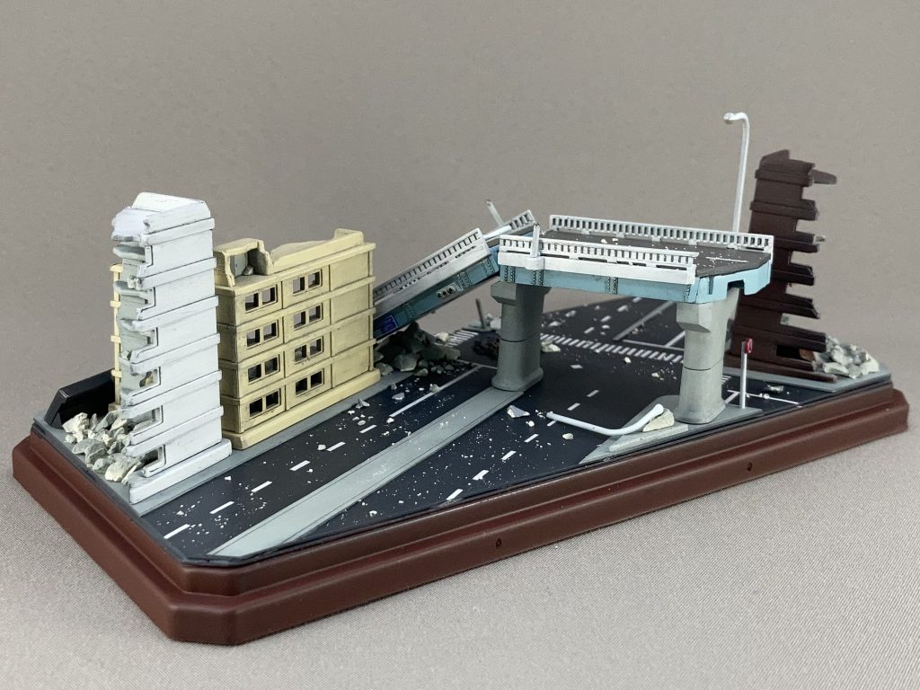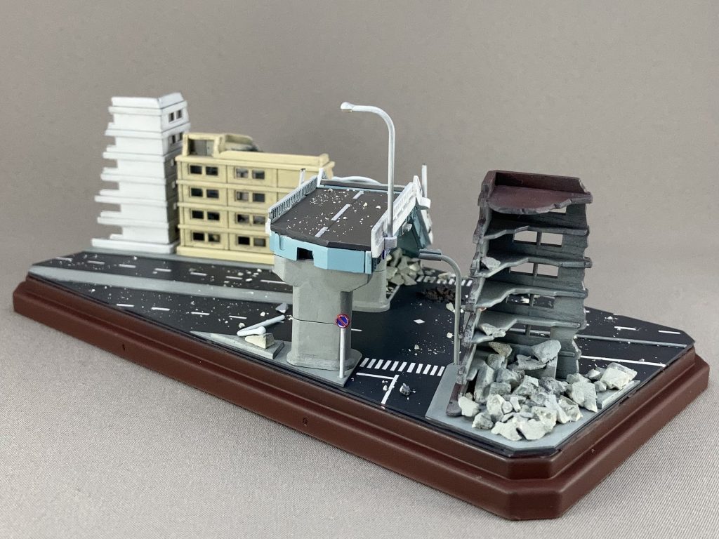 ベースはダイソーのケース。半壊ビルと道路橋はアルティメットルミナス。信号や標識はプラ棒、ランナータグ、コトブキヤのプラユニットから作りました。信号や街灯はUVレジンから。