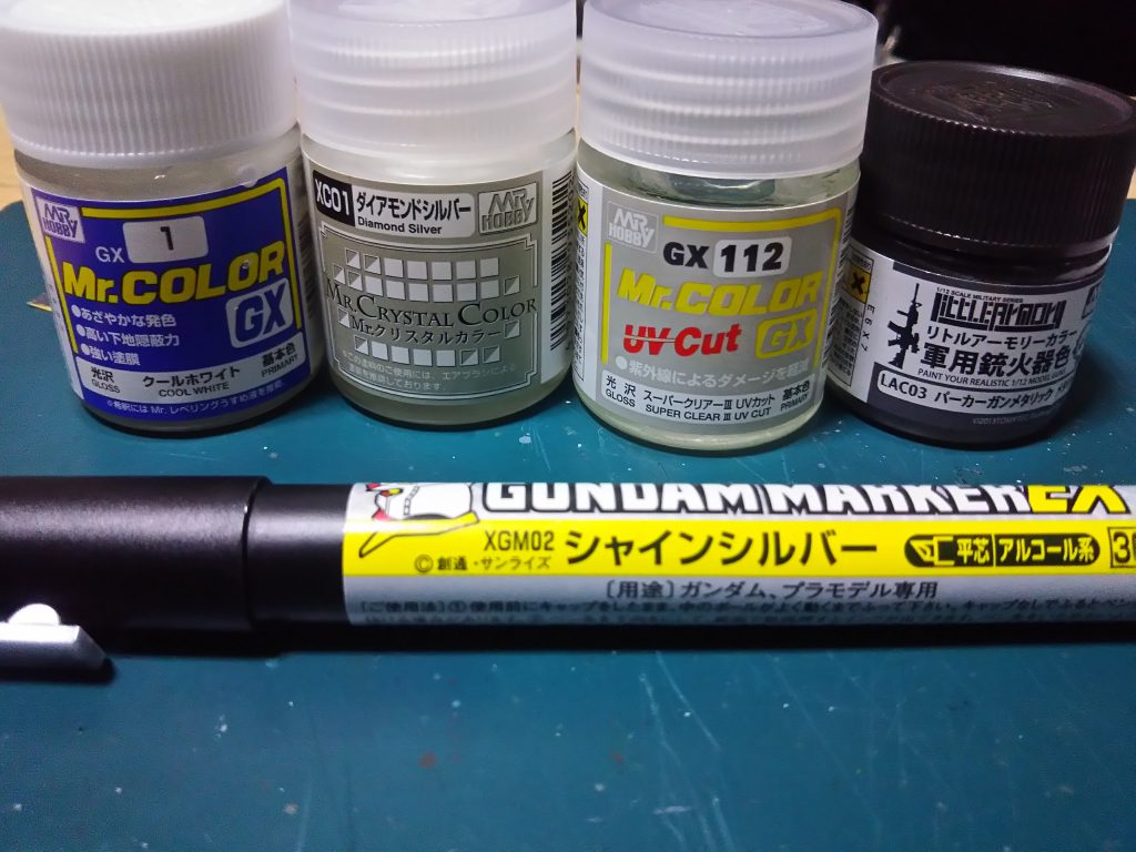 前回同様メタルプライマーを塗って、白い部分はクールホワイト、ダイヤモンドシルバー(パールコート)、スーパークリアーⅢUVカットを塗りました。タンクにはパールコートは塗ってません。