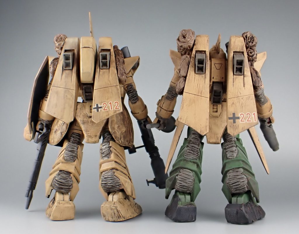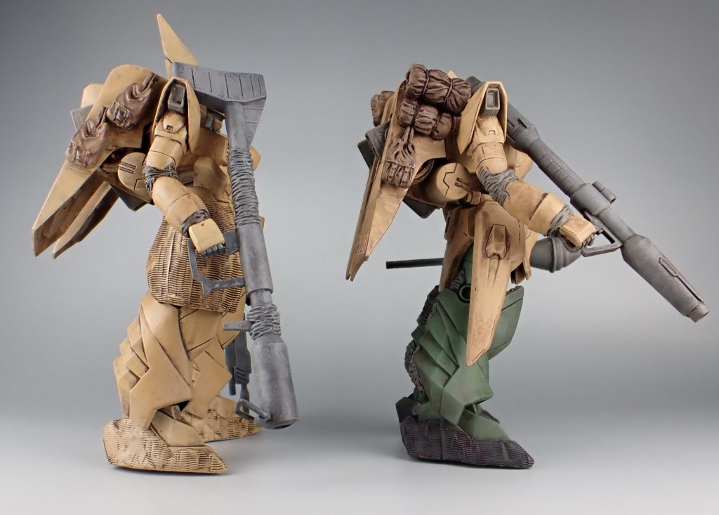 1/144 ZGMF-600 モビルスーツゲイツ完成しました。キンバライト基地のザクを参考に塗りました。前回作ったゲイツと同じ小隊の設定で、トサカを短くしたり荷物を多く背負わせたりしました。