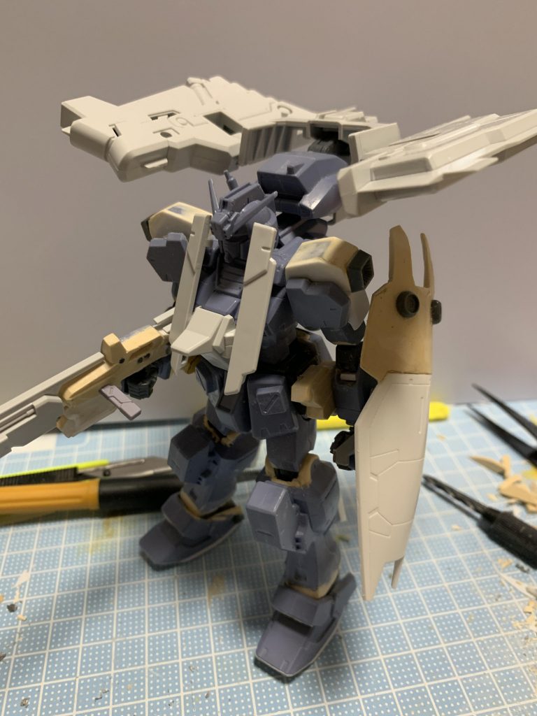 シールドは、ジム改ワグテイルのものにエポパテで上部を作成。ビームピストルは厚みが足りなかったのでエポパテ使って幅増。