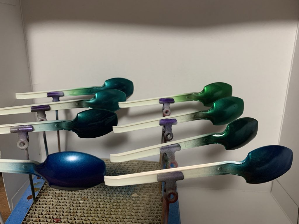 濃い緑のパーツの色は下地をブラック、その上にメタリックグリーン、そして最後のクリアブルーという組み合わせで暗い緑にしました。