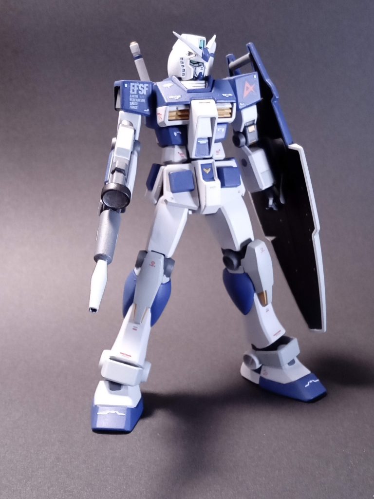 エントリーグレード・ライトパッケージのちょっと改造、ハイニューガンダムカラーに塗装です。シタデルカラーの筆塗りで行ってます。武装類が無いので、手持ちの旧キットGP01のライフルとシールドを拝借して、ボディーカラーに合わせた感じにしました。