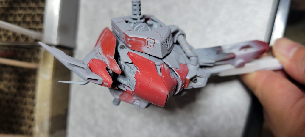 下地の色を変えることで赤色の表現を変化させました。スジボリ、プロペラントタンクの改造をおこなっています。つやありクリアで仕上げました。