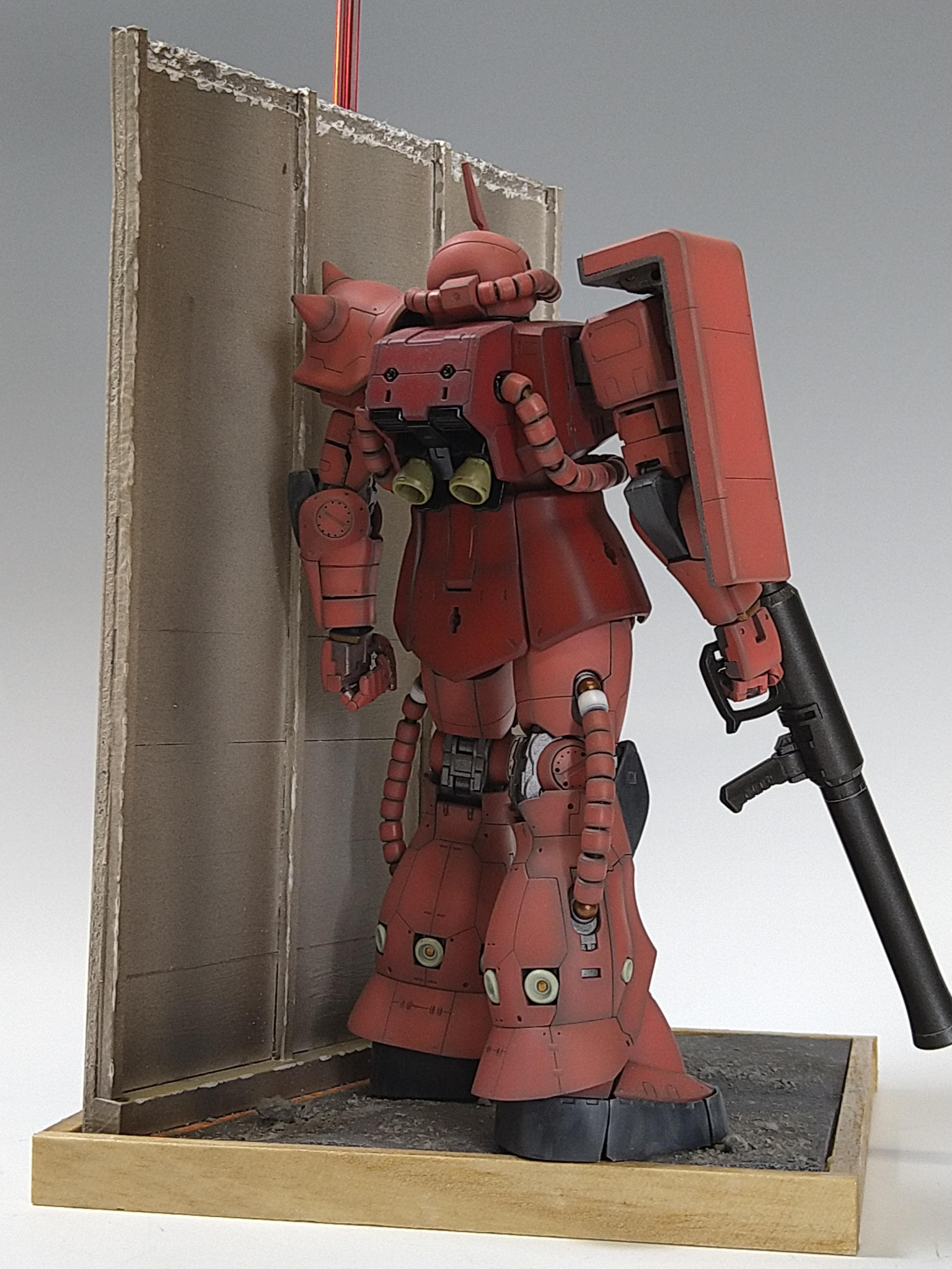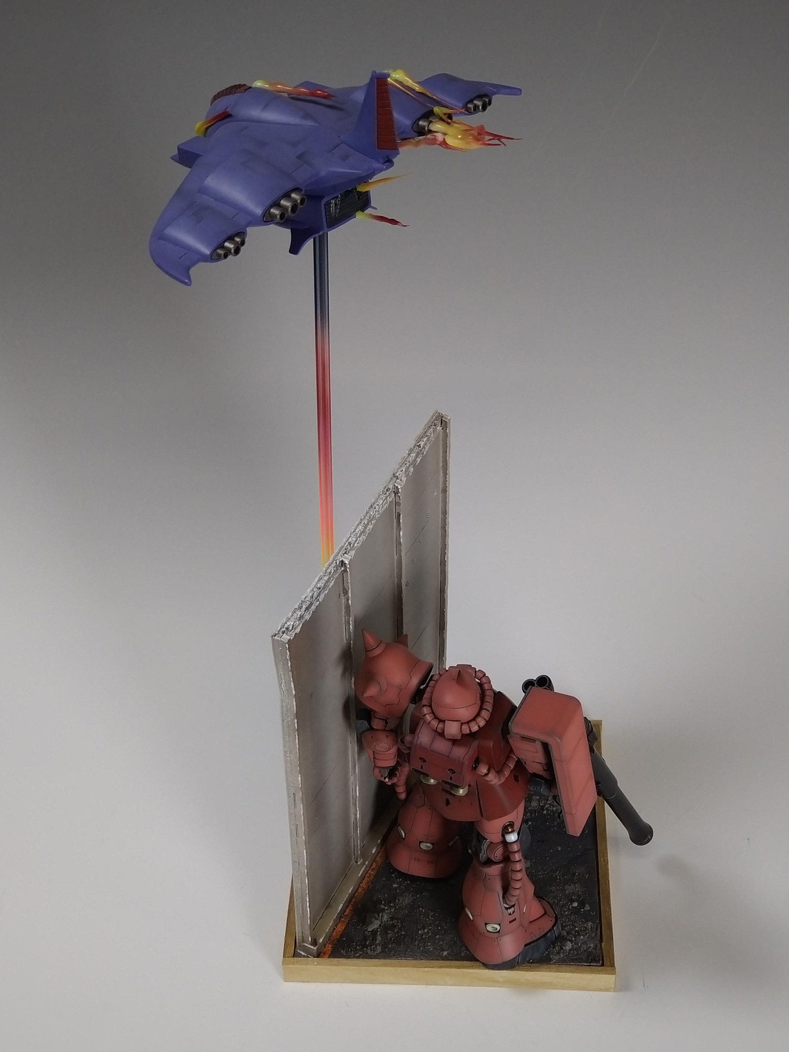 コメントありがとうございます。本物の空をバックに撮ってみました。100mm角のベースなのでほぼ真下から取りましたが、ザクの視線とガウの位置があっているように撮れ良かったです。マスキングテープが細く一部反対側にラインが出来てしまったところがありますが、そのままにしました、、でも完成したので良しとしています。