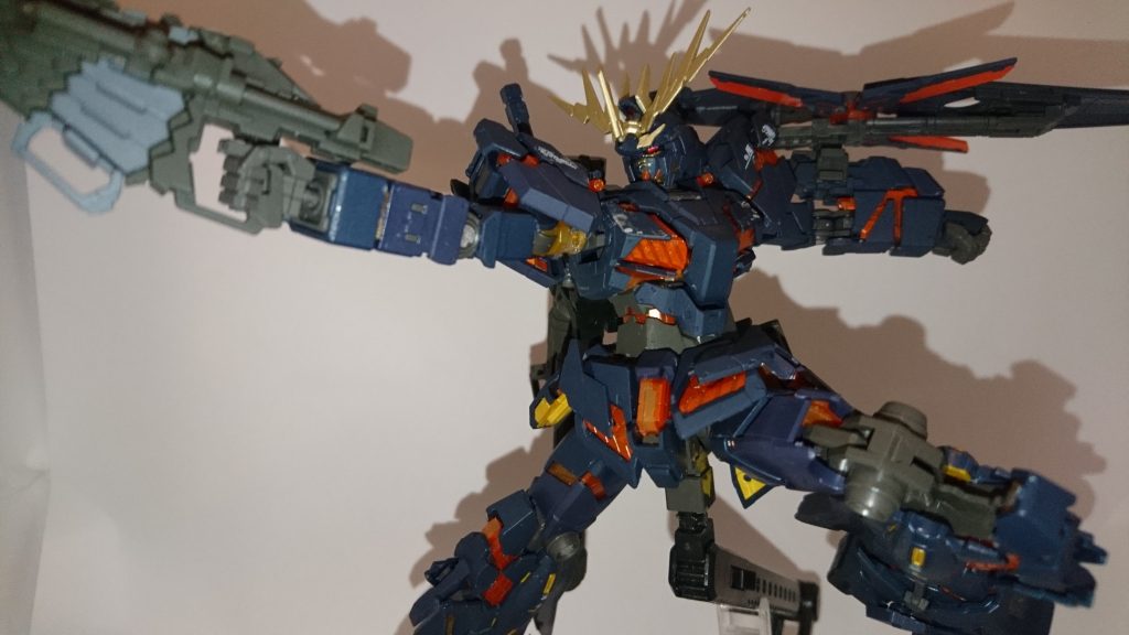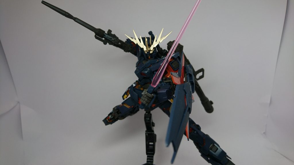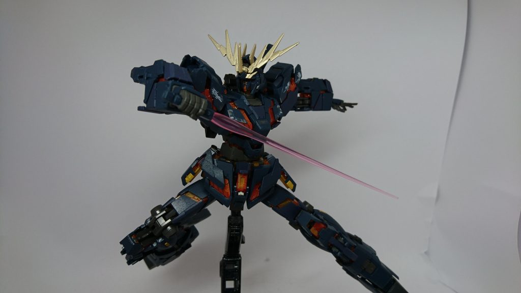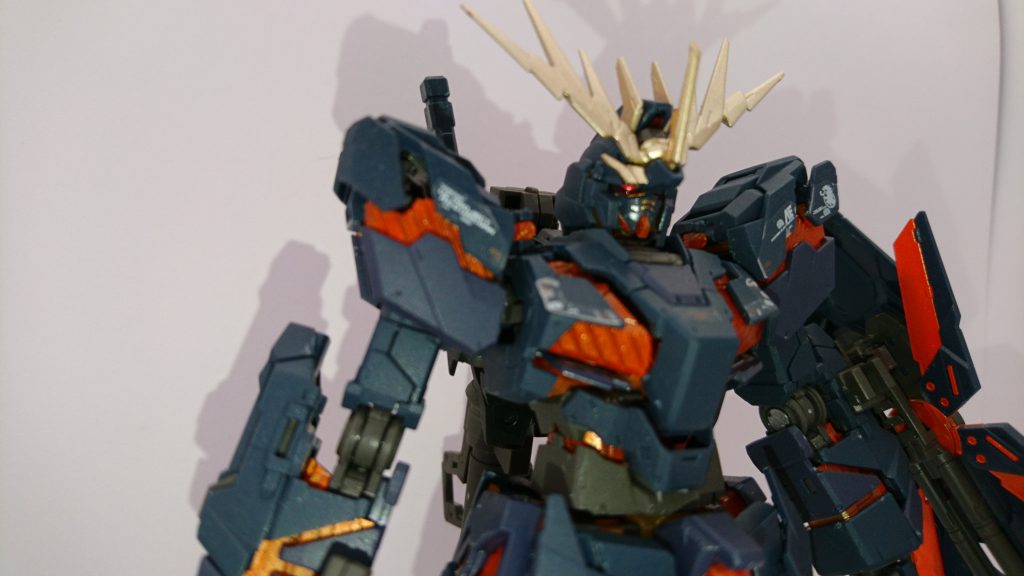 RX-0 バンシィ(小説版)です。金色のパーツをメタルゴールド、サイコフレームを薄くメタリックオレンジで塗装しています。 武装はノルンではなく、完全に小説仕様。 怒れるリディ少尉をイメージして、サイコフレームの色を強めの色にしました。