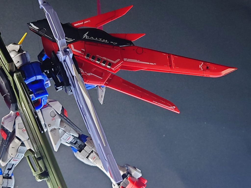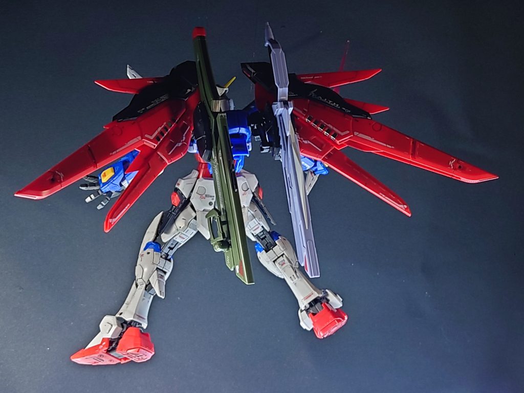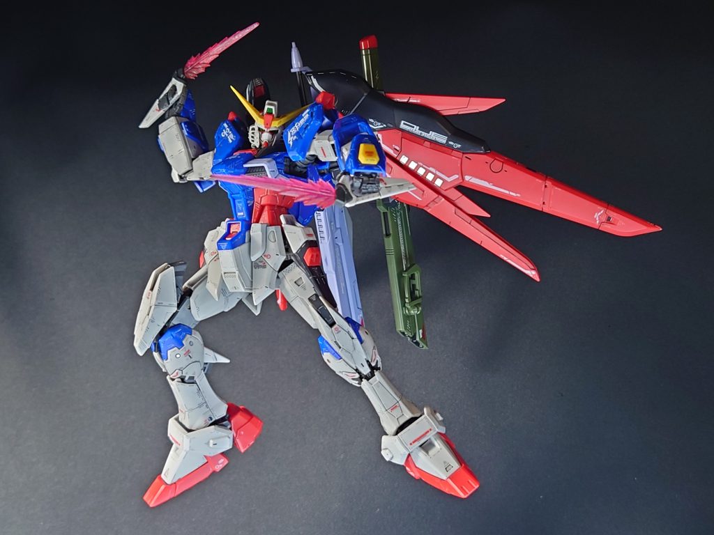 ディティールアップはしましたが、無塗装で墨入れと付属シールで仕上げました。RGなので元よりディティールが細かいですが、どちらかというとフレームによる可動を表現するための装甲分割ですね。装甲面が割とシンプルだったので、1装甲に1ディティール追加するようなかんじにしてます。