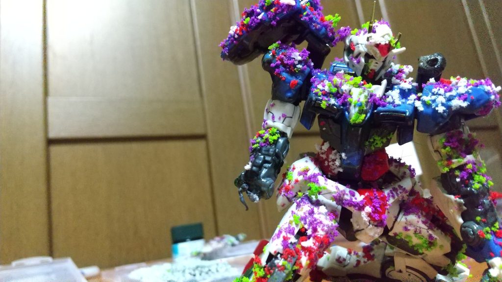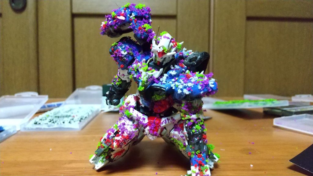 今見ると体勢をもうちょっと前かがみにしても良かったなぁと思いますが、花をつけるために接着剤をあほみたいに付けたのでガチガチに固まって動かせなくなりました(笑)
