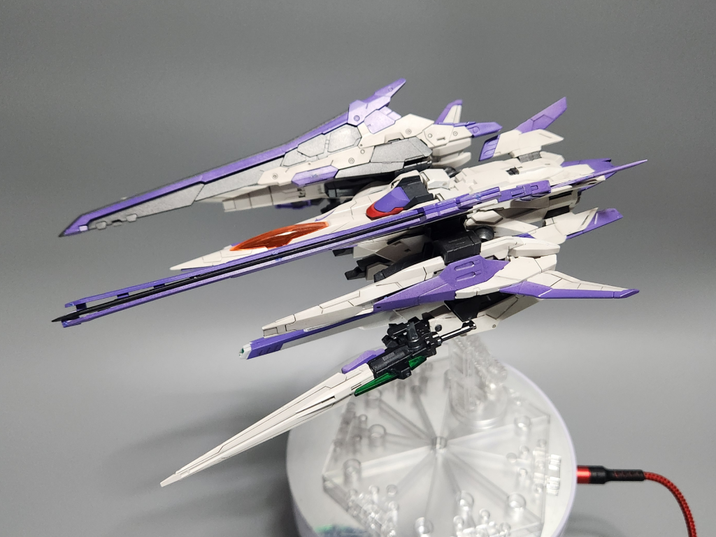 後ろから見た感じGNヴェスバー保持アームは一見ザンユニットに付いているように見えますがオーライザー本体左右の尾翼ポイ部分に3mm軸で付いてます