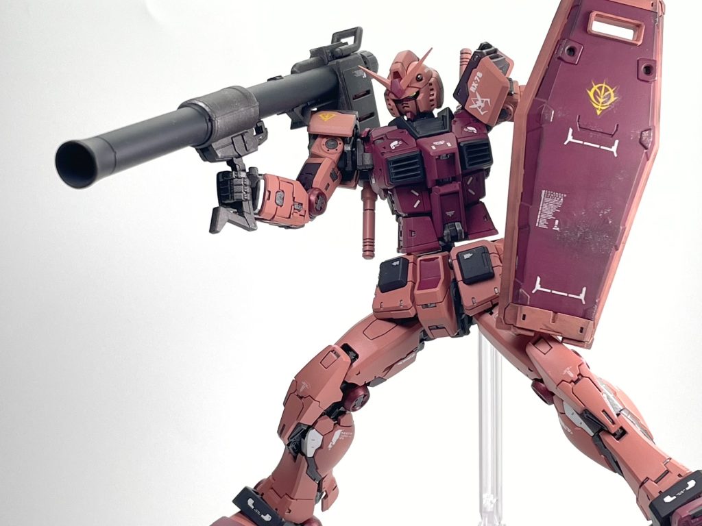 キャスバル専用機は連邦の星マークが無いのでスカート部とシールド部はパテ埋めしました。シールド部は少しパテのヒケがあったのでウェザリングを強めに施し、弾痕の凹みのように表現しました。シールドなので説得力が出たと思います。
