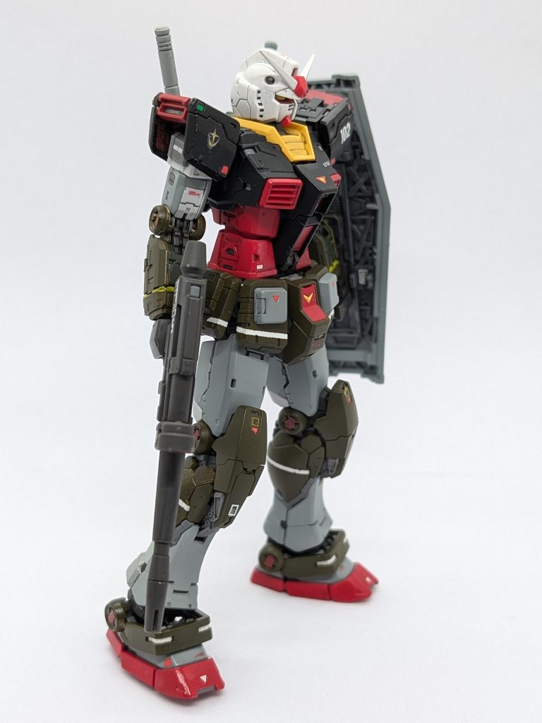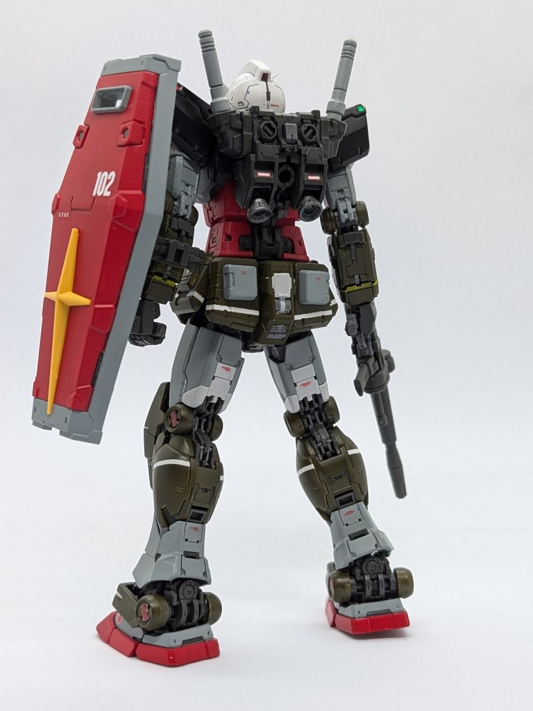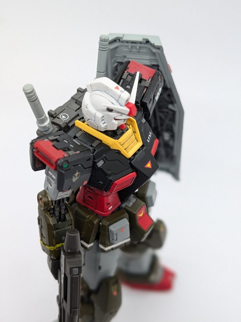 成形色でも十分カッコいいRG2.0をちょっと変えたくてリアルタイプカラーでエアブラシ塗装。汚したい気持ちを押さえて、ホビージャパンの作例に寄せました。頭部と腰部は違いは分かりにくいのですが修正しています。