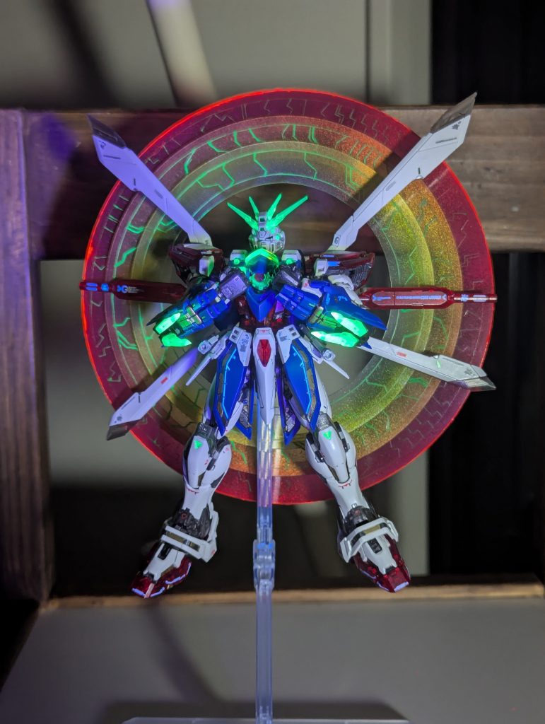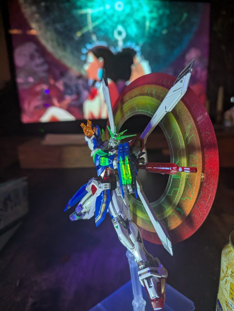 せっかくゴッドガンダムだし、日輪エフェクト必要だと思い、中古品をどうにか安めの値段で見つけ、年越しの一発目で友達に送った写真です。UVライトでこんなに光るんですね!しかも、中華製のデカールも光るとは。もう紅白とかどうでもよくなって、ひたすら写真撮ってました(笑)