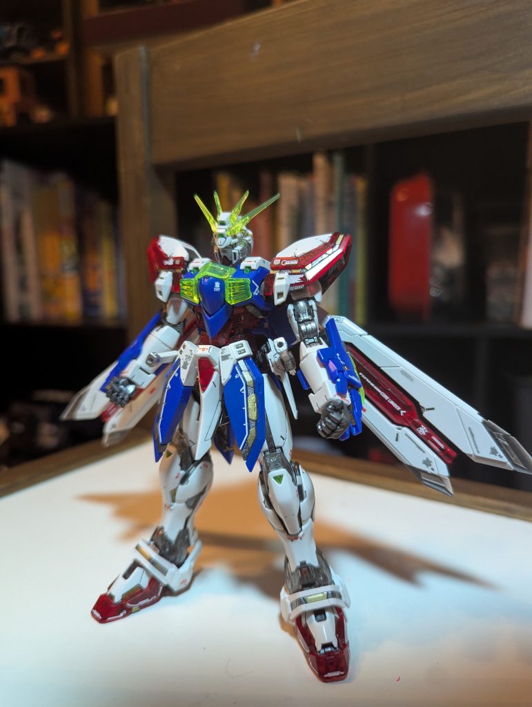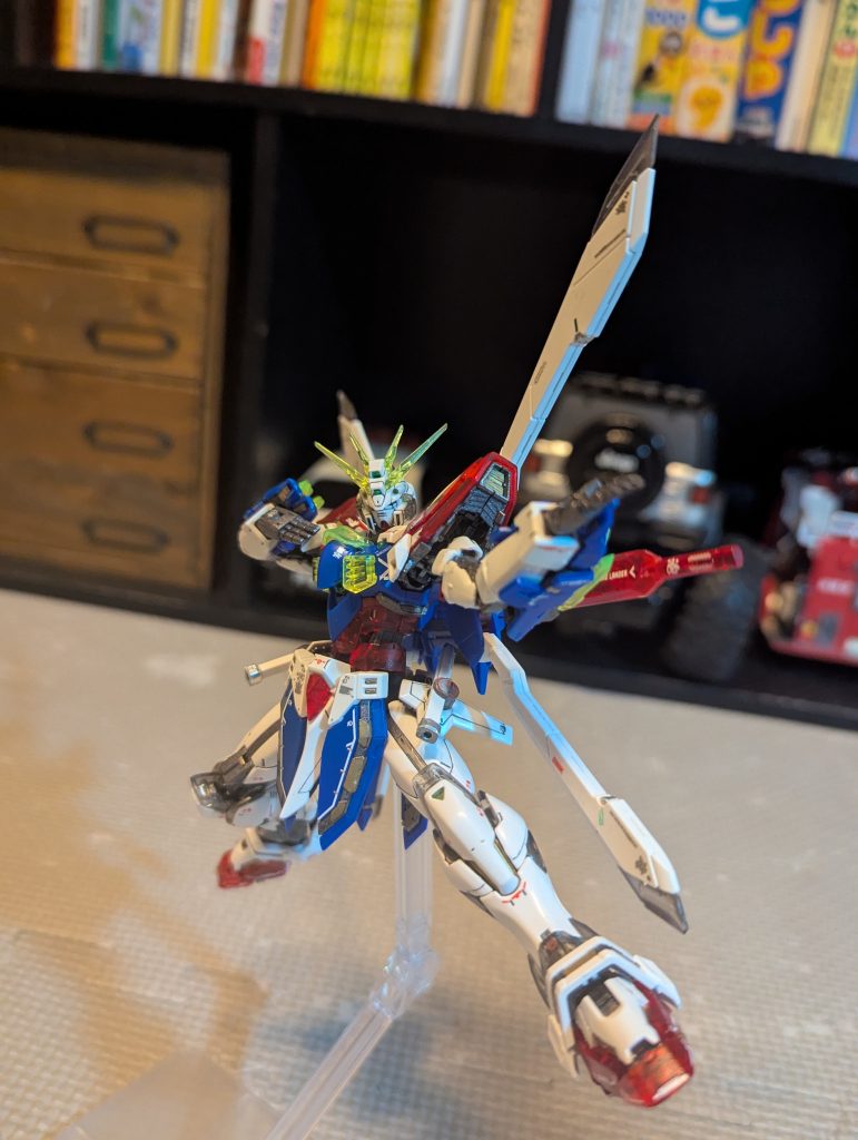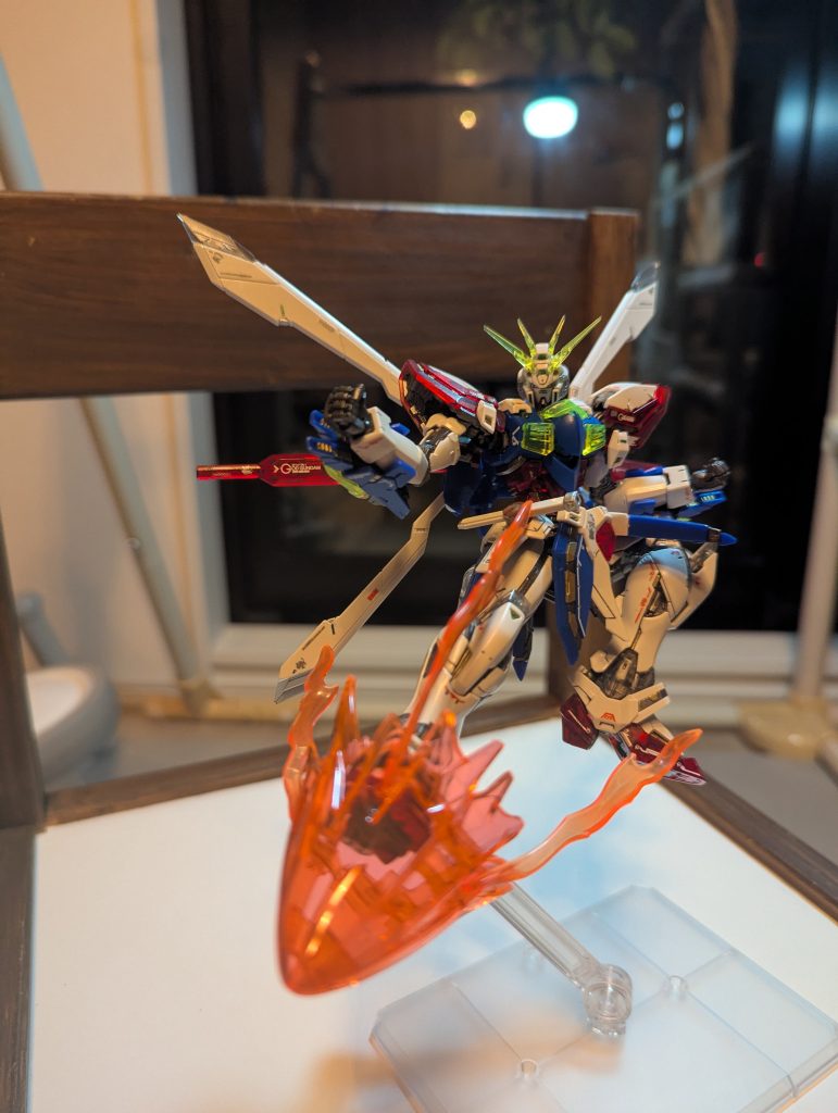 ダメ元でやったガンダムくじで引き当てた、ゴッドガンダム。小学生のころいつかは作ってみたいと思って、なんと念願かないました。やれることいろいろやってみました!