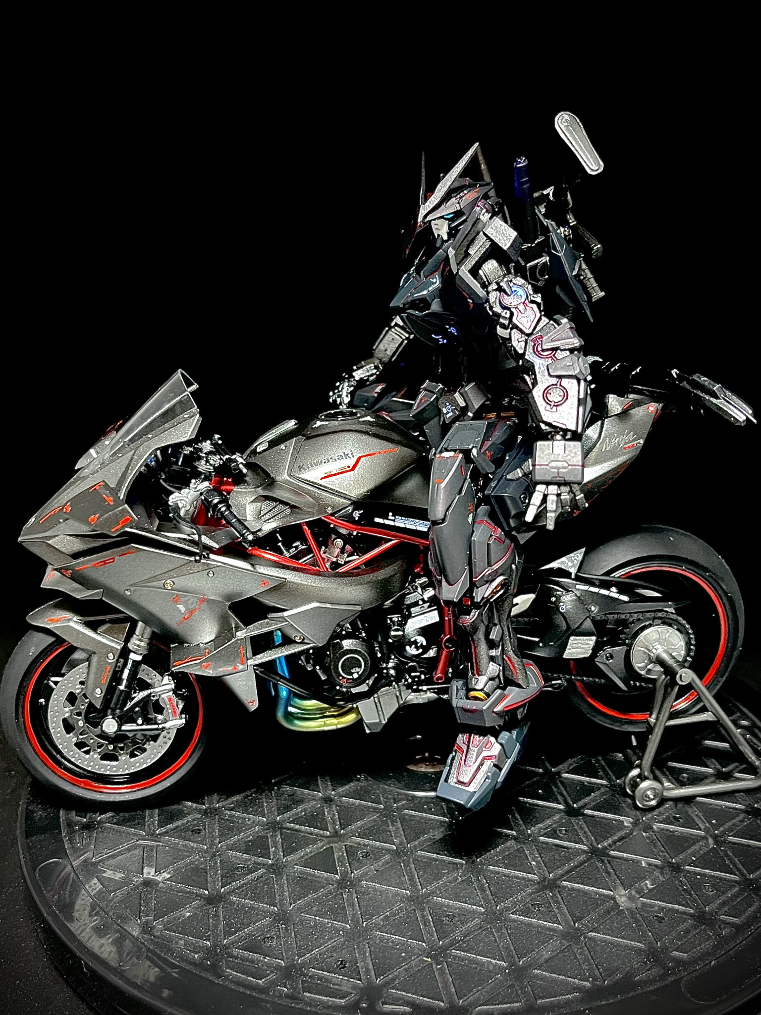 ZRXと言えば緑!くらいに緑だと思うんですH2Rも🤩でもこの鋭い車体にアストレイを乗せたくて乗せたくてつい😍いつかドゥカティにGQシャアザクを乗せたいです🤣コメントありがとうございます✨