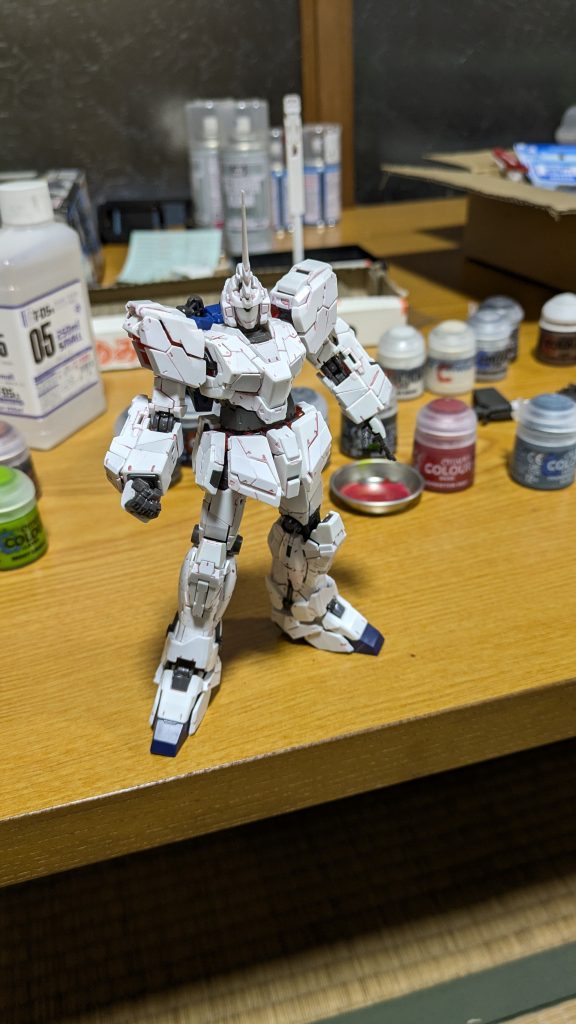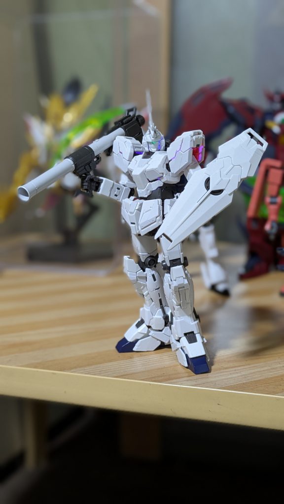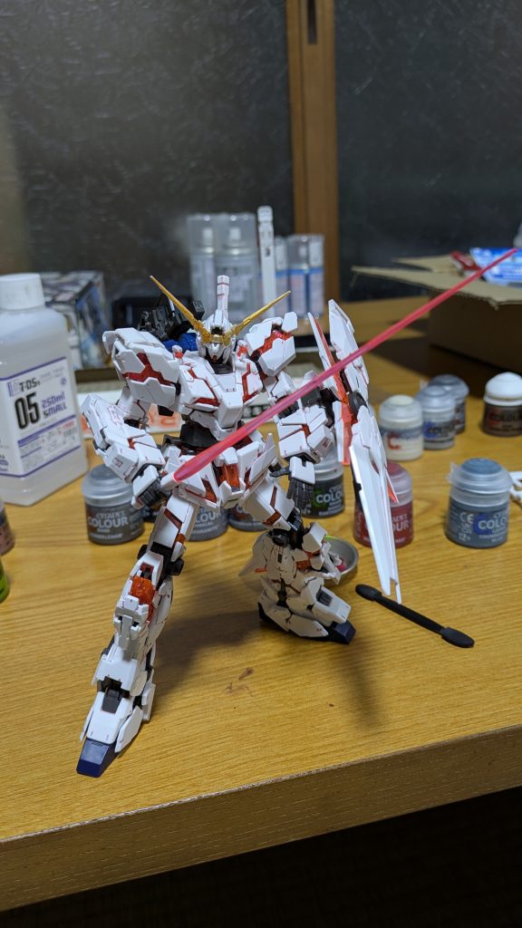 RGのユニコーンガンダムを組みました。光らせるぞーって意気込んで蛍光塗料買ってきたら、最初から光る素材のクリアーパーツでした😅