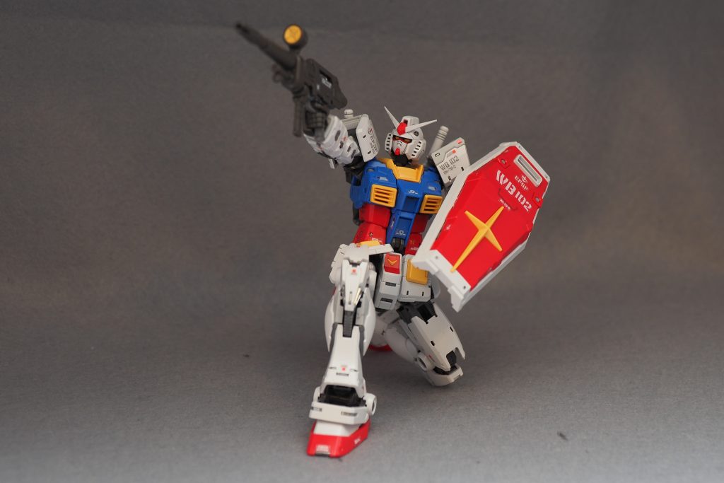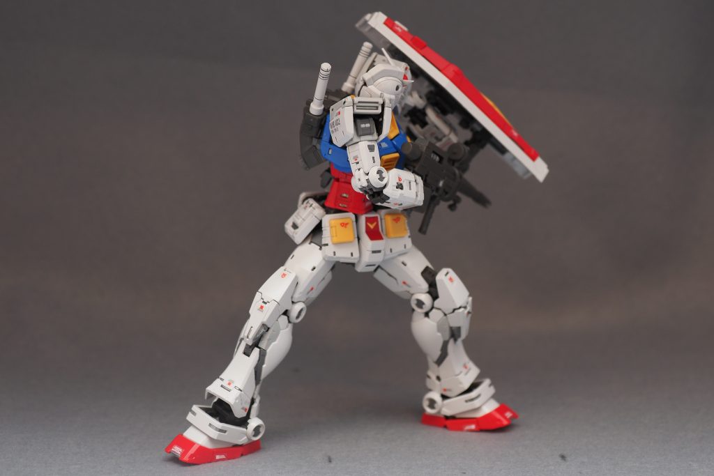 RG RX-78-2ガンダムver.2.0 成形色簡単仕上げです。外装を中心に目立つパーツはすべてヤスリでゲート処理を行い、デカールを貼った後つや消しスプレー、Mr.ウェザリングカラーのマルチブラックでウォッシングしてウェザリングマスターのシルバーで軽くドライブラシを行っています。