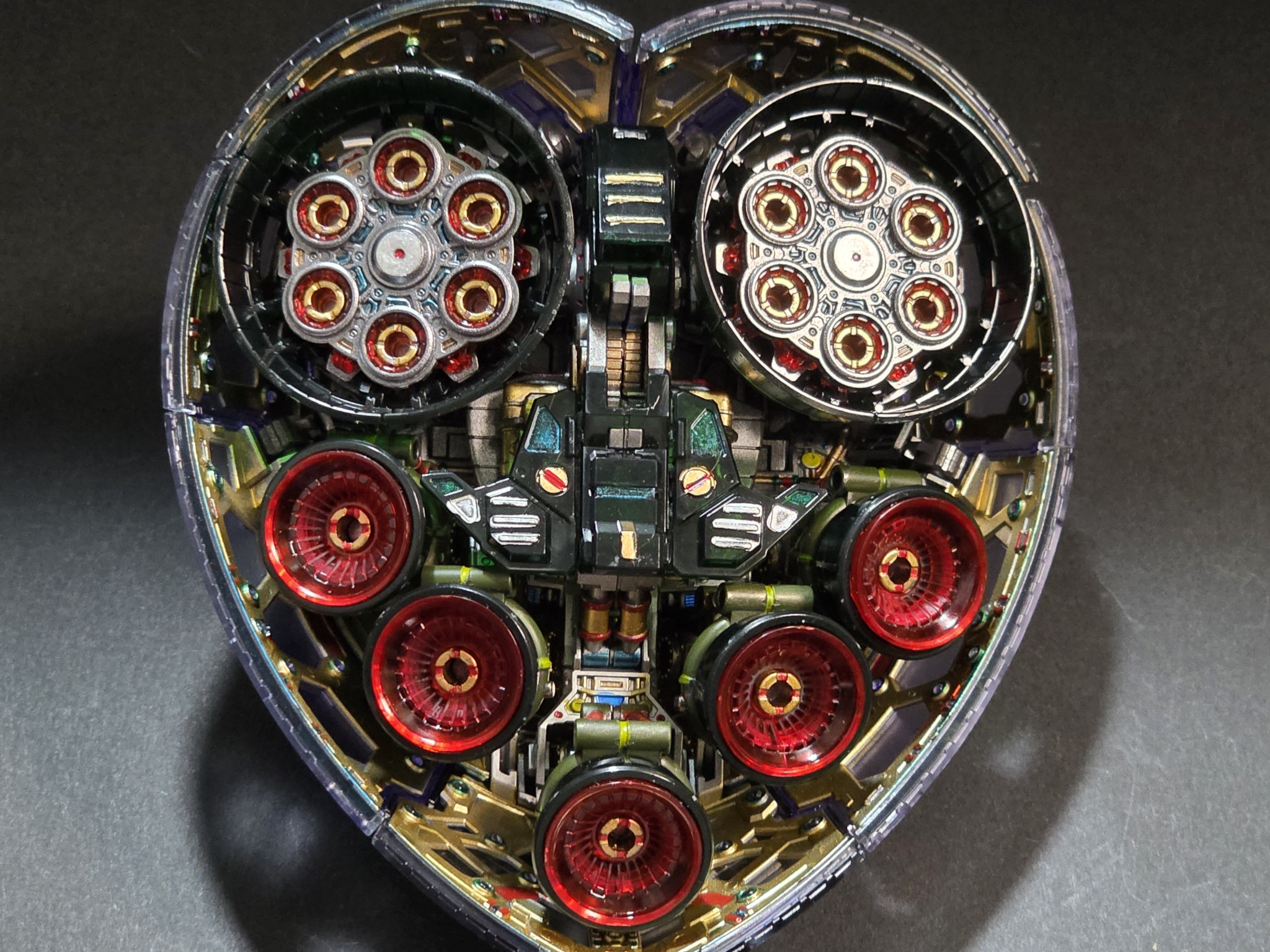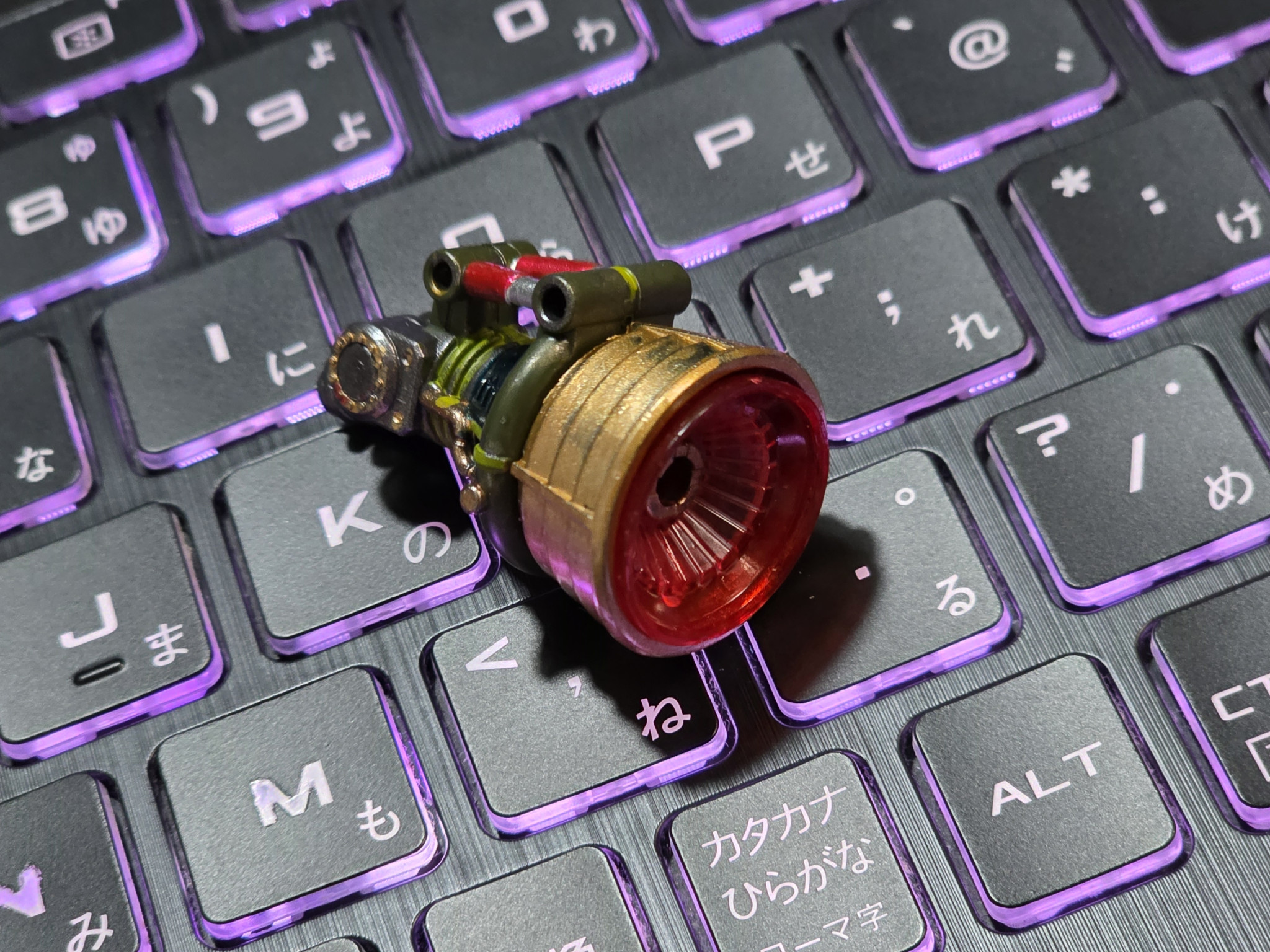 スラスタ-は6個あるので1個余る。クリアパーツは塗らずに成型色そのままにしたが、グリーン部分だけは塗ってもよかったかも。お試しでスラスタ-カバー?をゴールドにしてみたが、この方が内部の赤が際立ってより映えたかも。