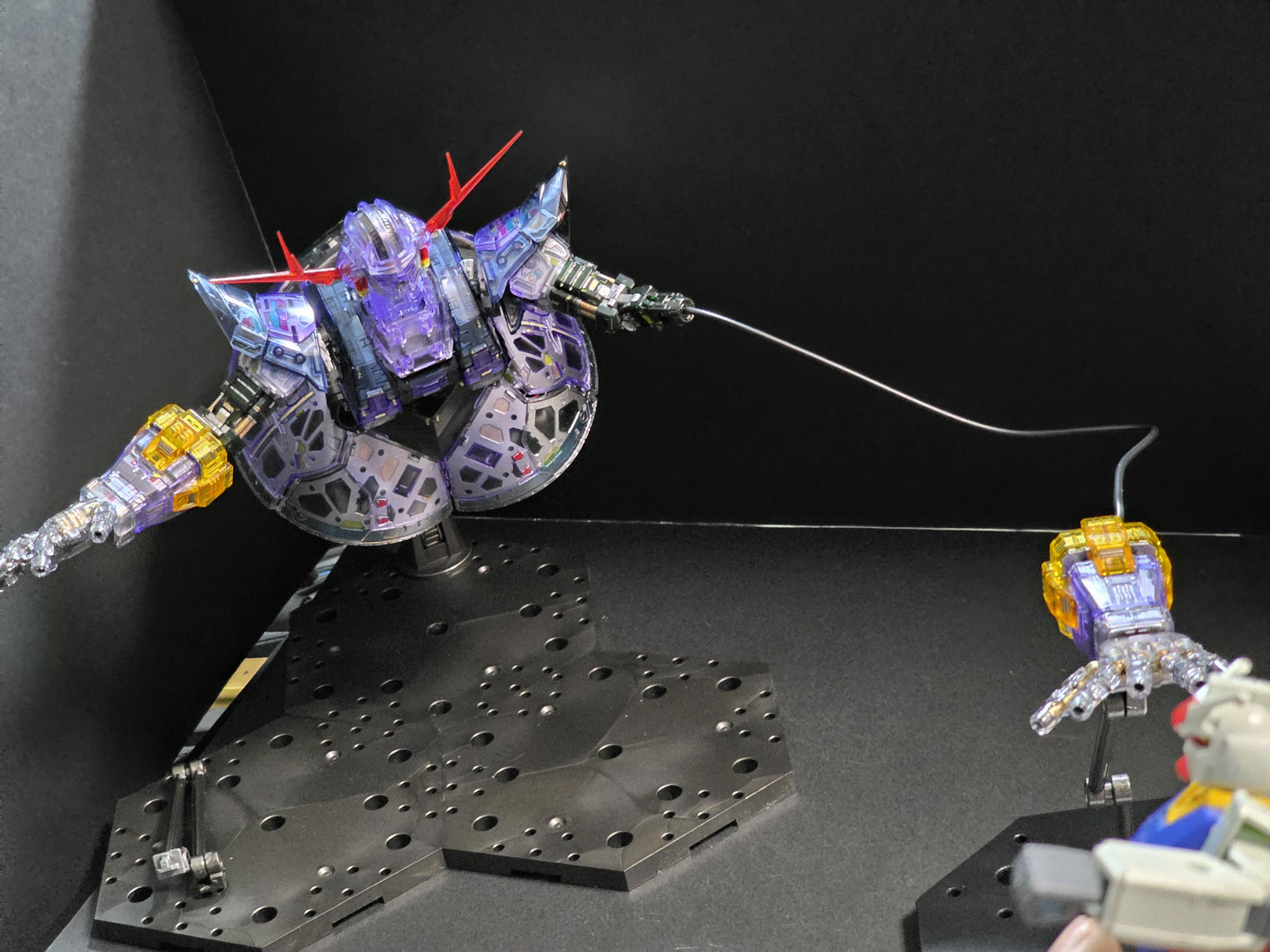 遡ること数ヶ月。初めて当選したガンダムベースを息子氏と訪れた時に購入したRGジオングクリアカラーバージョン。ちょうど「ジオング作ってみたい」と息子氏が言っていて、中古のHGにするか、近々再版予定のRGにするか、と話していたところに出てきたガンベ限定アイテム。スペシャルコーティングもあったが、お値段的にも手頃なクリアカラーを選択してしばーらく積みプラしていたもの。