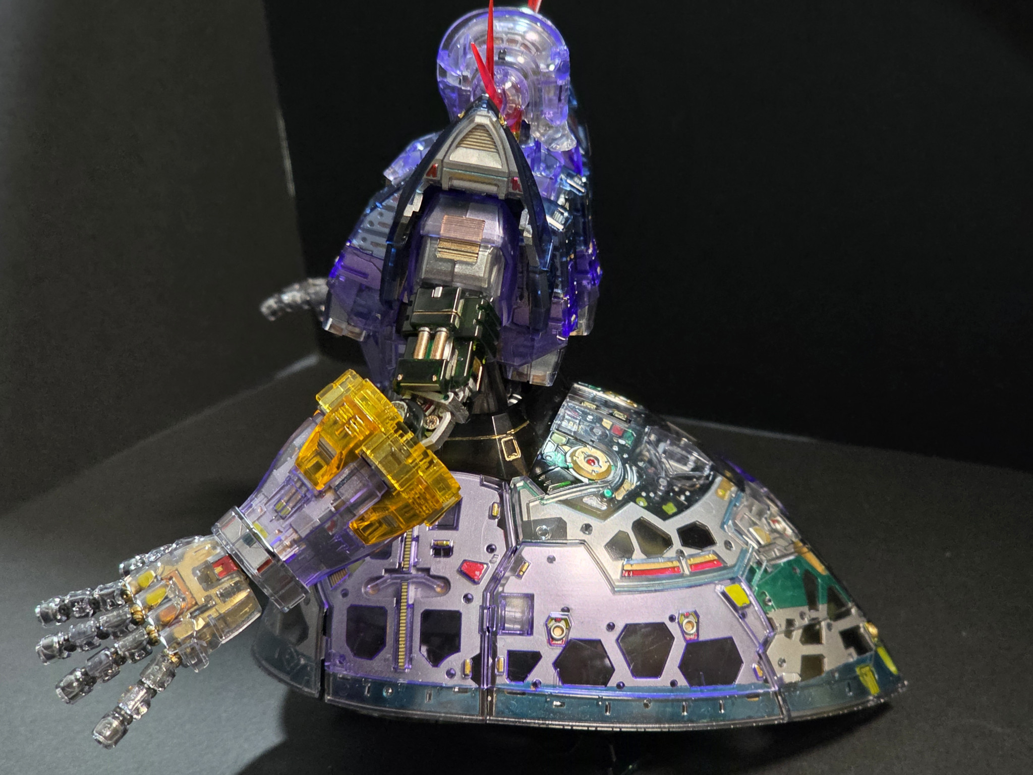 手は指部分がアドヴァンスドMSジョイントになっていて、外装のクリアと軸のABS樹脂の塗り分けが難しいかったものの、手のひら部分をゴールドにして細部を彩色したところなかなかの仕上がりに。