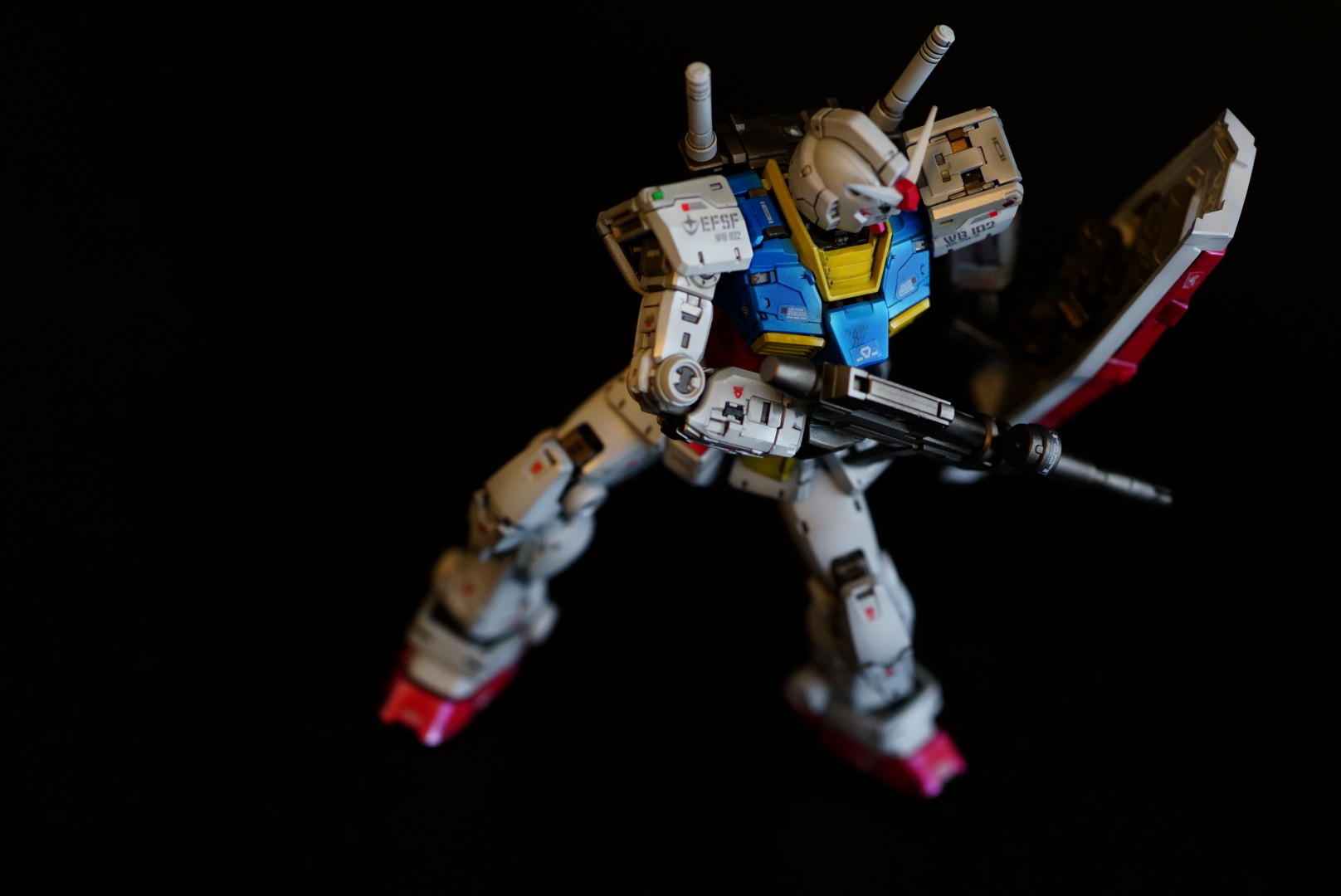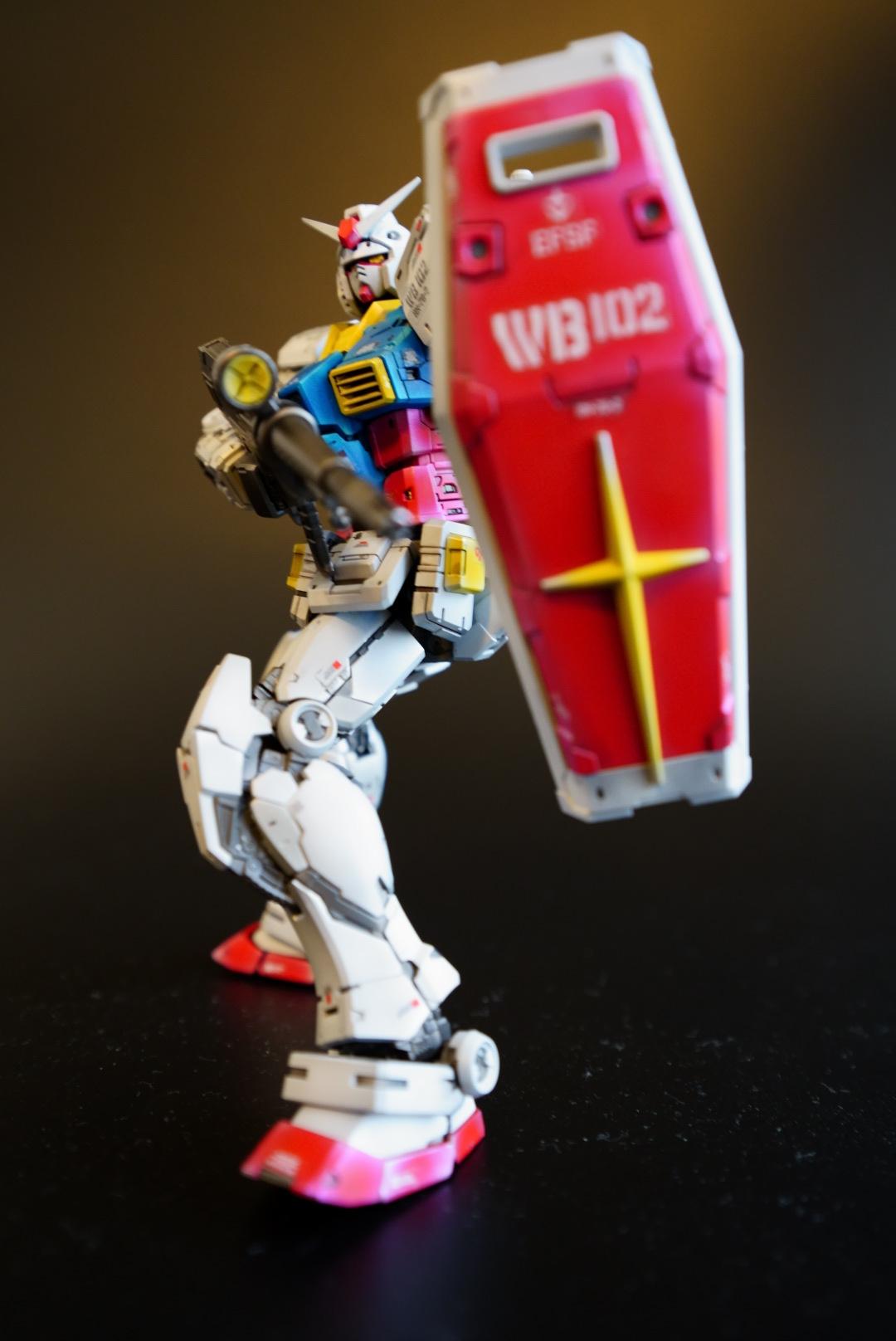 RG ガンダムVer.2.0 可動域が段違いですね。いろいろなポーズができ感動。シルバー立ち上げのグラデーション全塗装で、ちょっと塗装が剥げた感じを出してみました。トップコートはセミグロスクリアーて仕上げ。白の部分はシルバー立ち上げの感じが写真だと分かりづらくて残念。ダークステンレスにすればよかったかな。