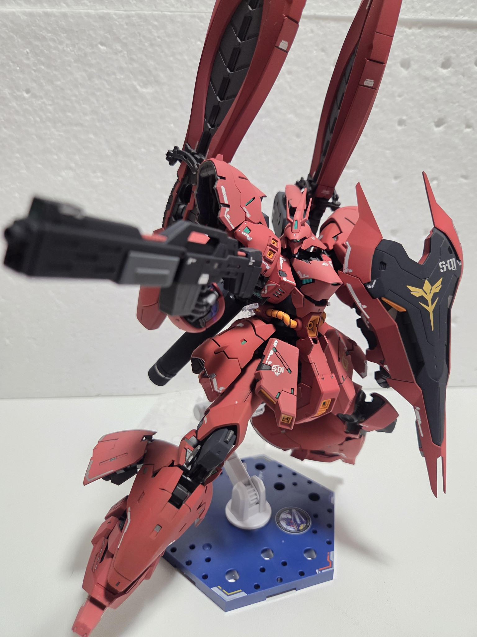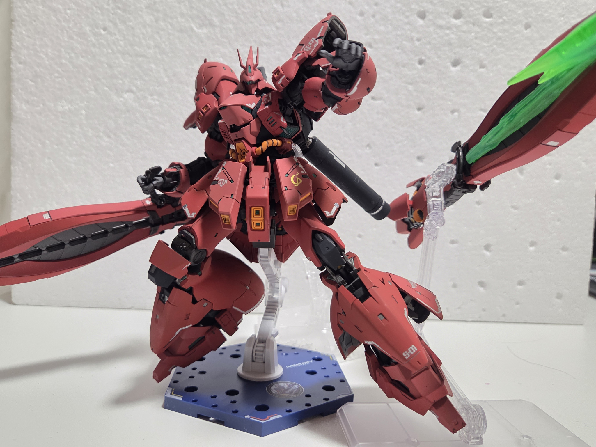バッチリ決まったと思います。色々展開ギミックはあるのですがしなくてもかっこいいですね。後期のRGなのでそこまで複雑ではなかったのですが胴体の後ろの部分と腕の付け根が干渉するので削る必要があるのだけちょっと気になりました。けど作りがいのあるいいキットでした。
