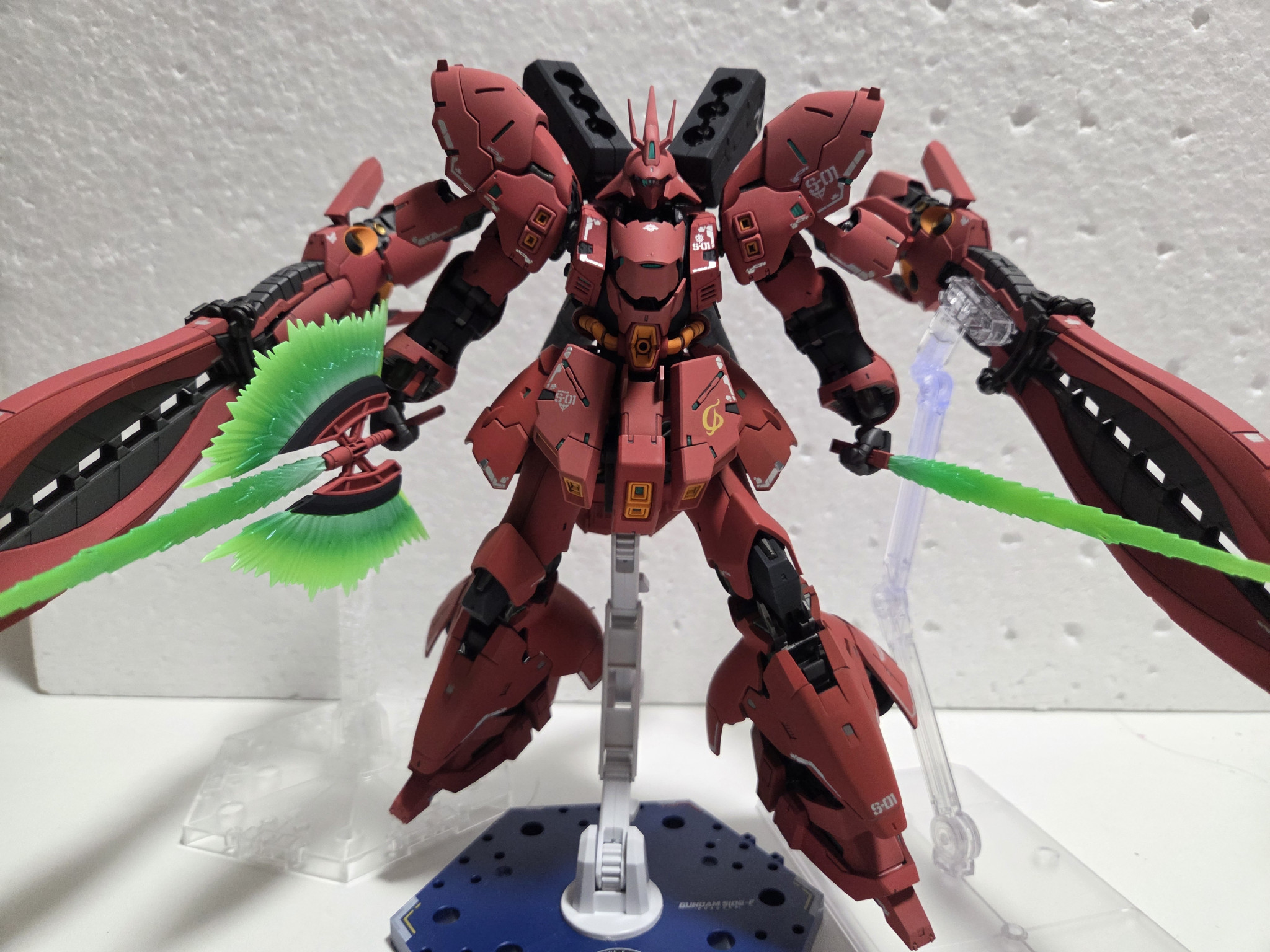 基本は説明書裏のカラーチャートで塗装し、つや消しトップコートを吹きました。フレームはメタリックにし関節などの見えるところにつや消しを吹き重厚感のある感じにしました。また、フレームが見える場所は サイコフレームを意識してクリアグリーンに蛍光グリーンを混ぜたものを塗りました。