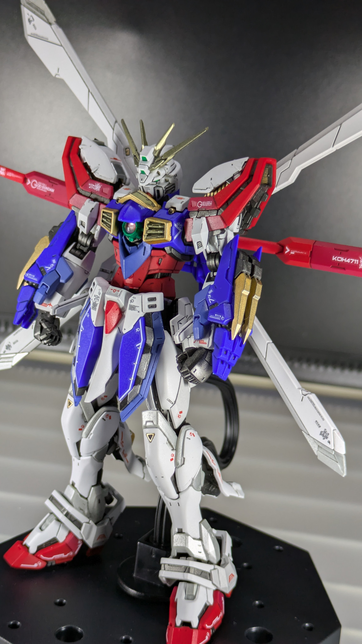 当初このキットは買う予定もなく、皆さんの作例をため息を漏らしながら見ているだけの物でしたが、以前投稿させていただいた「RG シャイニングガンダム」がバンダイ様公式の景品で当選し、入手した経緯から俄然、この「RG ゴッドガンダム」も並べて飾りたい!という気持ちになり、またなんとかこの人気のキットを入手する機会もあったため、今回の作品となりました!