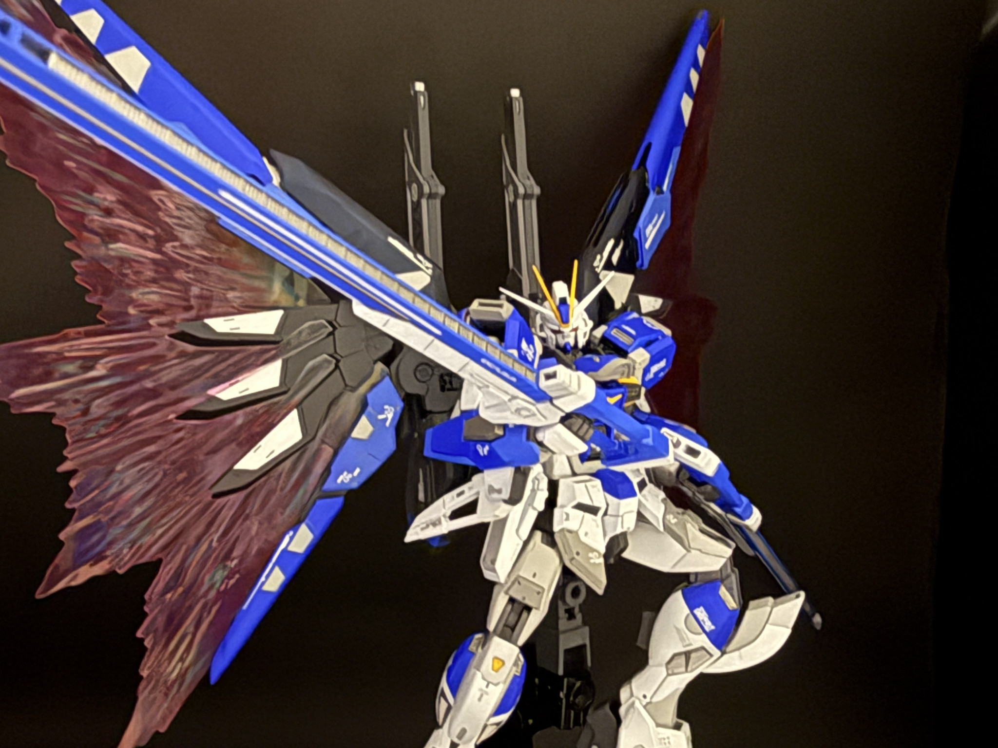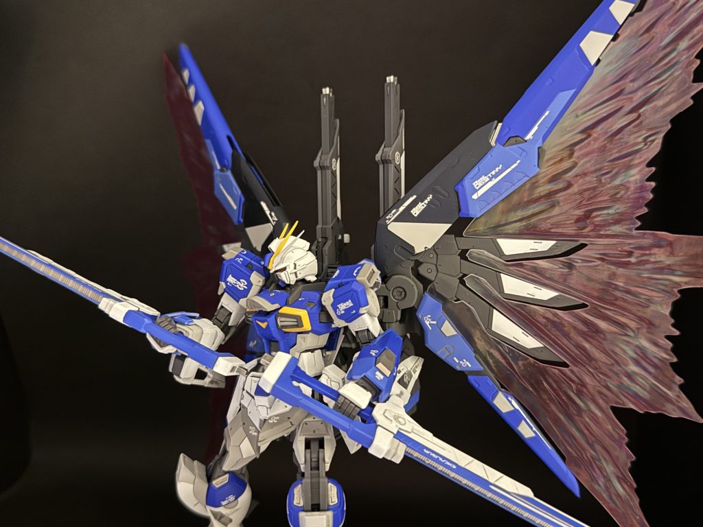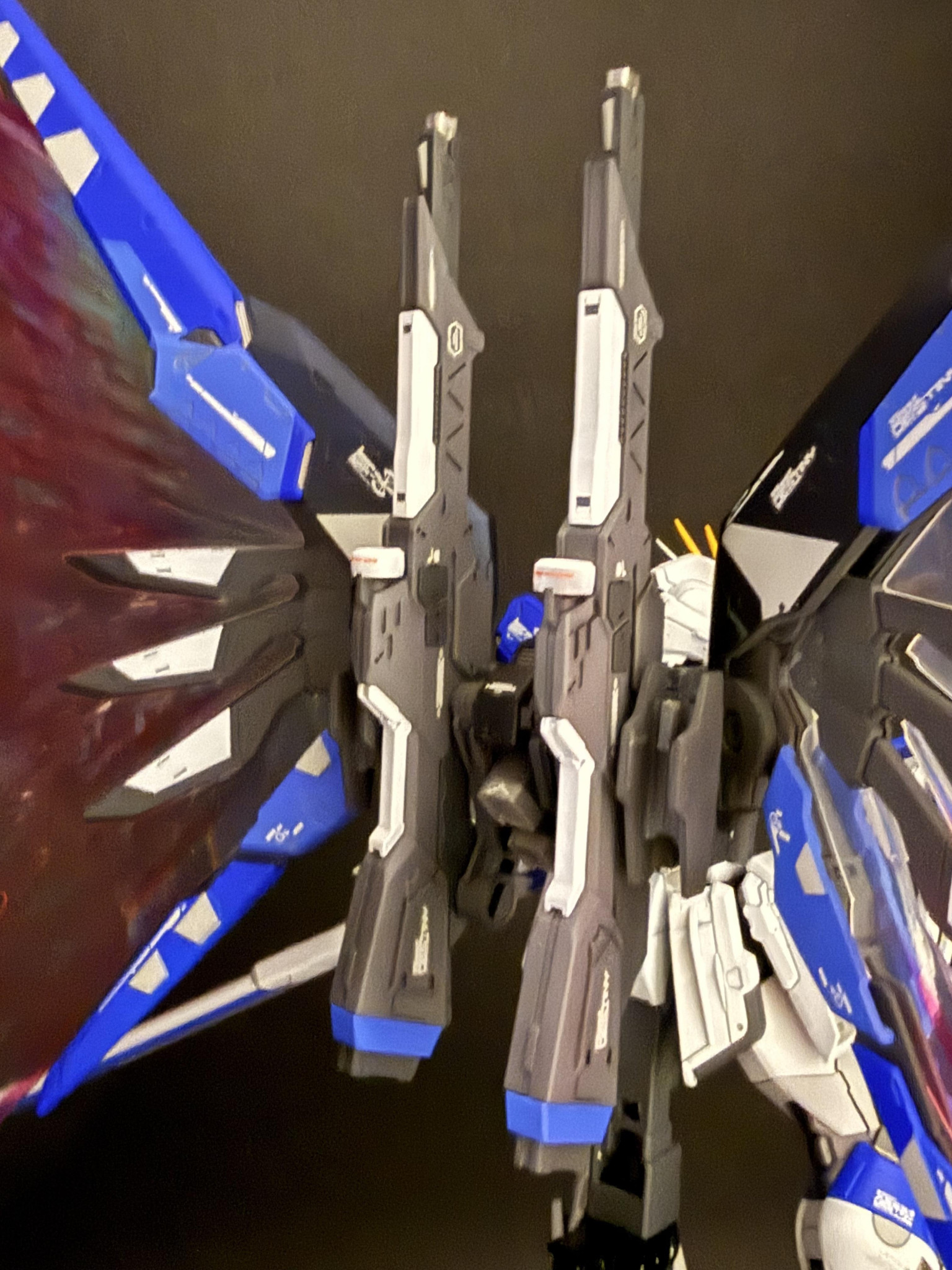 設定の3号機はもう少し青多めのようですが、全体的に明るくなりすぎてしまったので羽の付け根とバックパックをプリズムブルーブラックにして少し落ち着いた印象にしました。羽の先端の塗り分けは明るかったかな…どうもてんとう虫っぽい印象を受けたのですが、長いこと眺めているとこれはこれでありかなと笑