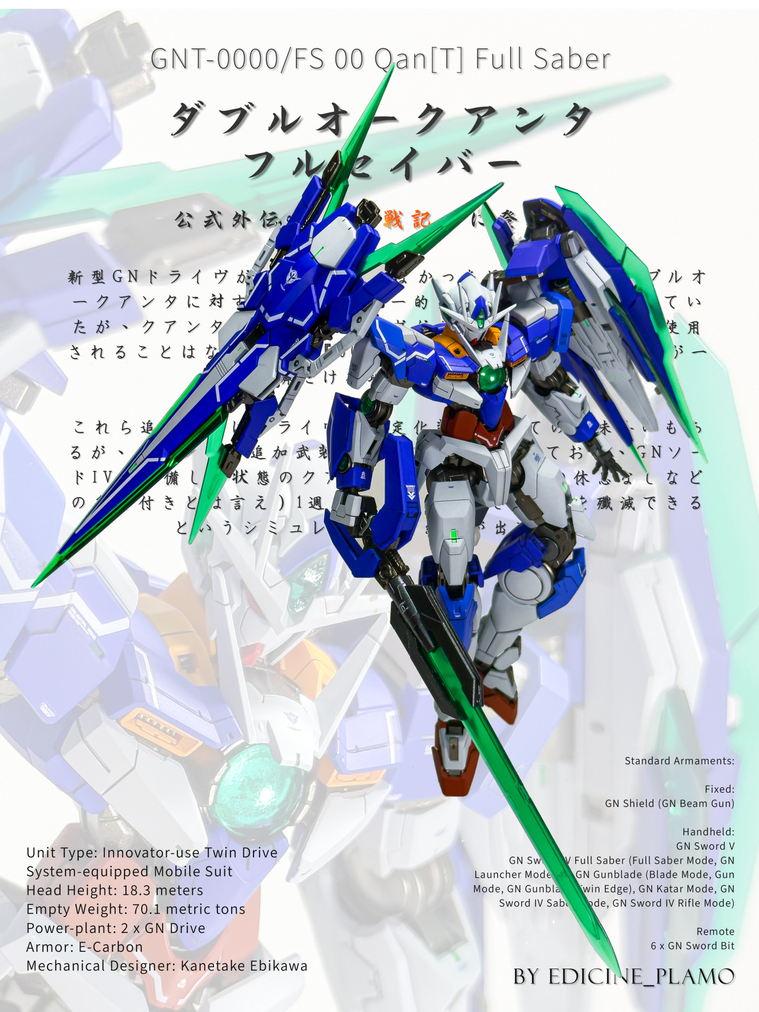 このメインポスターは基本的なスタジオ照明を使い、マクロ撮影で仕上げました。ポスターの文言は00Qan[T] FSの公式説明から引用し、その他の詳細はFandomから取得しています。