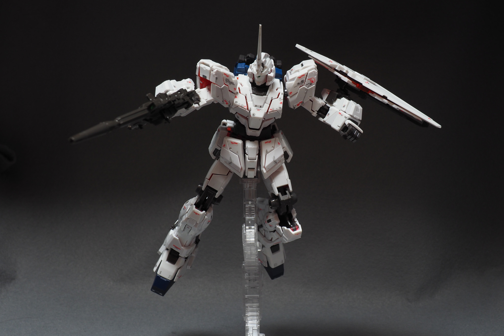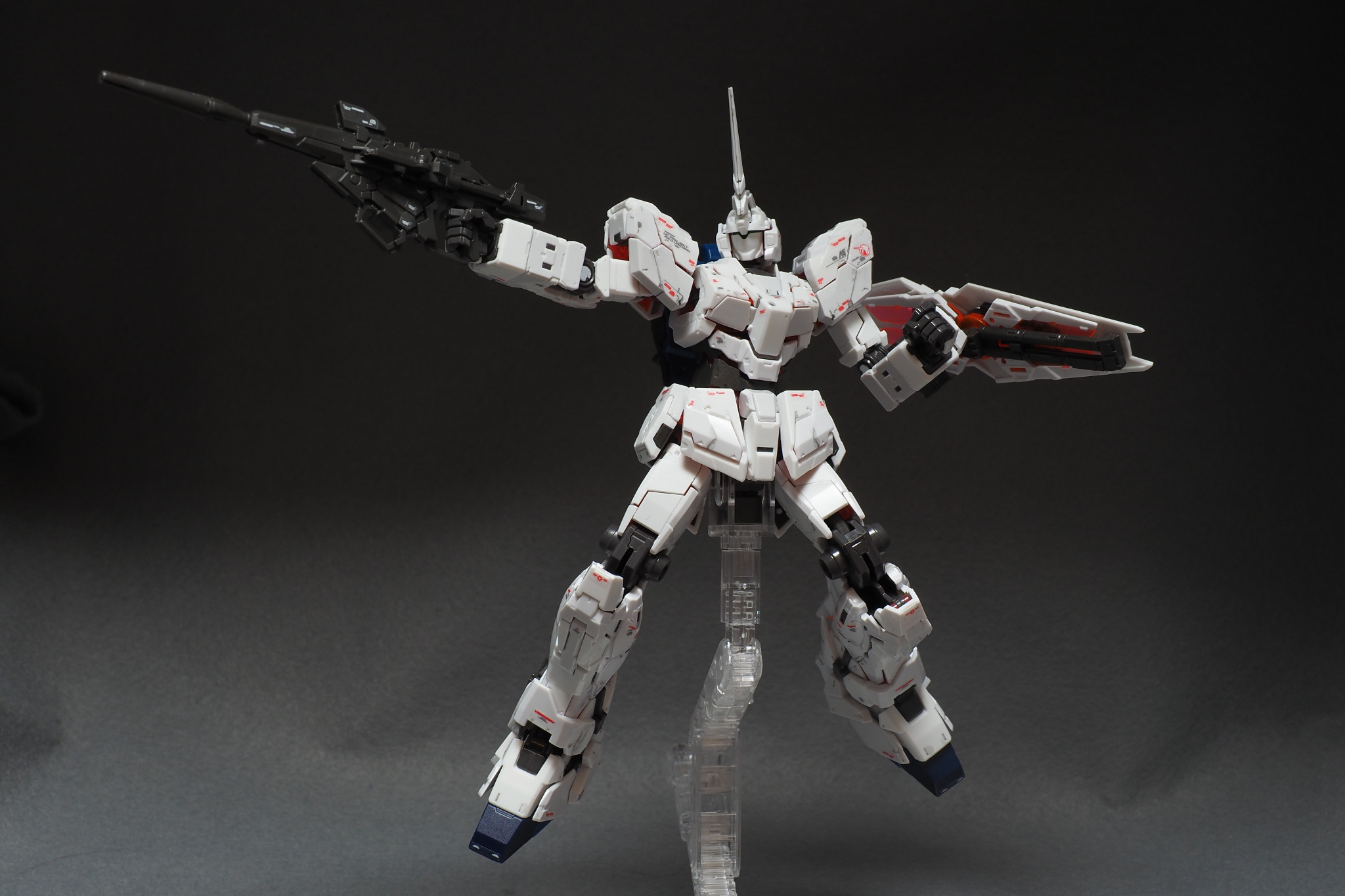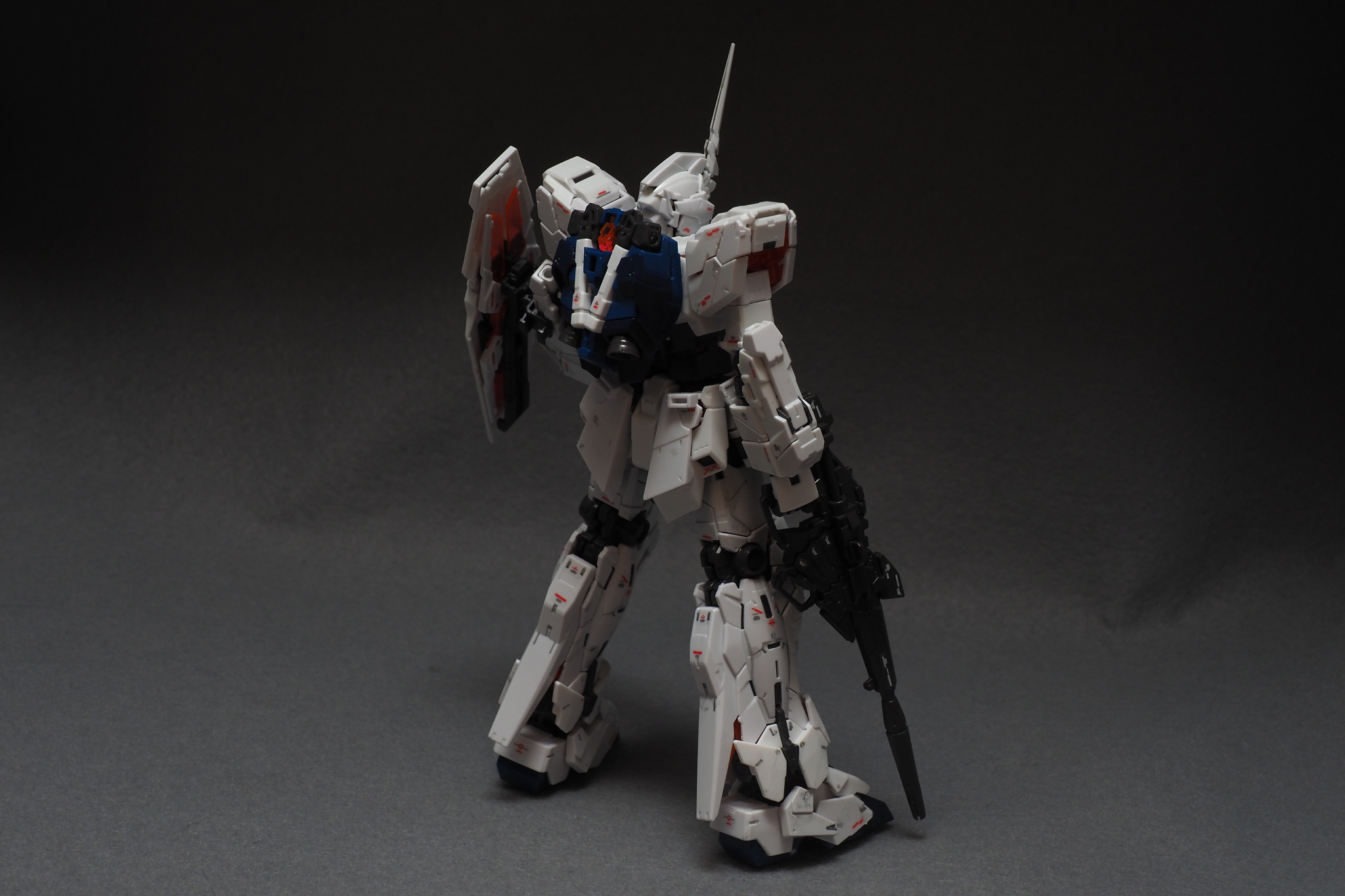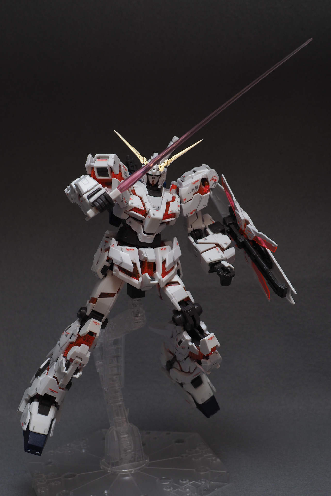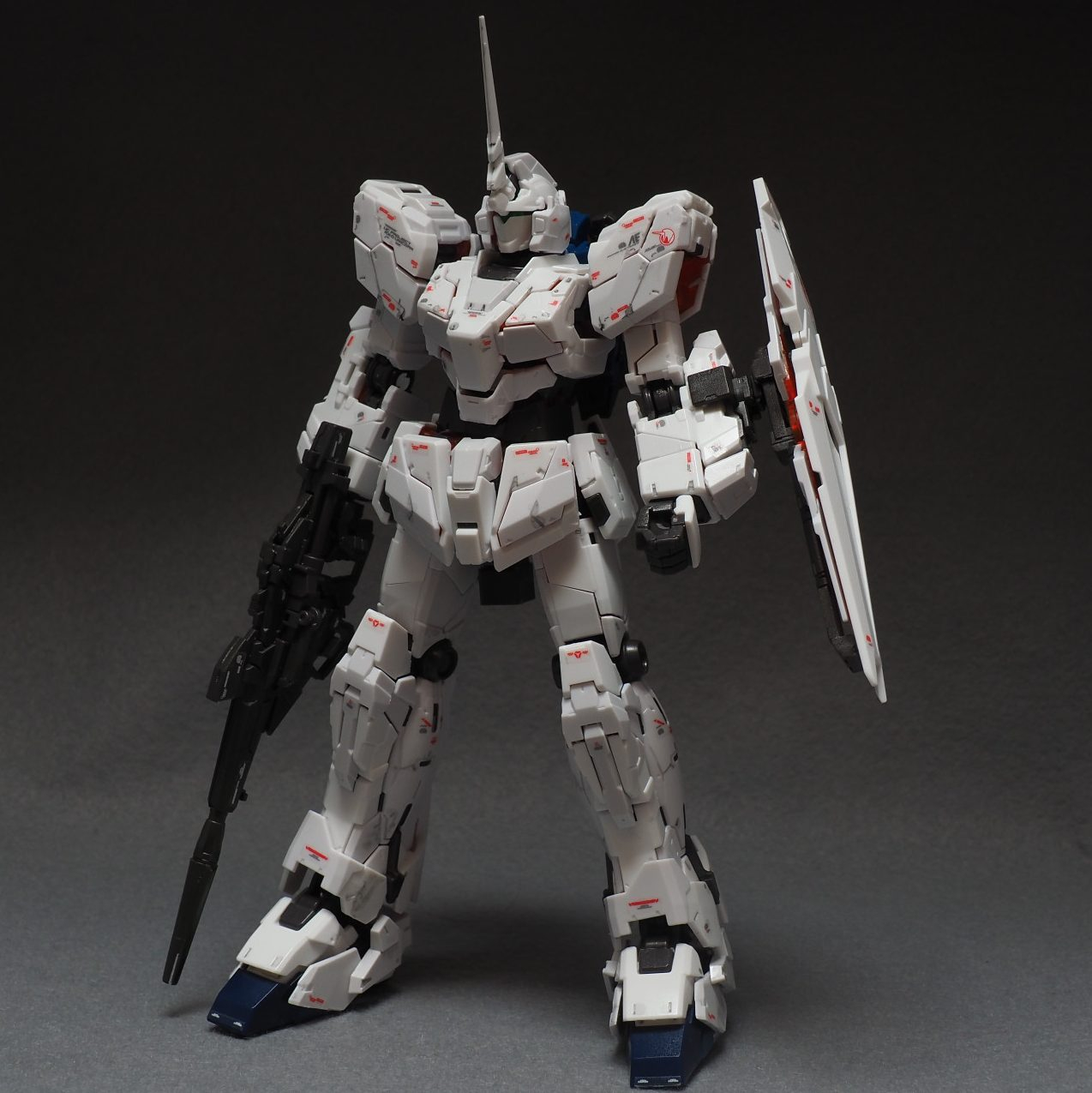 RGユニコーンガンダムです。仕上げは光沢トップコートと若干の墨入れのみです。ガンダムシリーズで一番好きな機体です。アニメで初めてみたときはなんだこの真っ白なガンダムは!!!!!と興奮しました。シナンジュと同じくユニコーンガンダムも自分の中ではキラキラした機体のイメージがあり、ウェザリングはしっくりこないので光沢仕上げにしました。