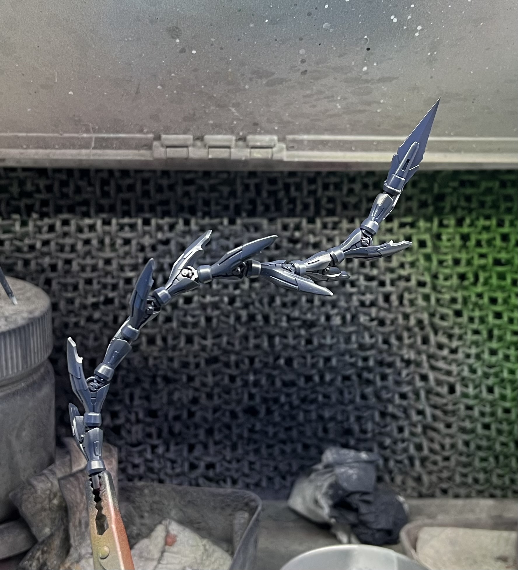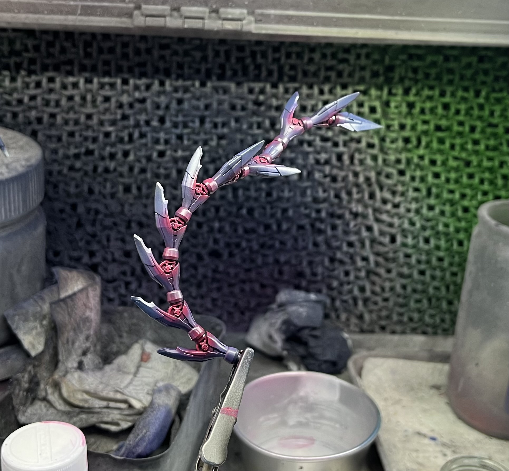 - メインの青黒い色をベタ塗りしました。ロールをくねくねさせながら塗りムラがないように塗装しました,棘の裏側みたいな所もしっかり,関節?みたいな上下動く所はほぼ固定で動かしてません