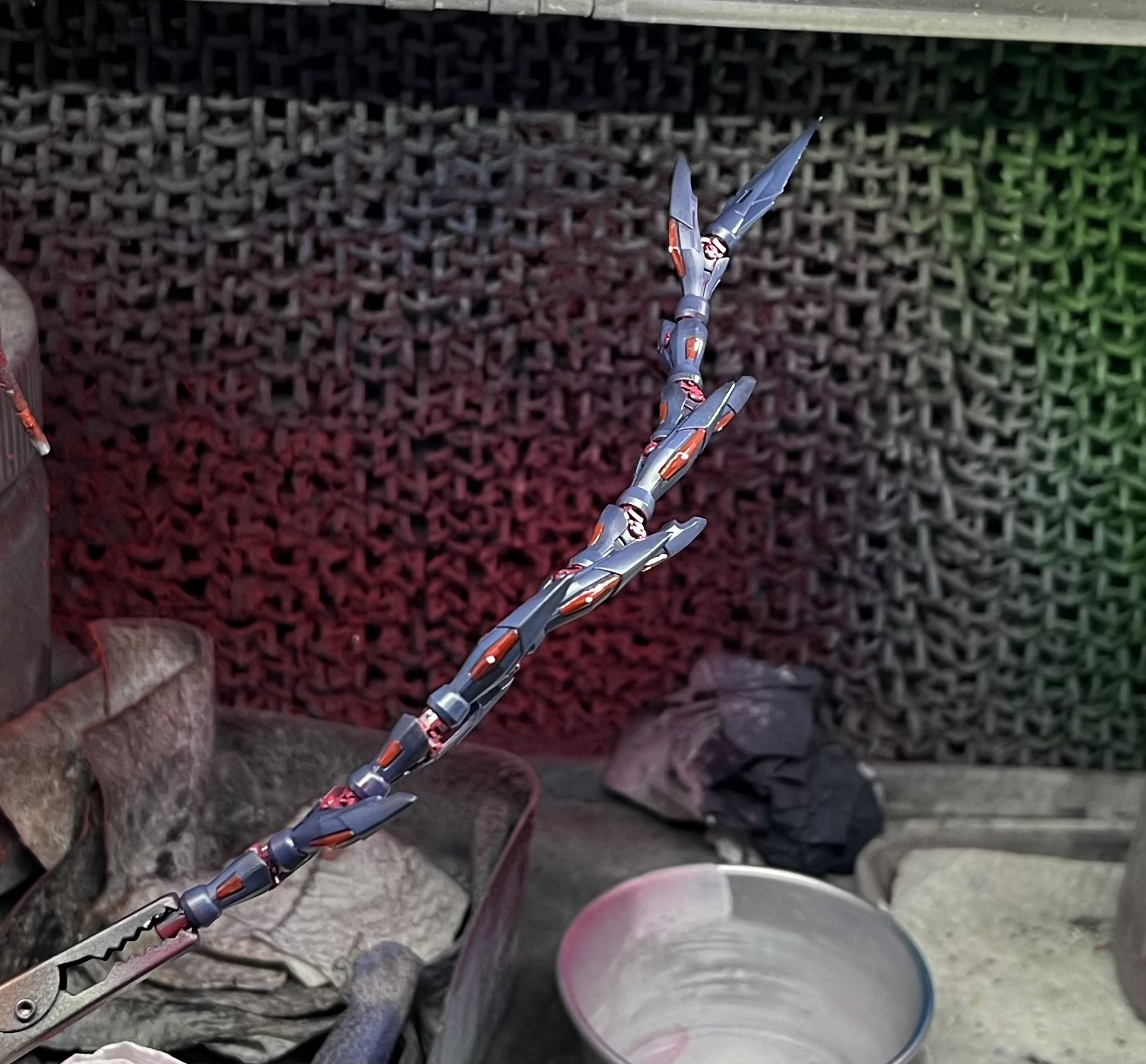 - 残りの部分塗装です。この細長い赤色の部分ですね,ここはエナメル塗料で塗ってあります。最後に塗った赤いパーツの真ん中に白色をちょんと乗せてあります。なにこれ?って感じだと思うんですけどハイライトですね,めっちゃ適当なんですけど,この一点があると情報量が増えて視線がそっちにいって全体的に雑な部分がバレにくくなります,って言う作戦です。